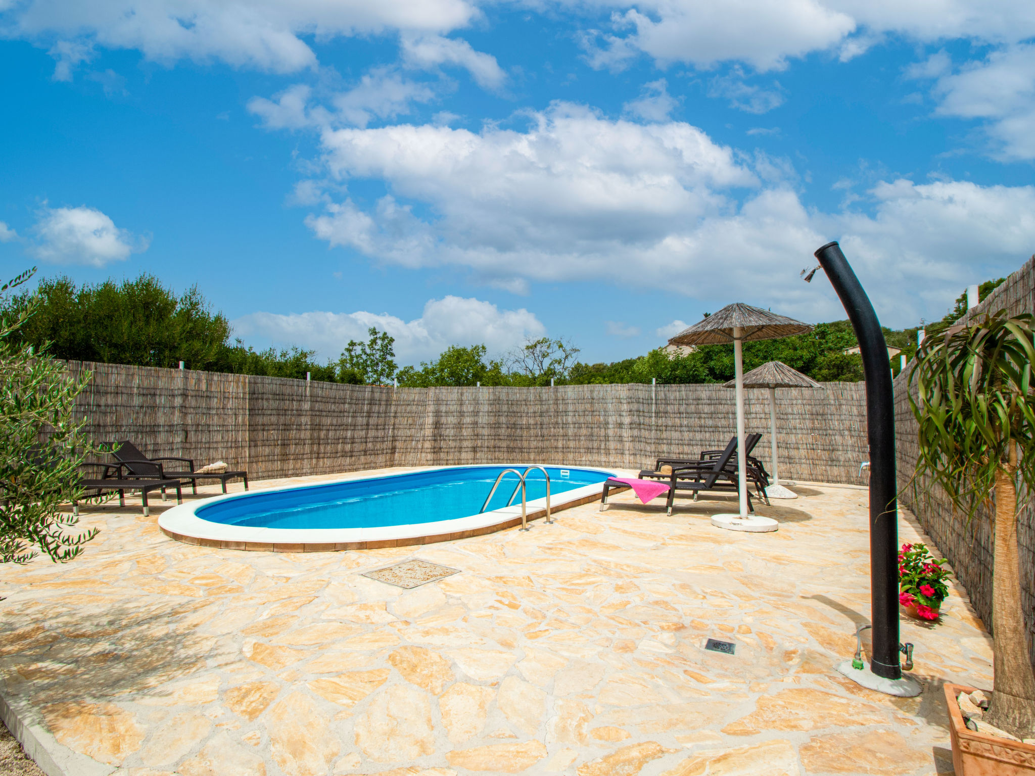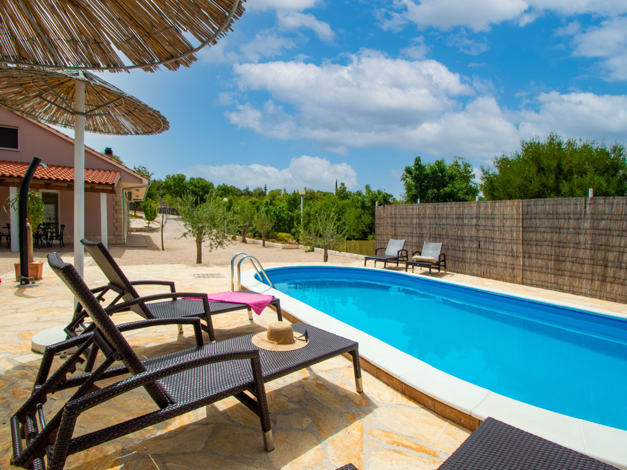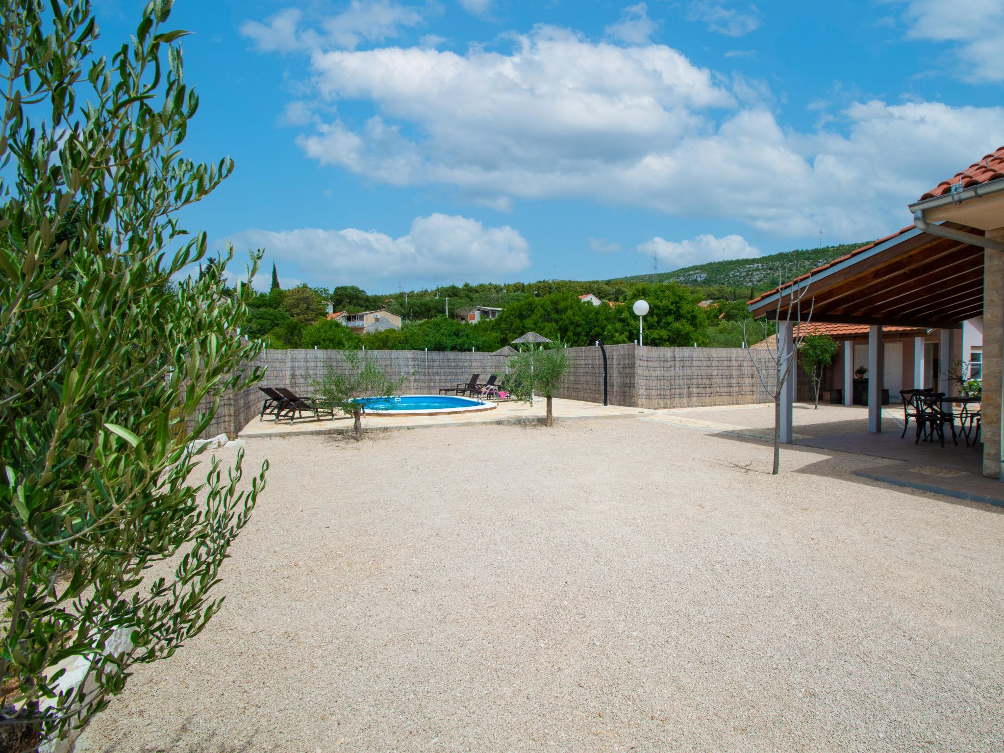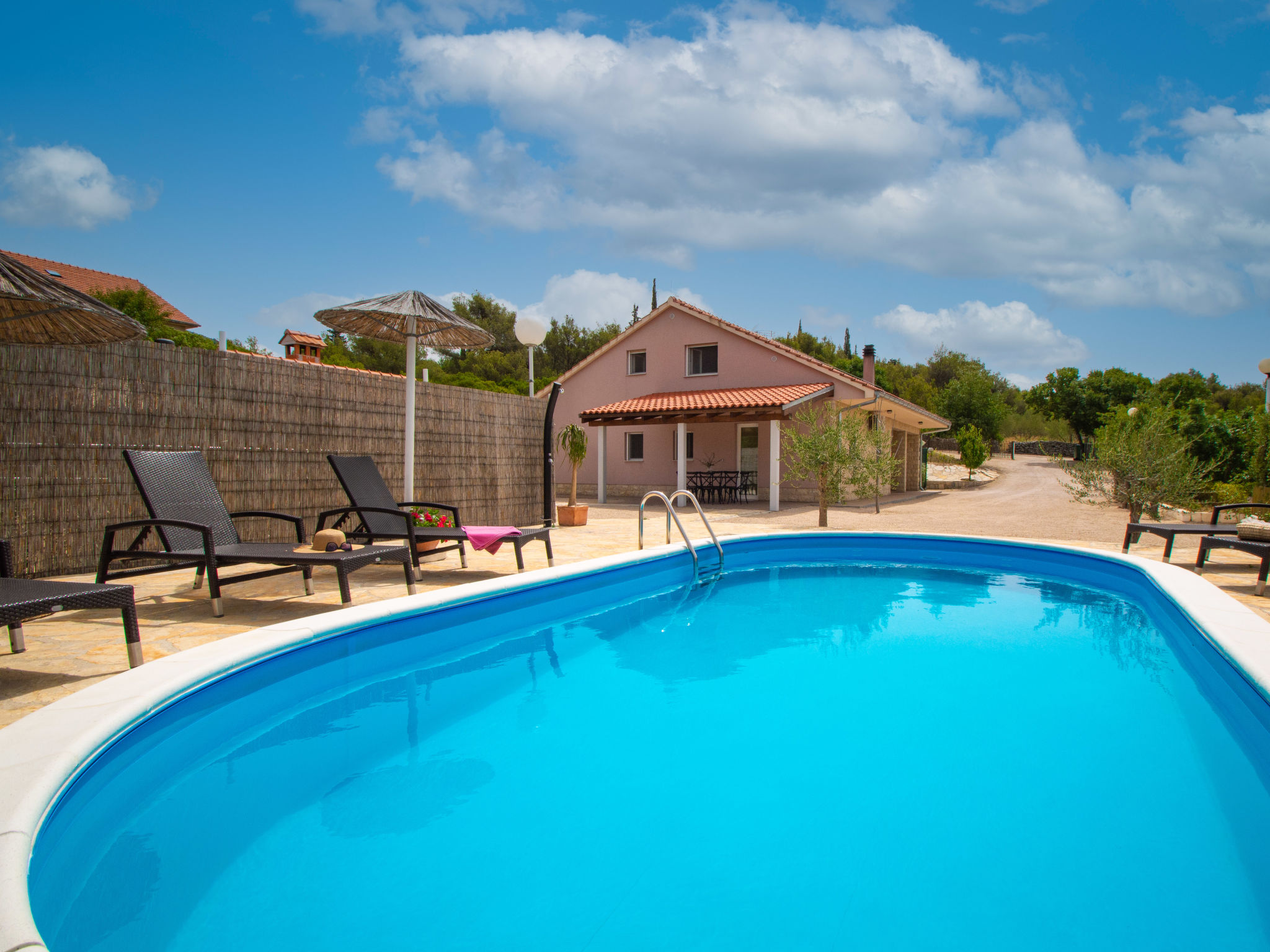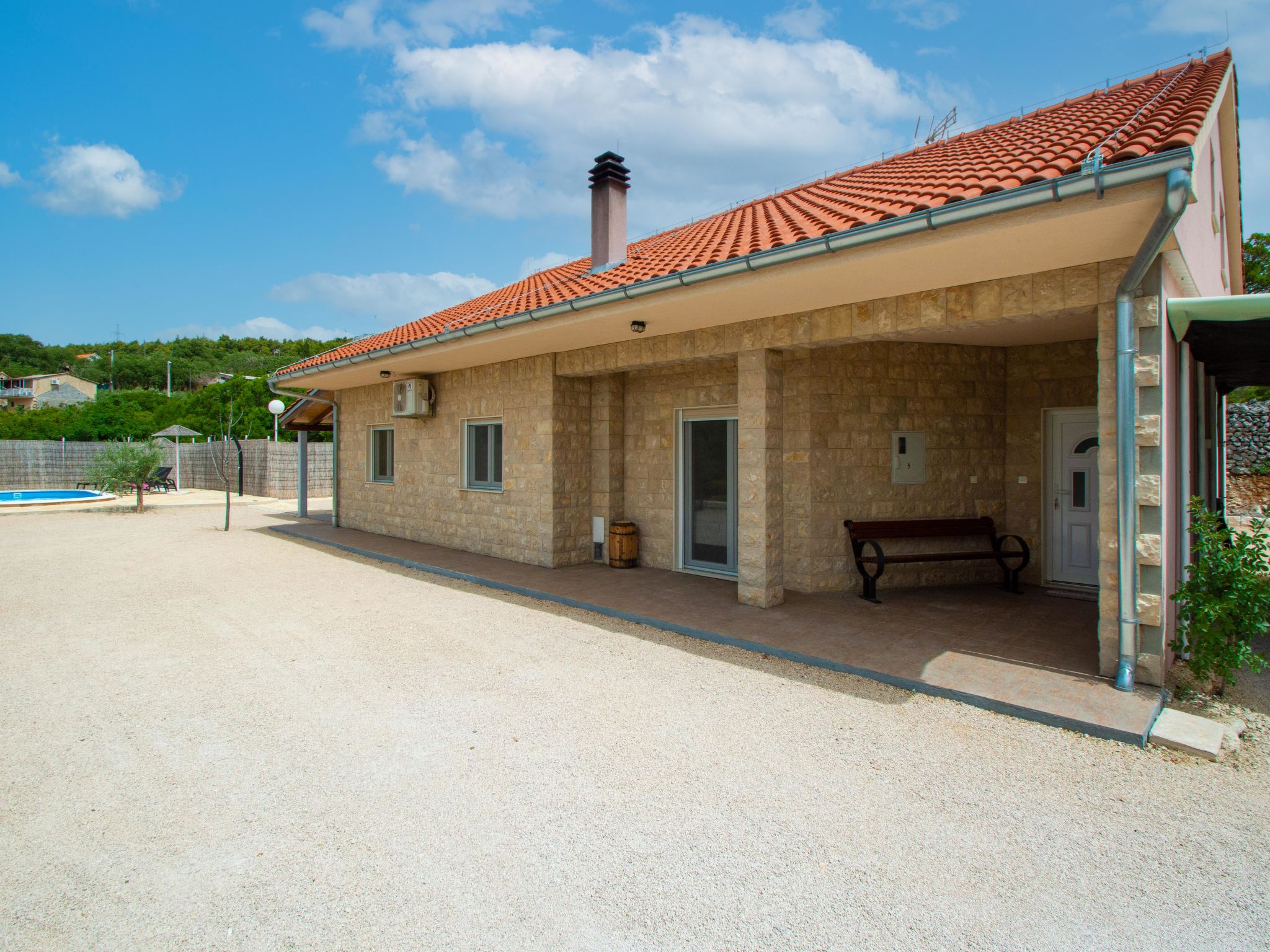 4-Zimmer-Haus 160 m2, Südlage. Wohn-/Esszimmer 35 m2 mit Sat-TV (Flachbildschirm), Klimaanlage. Ausgang zur Terrasse. 1 Zimmer mit 1 franz. Bett (160 cm, Länge 200 cm), Sat-TV (Flachbildschirm). 1 Zimmer mit 1 franz. Bett (160 cm, Länge 200 cm), TV (Flachbildschirm). 1 Zimmer mit begehbarer Kleiderschrank mit 1 Bett (80 cm, Länge 190 cm), 1 franz. Bett (180 cm, Länge 200 cm). Küche (Backofen, Geschirrspüler, 4 Glaskeramikherd Platten, Wasserkocher, Mikrowelle, Tiefkühler, elektrische Kaffeemaschine). Ausgang zur Terrasse. Bad/WC, sep. WC. Terrasse 10 m2, überdacht, Terrasse 15 m2, überdacht. Terrassenmöbel, Liegestühle (6). Sicht auf das Schwimmbad. Zur Verfügung: Bügeleisen, Kinderhochstuhl, Babybett, Haartrockner. Internet (Wireless LAN, gratis).