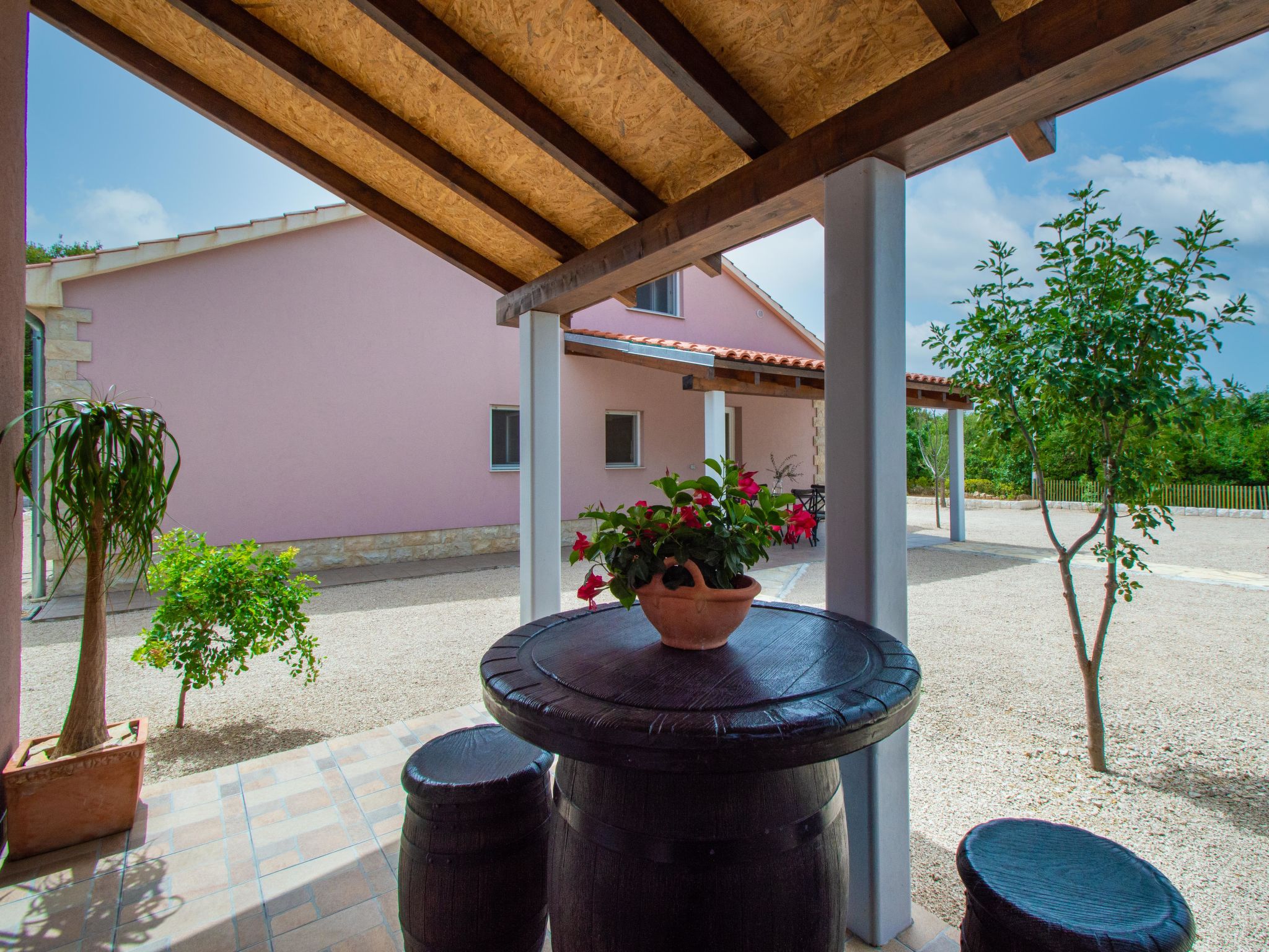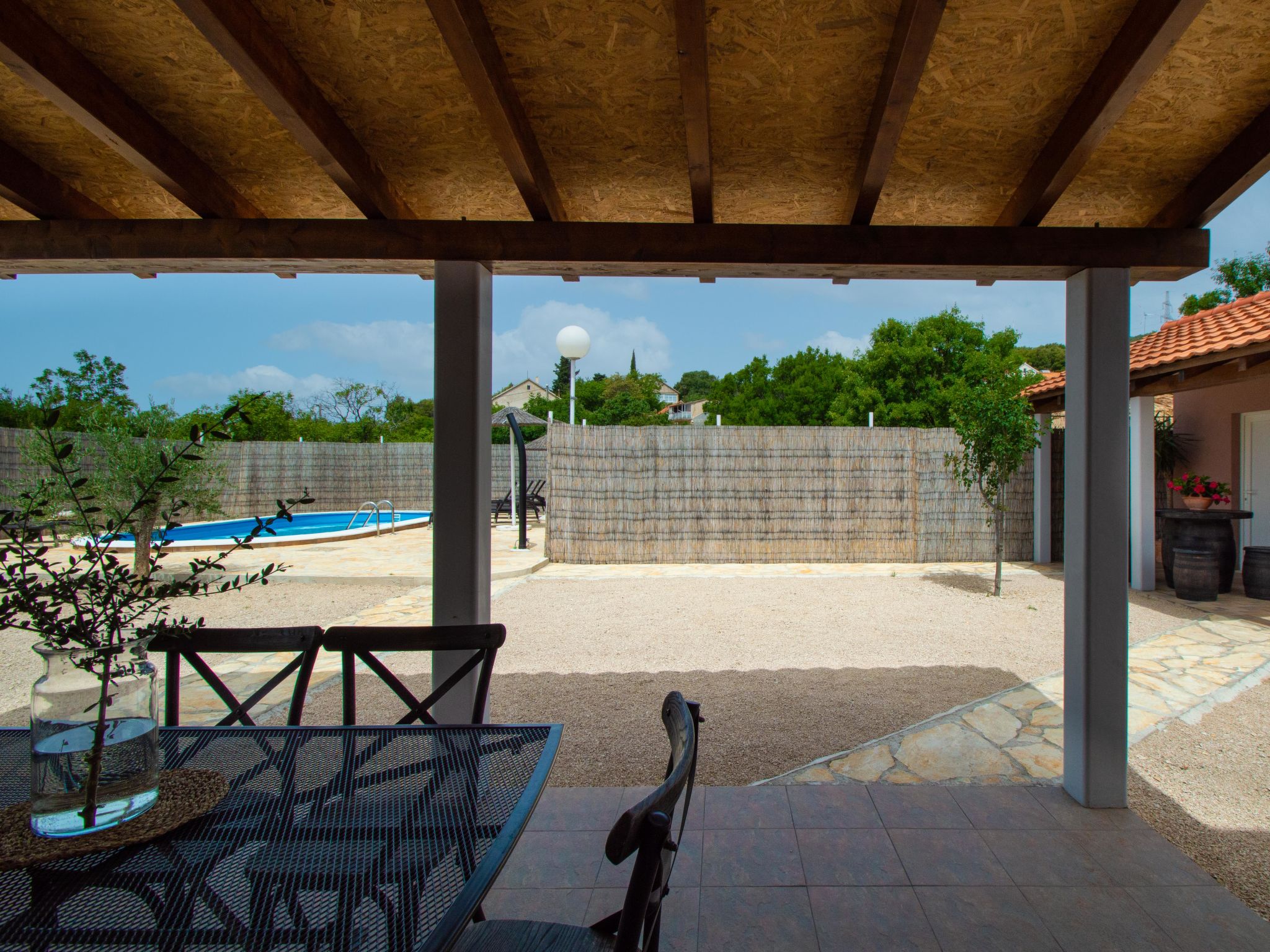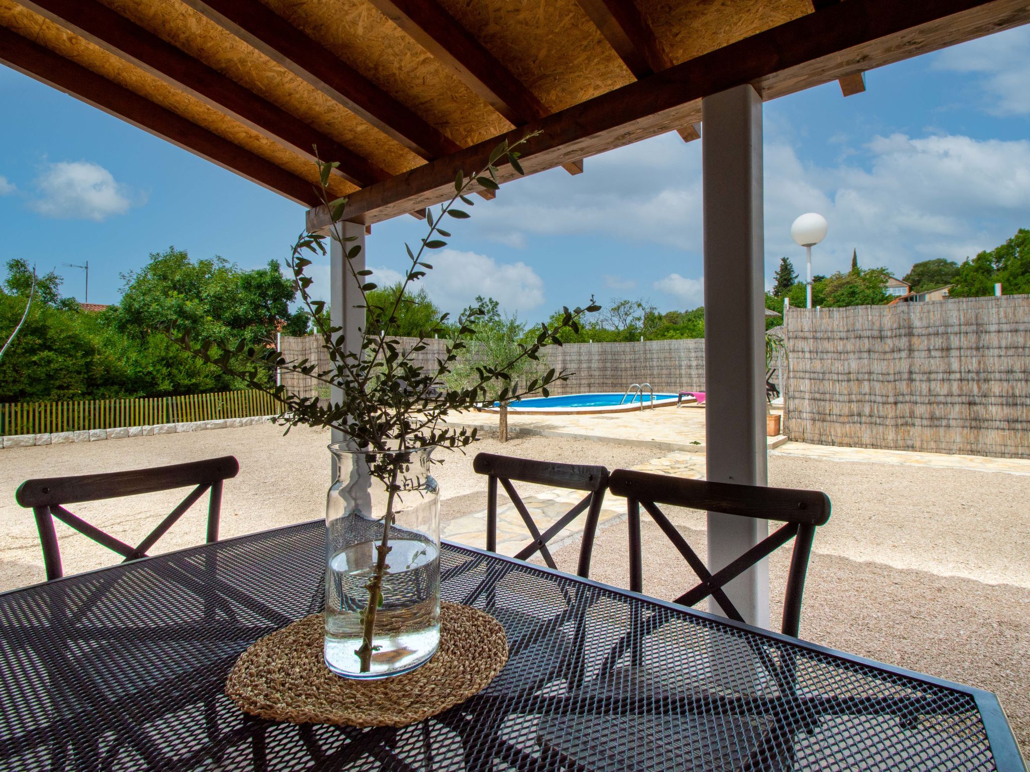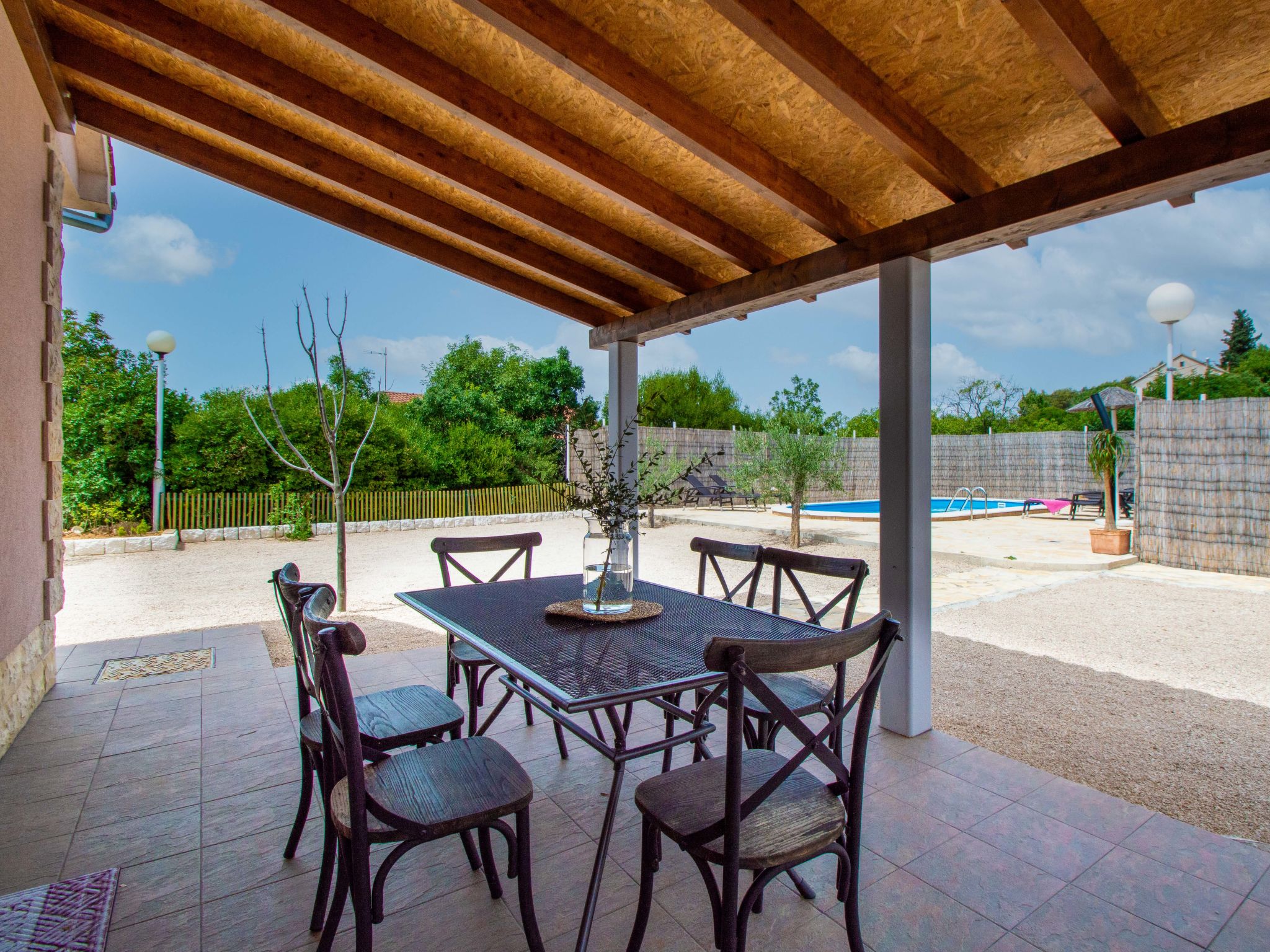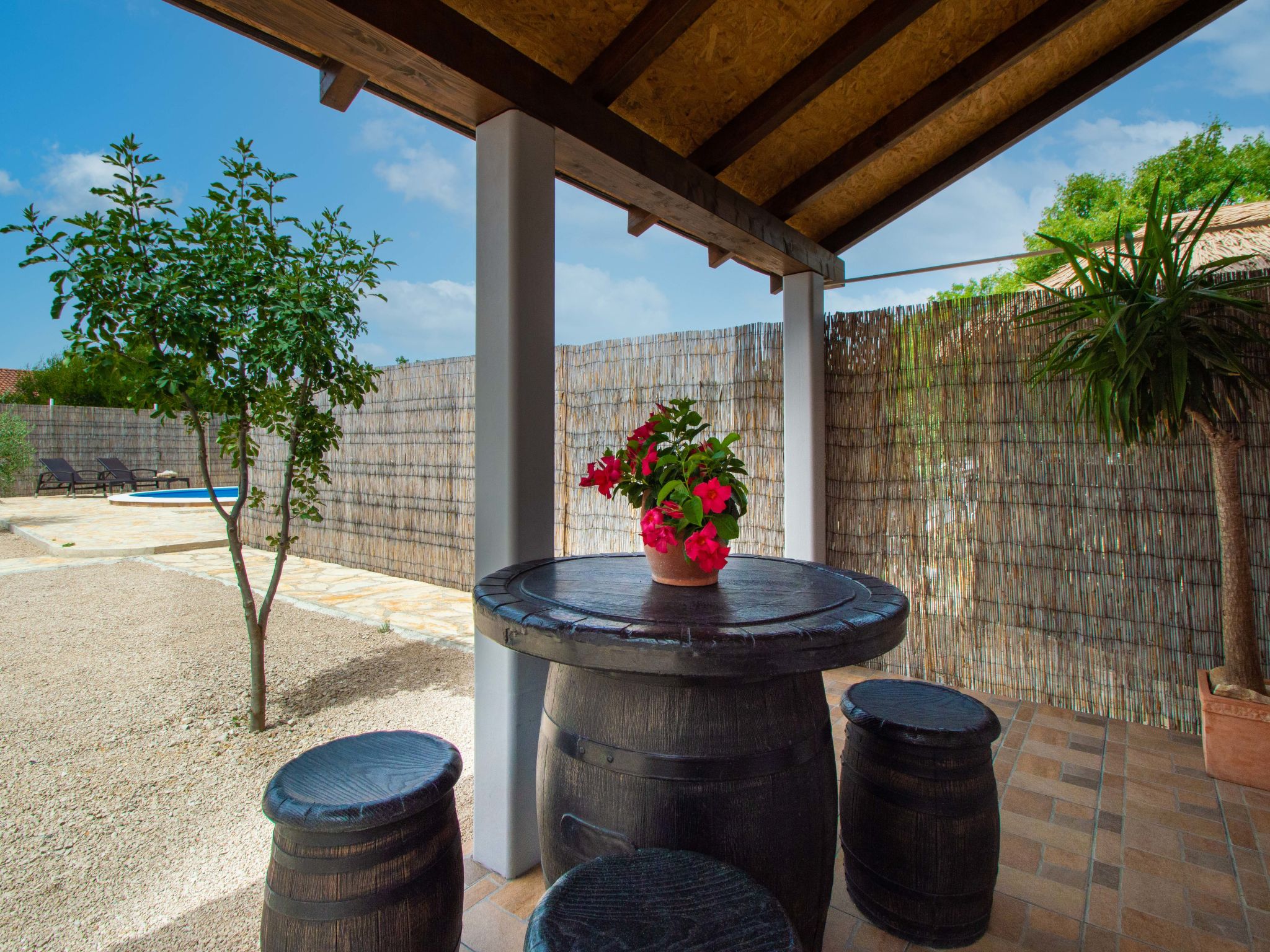 4-Zimmer-Haus 160 m2, Südlage. Wohn-/Esszimmer 35 m2 mit Sat-TV (Flachbildschirm), Klimaanlage. Ausgang zur Terrasse. 1 Zimmer mit 1 franz. Bett (160 cm, Länge 200 cm), Sat-TV (Flachbildschirm). 1 Zimmer mit 1 franz. Bett (160 cm, Länge 200 cm), TV (Flachbildschirm). 1 Zimmer mit begehbarer Kleiderschrank mit 1 Bett (80 cm, Länge 190 cm), 1 franz. Bett (180 cm, Länge 200 cm). Küche (Backofen, Geschirrspüler, 4 Glaskeramikherd Platten, Wasserkocher, Mikrowelle, Tiefkühler, elektrische Kaffeemaschine). Ausgang zur Terrasse. Bad/WC, sep. WC. Terrasse 10 m2, überdacht, Terrasse 15 m2, überdacht. Terrassenmöbel, Liegestühle (6). Sicht auf das Schwimmbad. Zur Verfügung: Bügeleisen, Kinderhochstuhl, Babybett, Haartrockner. Internet (Wireless LAN, gratis).