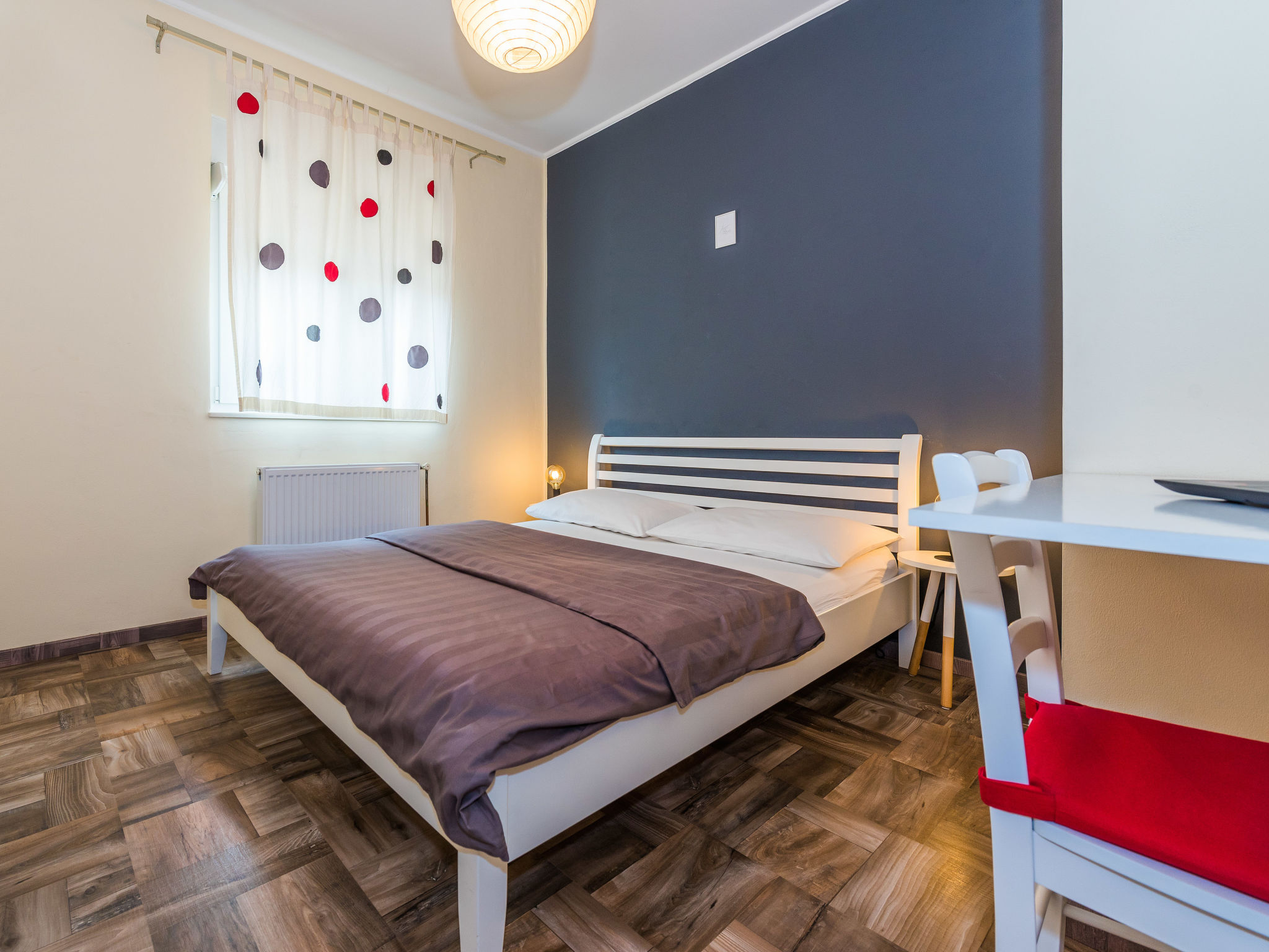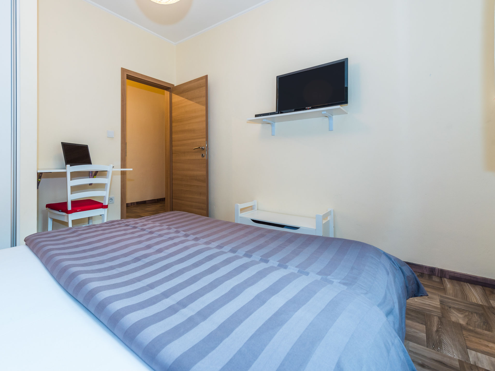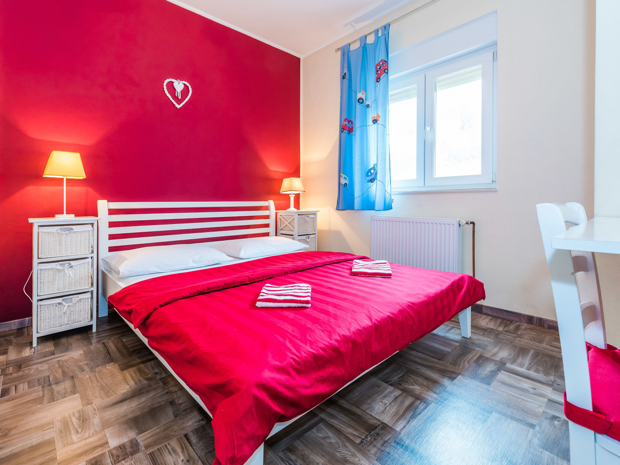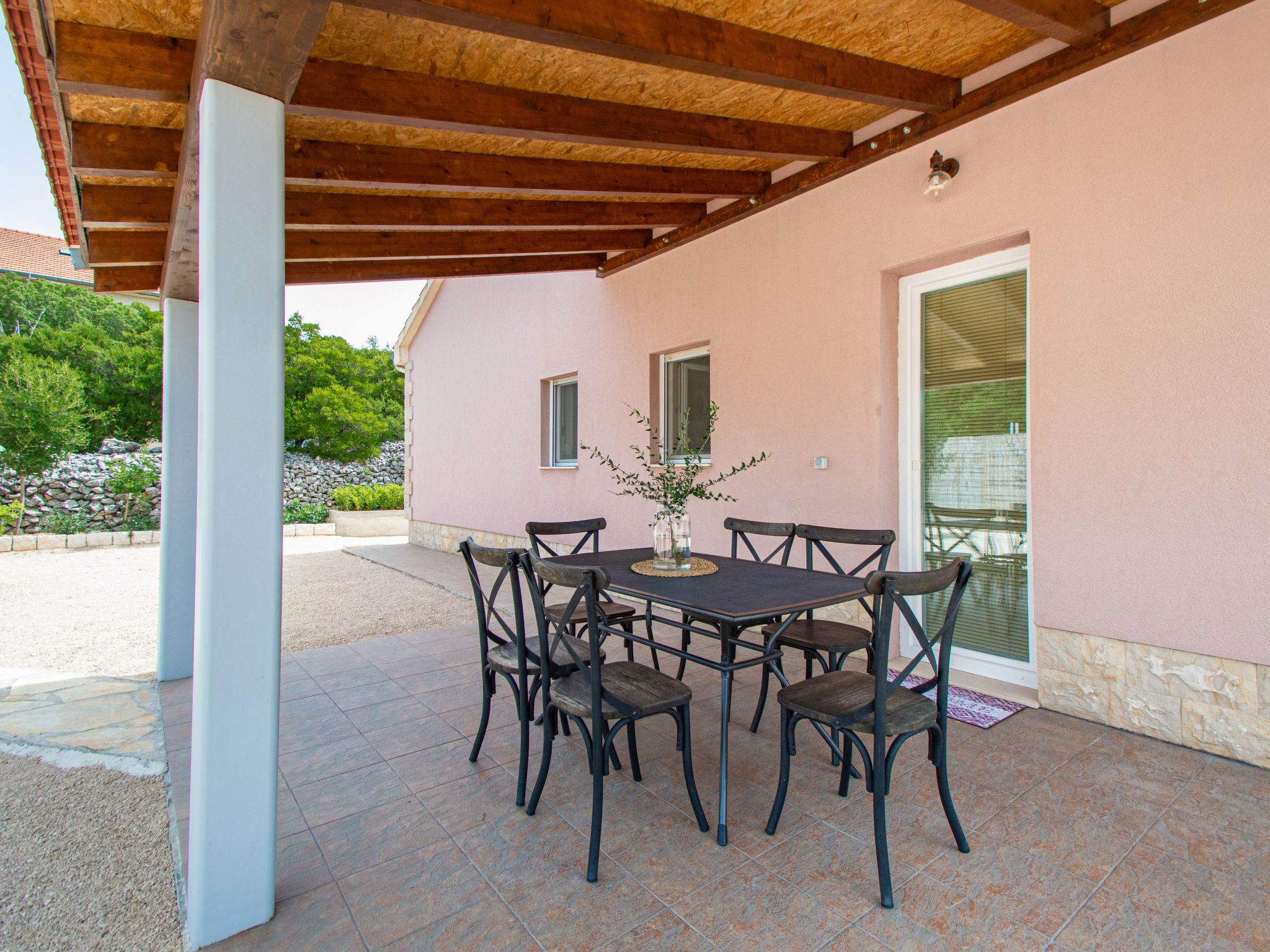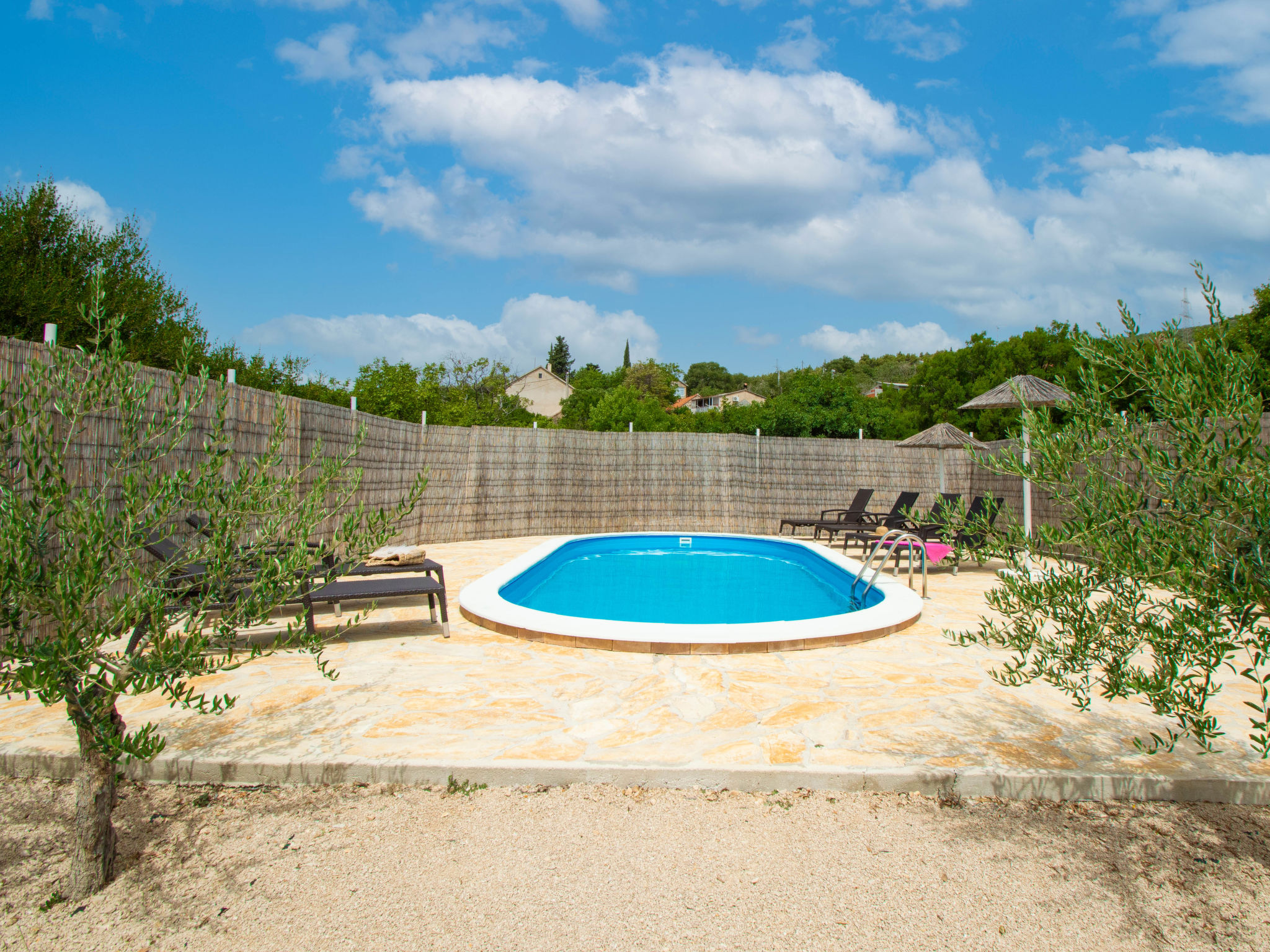 4-Zimmer-Haus 160 m2, Südlage. Wohn-/Esszimmer 35 m2 mit Sat-TV (Flachbildschirm), Klimaanlage. Ausgang zur Terrasse. 1 Zimmer mit 1 franz. Bett (160 cm, Länge 200 cm), Sat-TV (Flachbildschirm). 1 Zimmer mit 1 franz. Bett (160 cm, Länge 200 cm), TV (Flachbildschirm). 1 Zimmer mit begehbarer Kleiderschrank mit 1 Bett (80 cm, Länge 190 cm), 1 franz. Bett (180 cm, Länge 200 cm). Küche (Backofen, Geschirrspüler, 4 Glaskeramikherd Platten, Wasserkocher, Mikrowelle, Tiefkühler, elektrische Kaffeemaschine). Ausgang zur Terrasse. Bad/WC, sep. WC. Terrasse 10 m2, überdacht, Terrasse 15 m2, überdacht. Terrassenmöbel, Liegestühle (6). Sicht auf das Schwimmbad. Zur Verfügung: Bügeleisen, Kinderhochstuhl, Babybett, Haartrockner. Internet (Wireless LAN, gratis).
