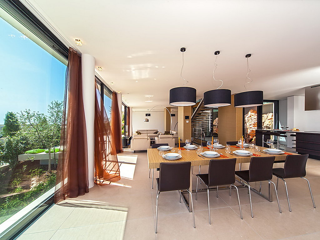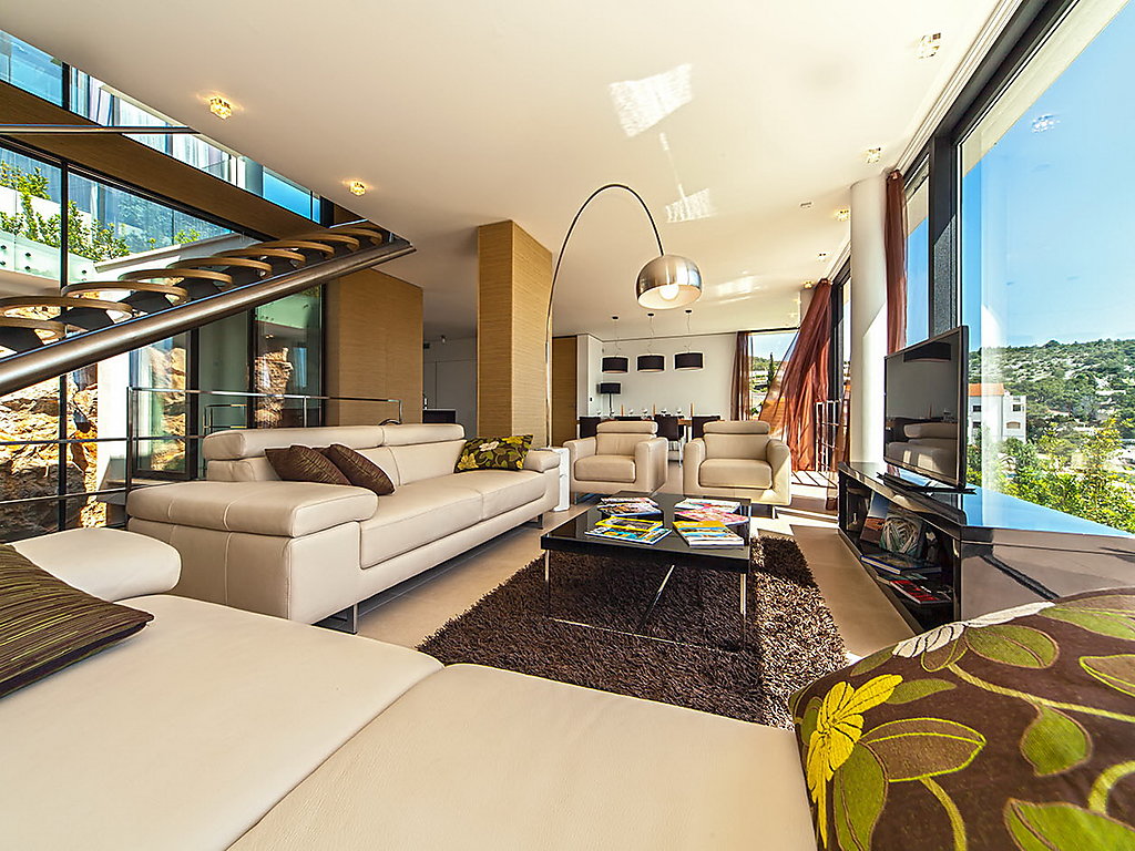 4-Zimmer-Villa 320 m2 auf 3 Stockwerken. Geräumig, sehr komfortabel und modern eingerichtet: grosses Wohn-/Esszimmer mit Panoramafenster mit Sat-TV (Flachbildschirm). Ausgang zur Terrasse. Offene Küche (Backofen, Geschirrspüler, 4 Glaskeramikherd Platten, Mikrowelle, Tiefkühler). Ausgang zur Terrasse. Sep. WC. Obergeschoss: 1 Zimmer mit 1 Doppelbett (2 x 90 cm, Länge 200 cm), Dusche/WC und Sat-TV (Flachbildschirm). Ausgang zur Loggia. 1 Zimmer mit Panoramafenster mit 1 Doppelbett (2 x 90 cm, Länge 200 cm), Dusche/WC und Sat-TV (Flachbildschirm). Ausgang zur Loggia. 1 Zimmer mit Panoramafenster mit 2 Betten (90 cm, Länge 200 cm), Dusche/WC und Sat-TV (Flachbildschirm). Ausgang zur Loggia. Warmluftheizung. Terrasse 35 m2, Terrasse 15 m2. Terrassenmöbel, Liegestühle, Abstellkammer. Herrliche Sicht auf das Meer. Zur Verfügung: Internet (Wireless LAN, gratis). 1 Haustier/Hund erlaubt.