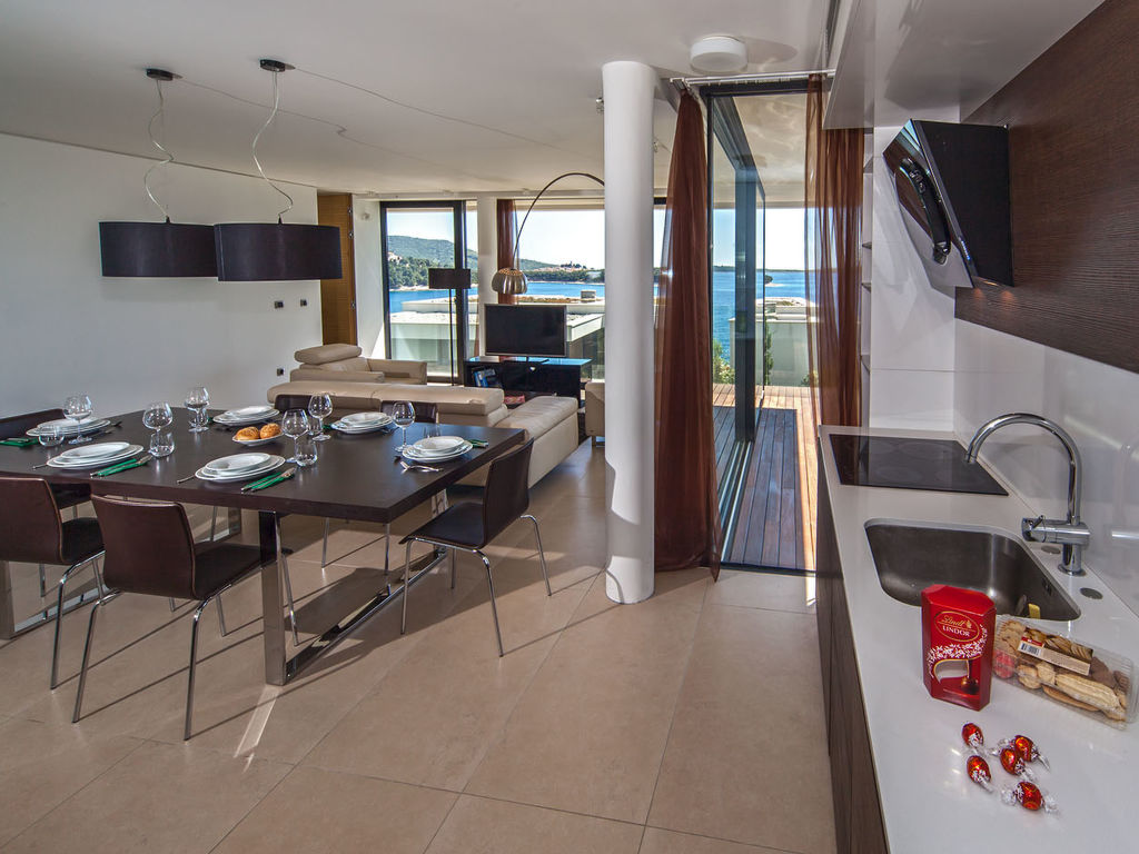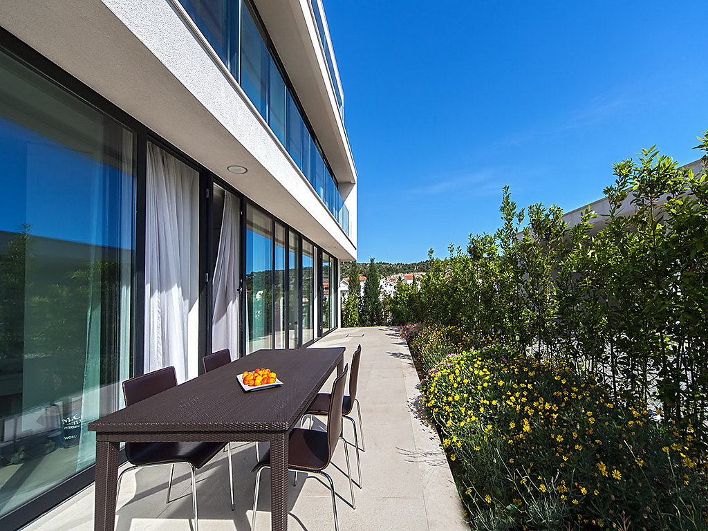 3-Zimmer-Wohnung 115 m2 auf 2 Stockwerken, im Erdgeschoss. Komfortabel und modern eingerichtet: Wohn-/Esszimmer mit Sat-TV (Flachbildschirm). Ausgang zum Balkon. Offene Küche (Backofen, Geschirrspüler, 4 Glaskeramikherd Platten, Tiefkühler). Sep. WC. Unteres Geschoss: 1 Zimmer mit 2 Betten. 1 Doppelzimmer. Ausgang zur Terrasse. Dusche/WC. Warmluftheizung. Balkon 5 m2, Terrasse 10 m2 teilweise überdacht, Terrasse 20 m2. Terrassenmöbel. Schöne Sicht auf das Meer. Zur Verfügung: Internet (Wireless LAN, gratis). 1 Haustier/Hund erlaubt. Diese Ferienwohnung befindet sich auf dem gleichen Grundstück mit den 5-Sterne-Villen HR4600.203-207.