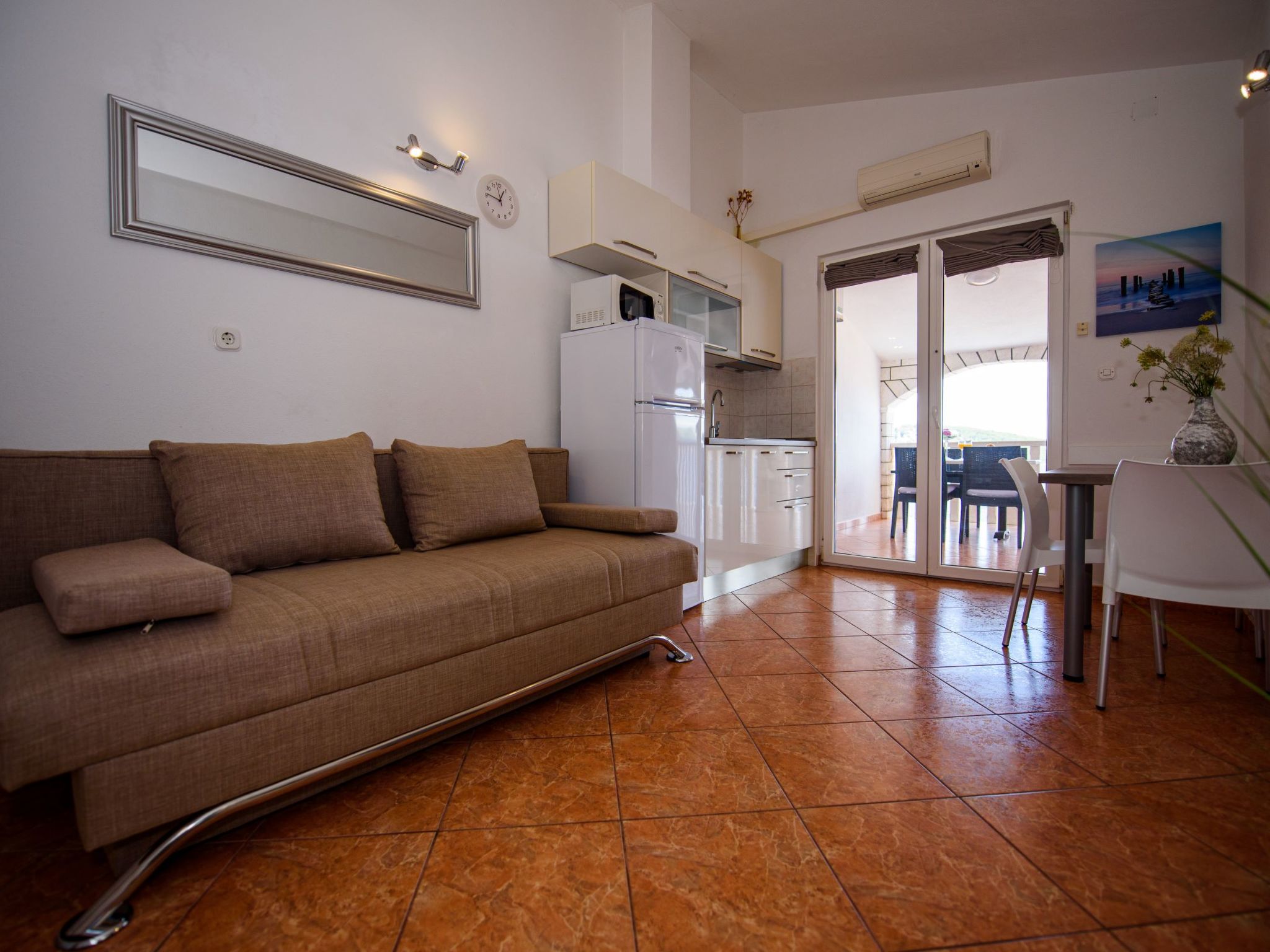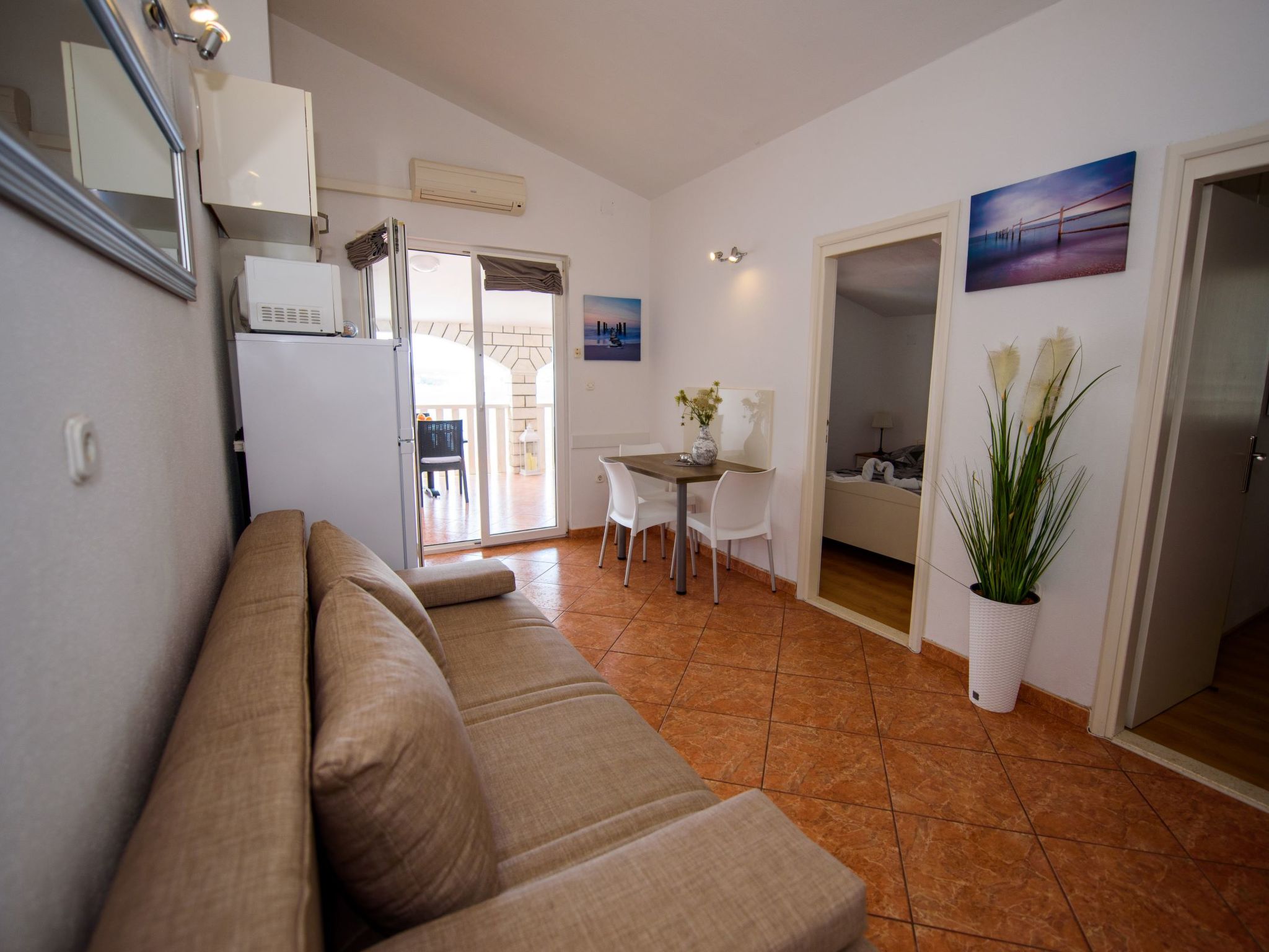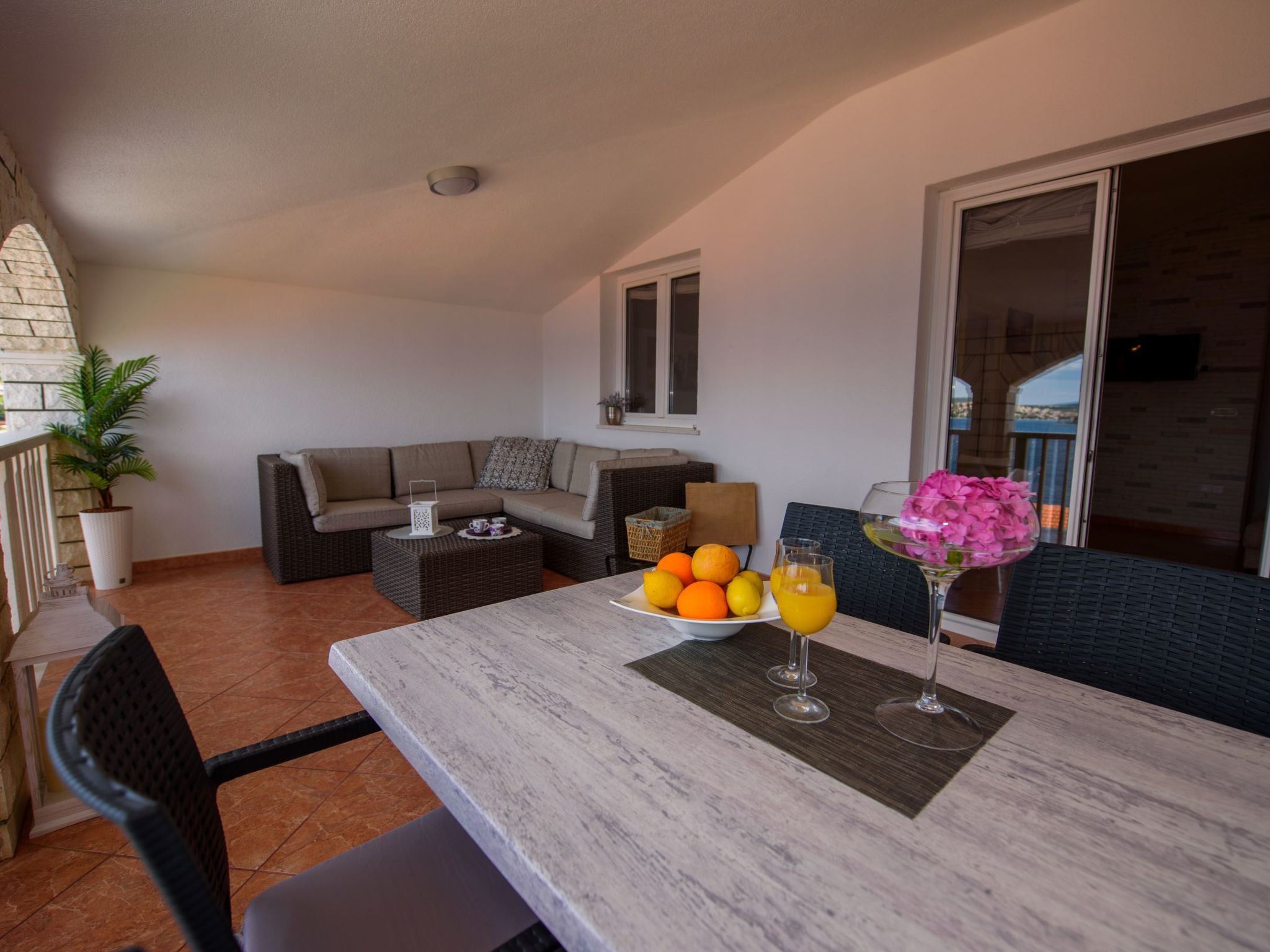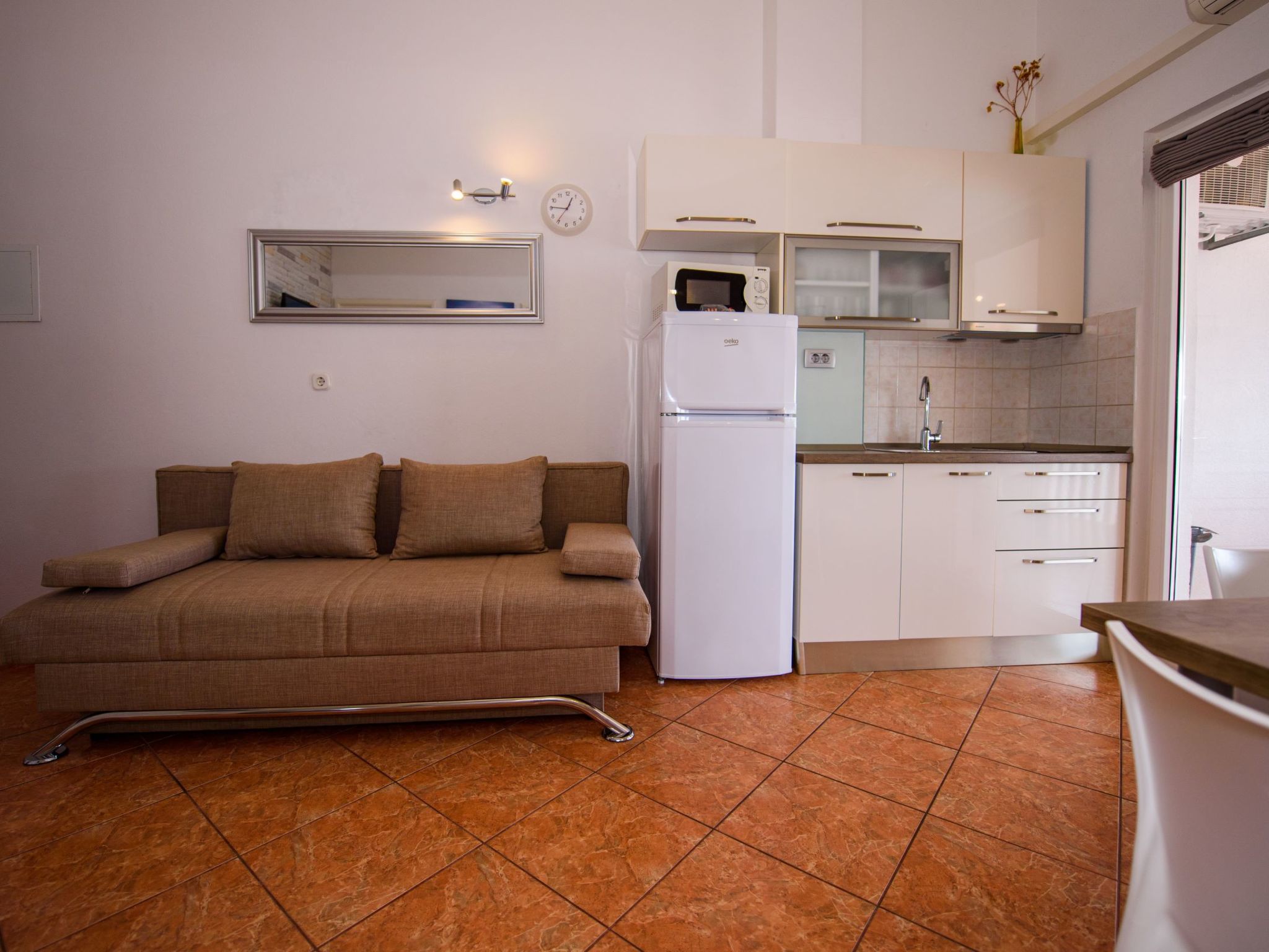 3-Zimmer-Wohnung 45 m2, im Dachgeschoss. Teilweise abgeschrägt, schön und geschmackvoll eingerichtet: Wohn-/Esszimmer mit Sat-TV (Flachbildschirm), Klimaanlage. Ausgang zur Terrasse. 2 Zimmer, jedes Zimmer mit 1 Doppelbett (2 x 80 cm, Länge 200 cm). Offene Küche (2 Glaskeramikherd Platten, Mikrowelle, Tiefkühler, elektrische Kaffeemaschine). Dusche/WC. Klimaanlage (extra). Grosse Terrasse 20 m2, überdacht, Südlage. Terrassenmöbel, Liegestühle (2). Herrliche Sicht auf das Meer. Zur Verfügung: Internet (Wireless LAN, extra).