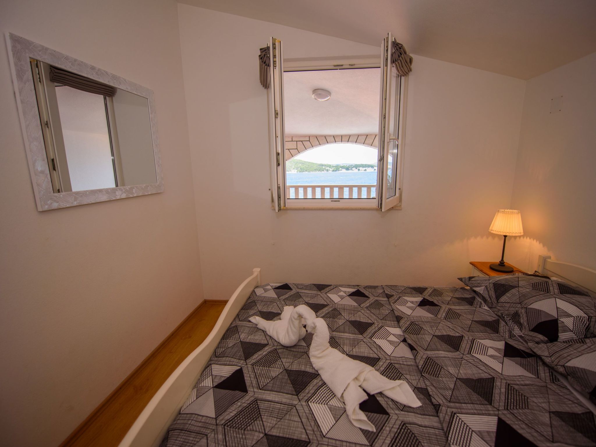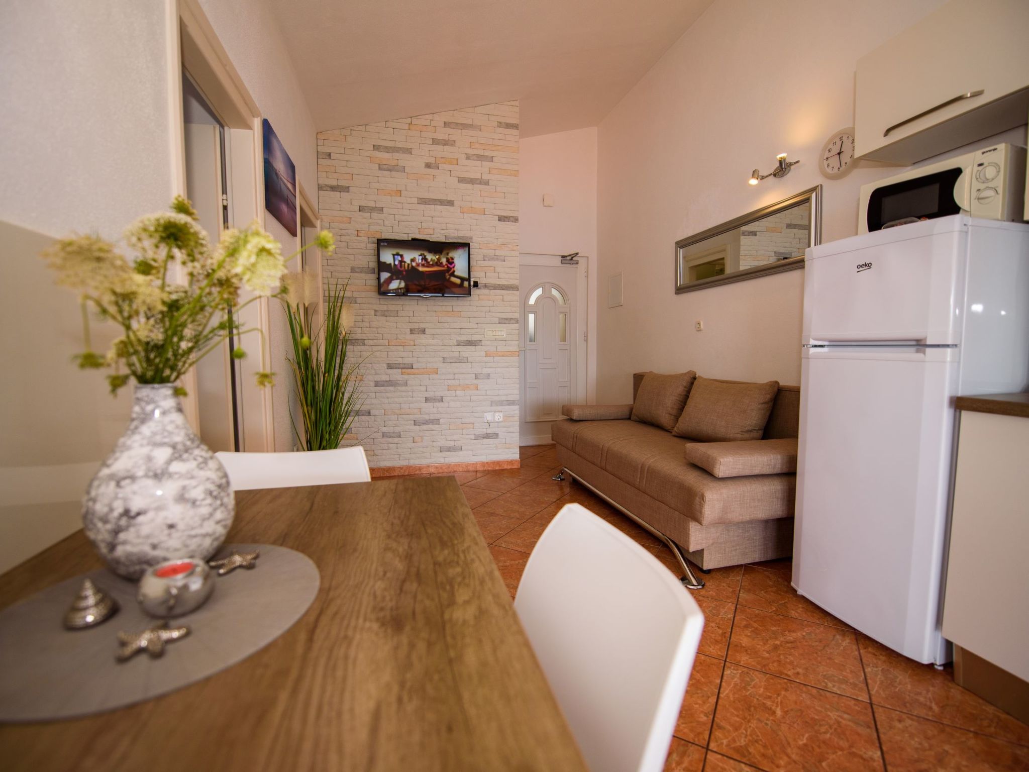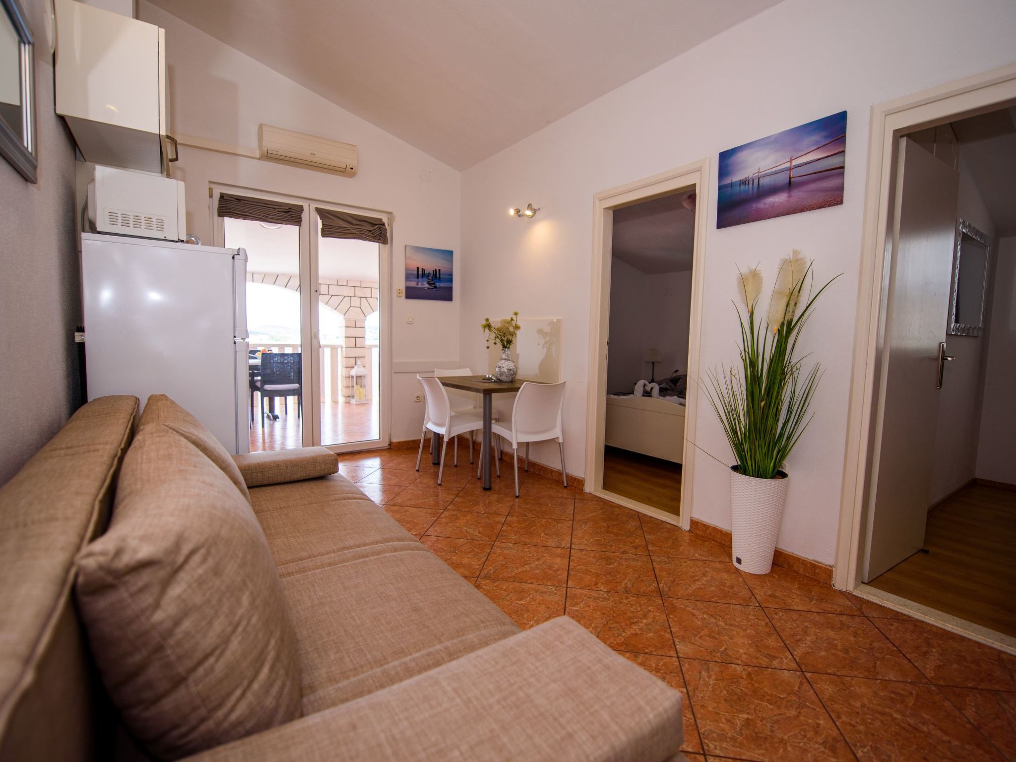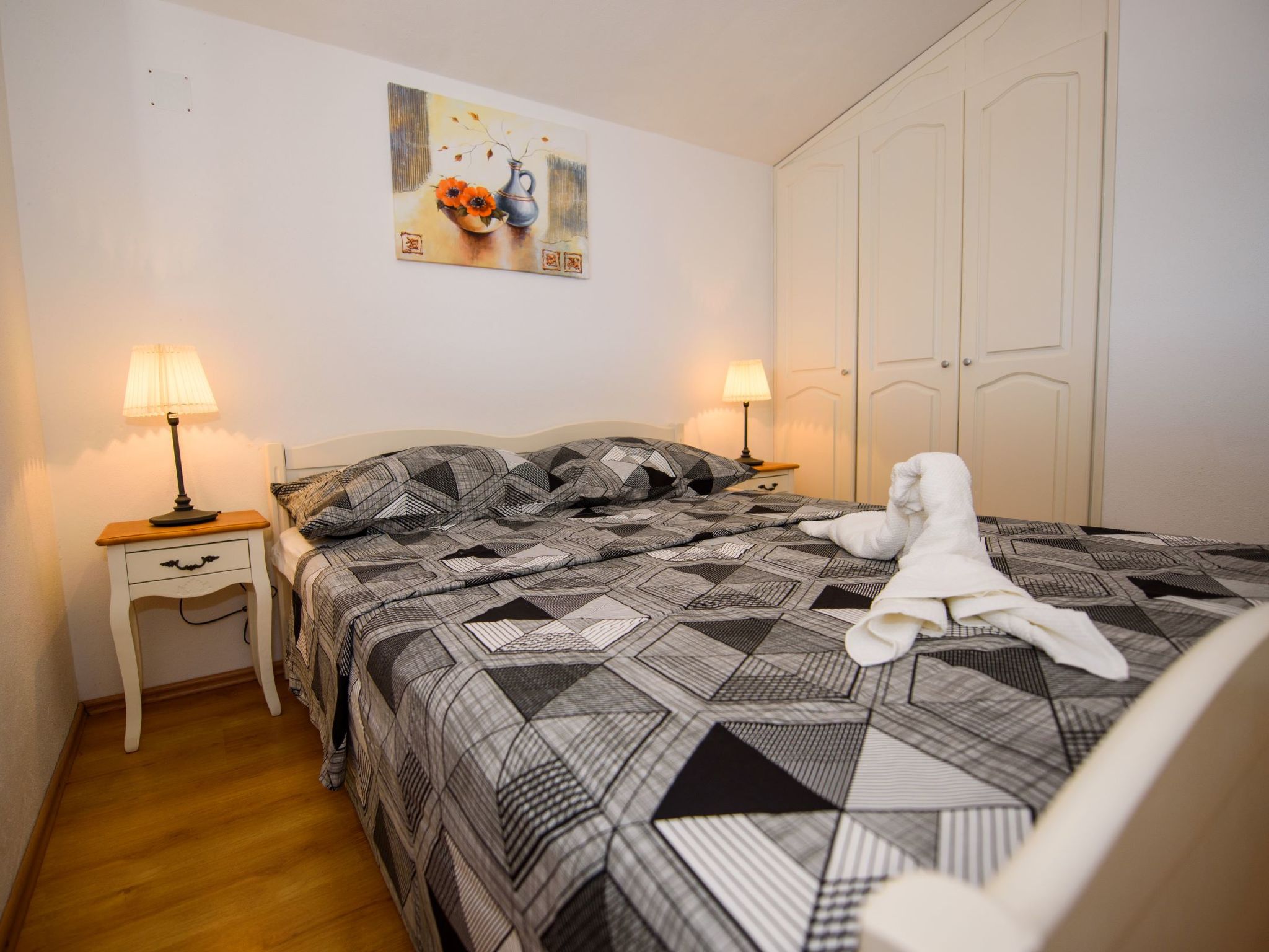 3-Zimmer-Wohnung 45 m2, im Dachgeschoss. Teilweise abgeschrägt, schön und geschmackvoll eingerichtet: Wohn-/Esszimmer mit Sat-TV (Flachbildschirm), Klimaanlage. Ausgang zur Terrasse. 2 Zimmer, jedes Zimmer mit 1 Doppelbett (2 x 80 cm, Länge 200 cm). Offene Küche (2 Glaskeramikherd Platten, Mikrowelle, Tiefkühler, elektrische Kaffeemaschine). Dusche/WC. Klimaanlage (extra). Grosse Terrasse 20 m2, überdacht, Südlage. Terrassenmöbel, Liegestühle (2). Herrliche Sicht auf das Meer. Zur Verfügung: Internet (Wireless LAN, extra).