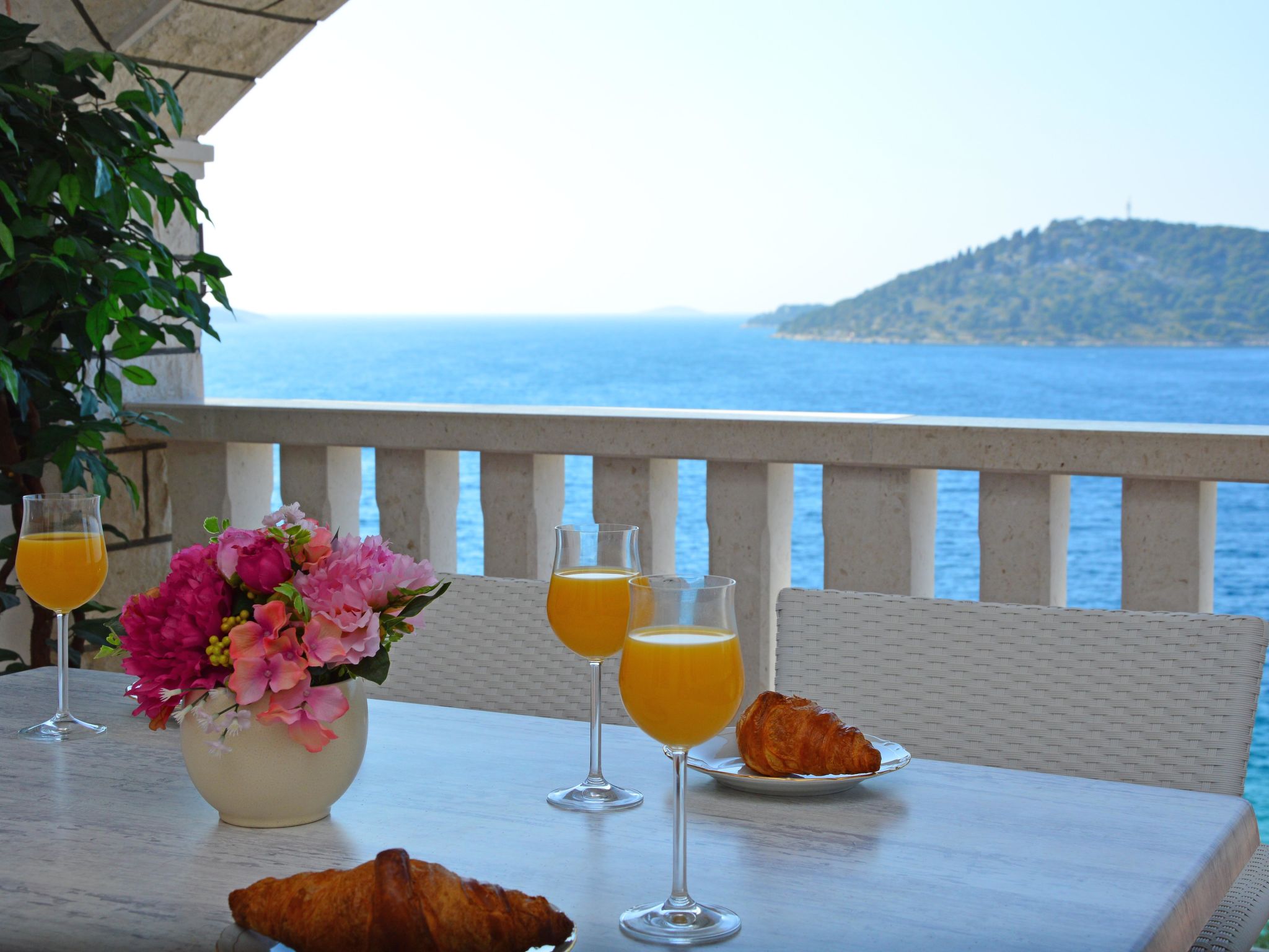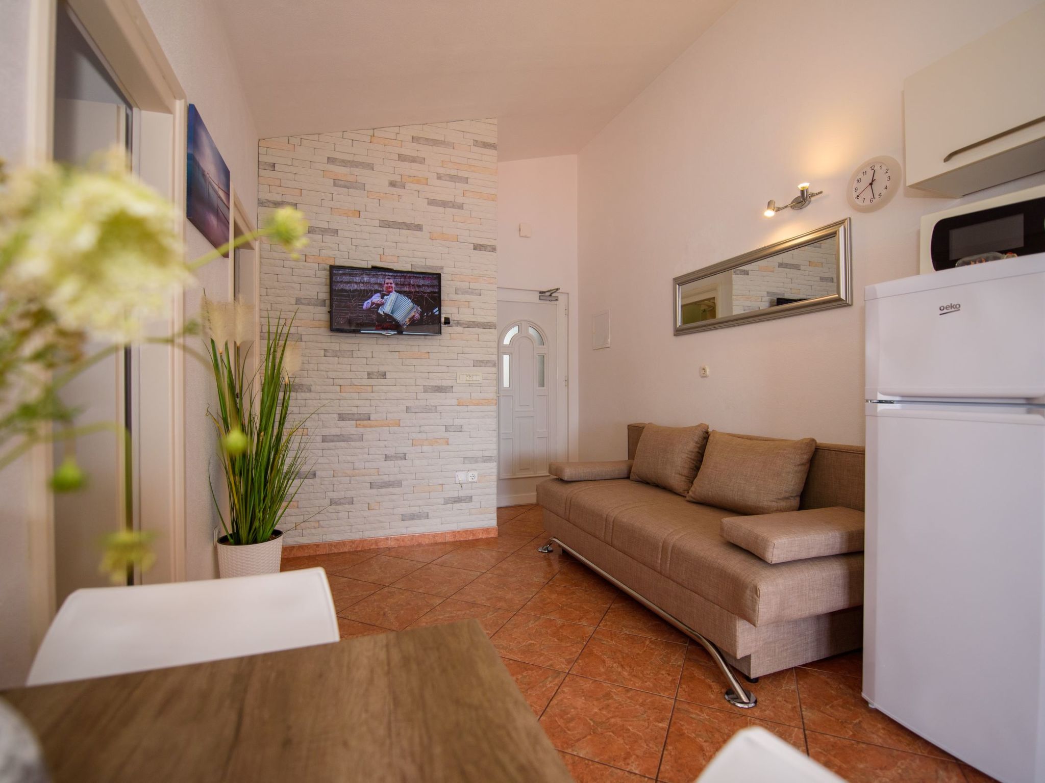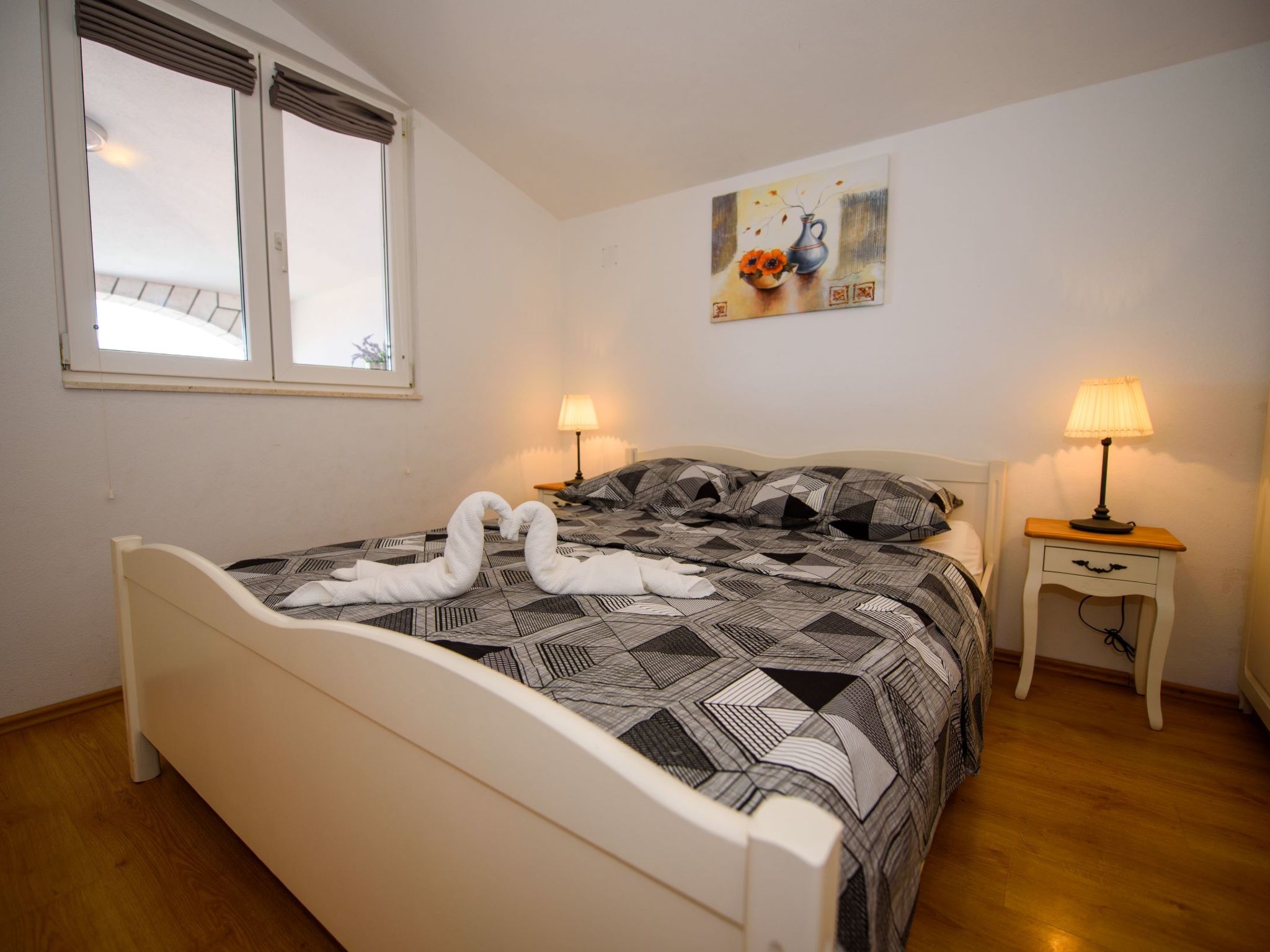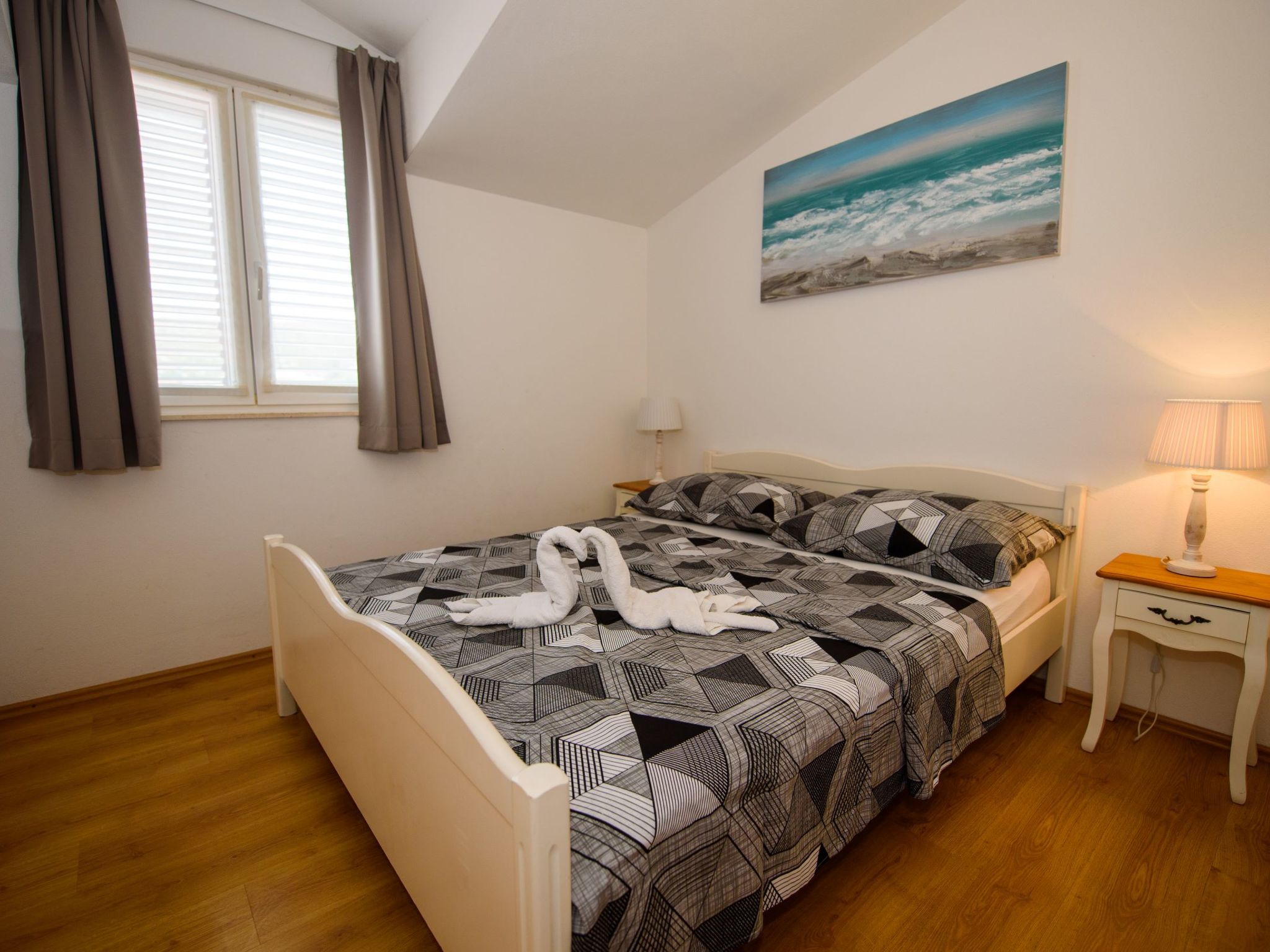 3-Zimmer-Wohnung 45 m2, im Dachgeschoss. Teilweise abgeschrägt, schön und geschmackvoll eingerichtet: Wohn-/Esszimmer mit Sat-TV (Flachbildschirm), Klimaanlage. Ausgang zur Terrasse. 2 Zimmer, jedes Zimmer mit 1 Doppelbett (2 x 80 cm, Länge 200 cm). Offene Küche (2 Glaskeramikherd Platten, Mikrowelle, Tiefkühler, elektrische Kaffeemaschine). Dusche/WC. Klimaanlage (extra). Grosse Terrasse 20 m2, überdacht, Südlage. Terrassenmöbel, Liegestühle (2). Herrliche Sicht auf das Meer. Zur Verfügung: Internet (Wireless LAN, extra).