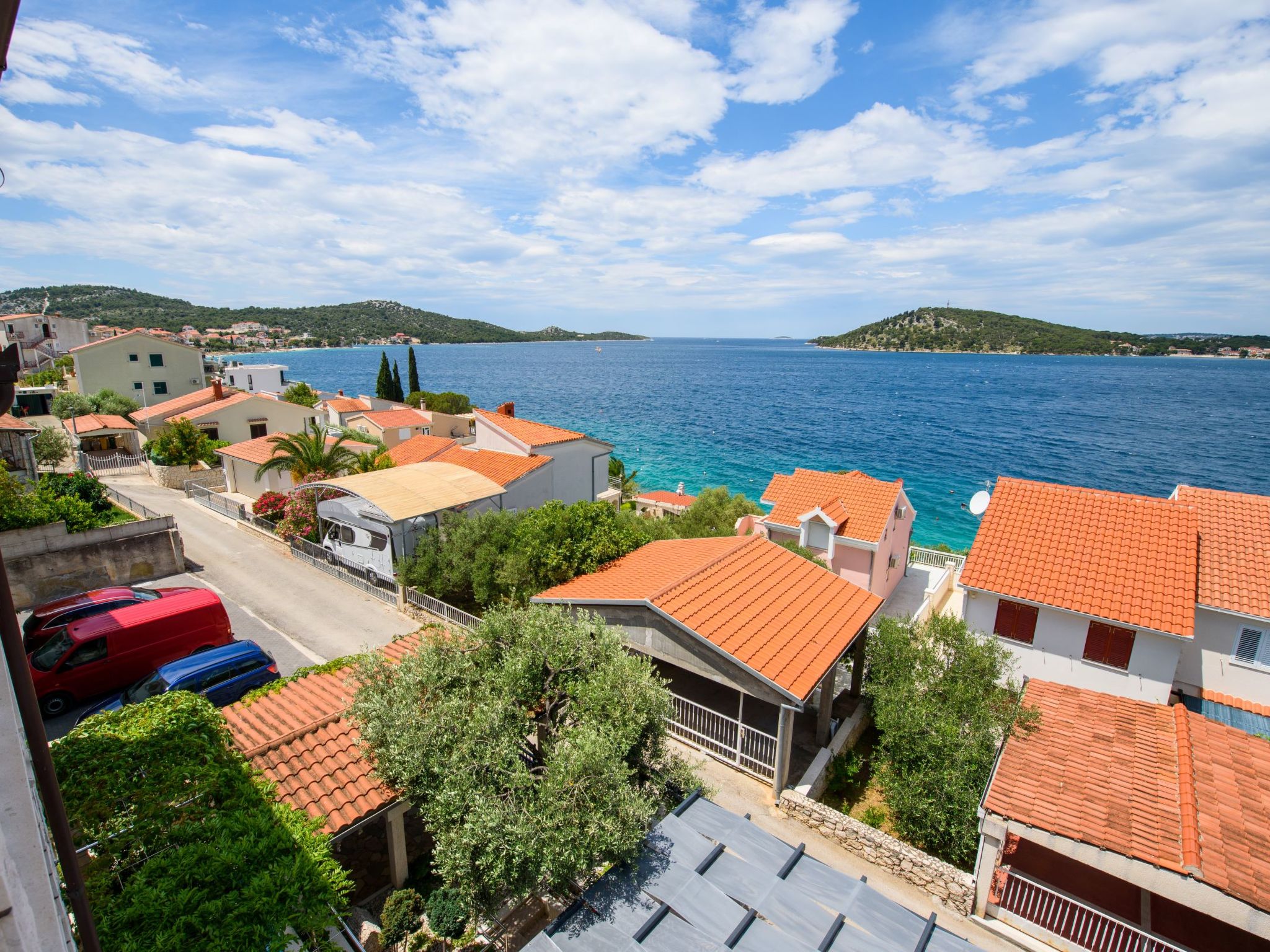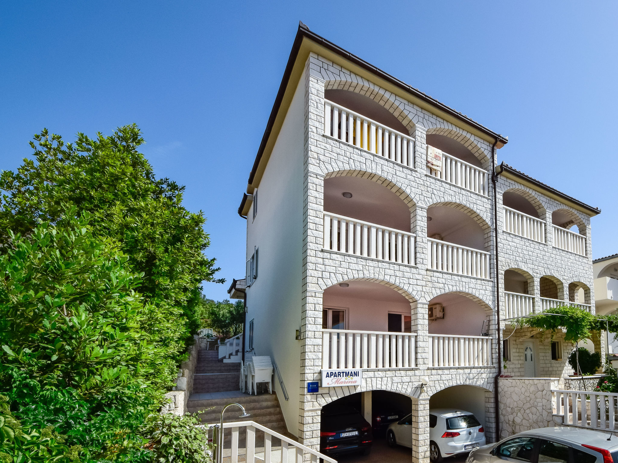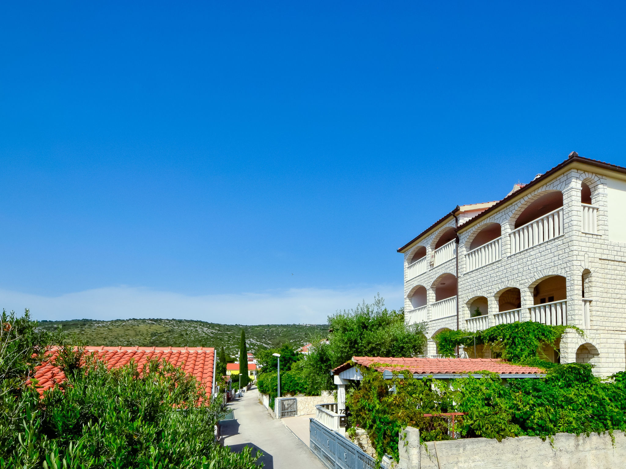 Razanj 10 km von Rogoznica: Schönes Appartementhaus "Marina". Im Ortsteil Ljoljinica, ruhige, erhöhte Lage, 40 m vom Meer. Zur Mitbenutzung: Aussendusche, Terrasse, Gartenmöbel, Grill, Parkplatz beim Haus auf dem Grundstück, Gemeinschaftsgarage. Einkaufsgeschäft, Restaurant 200 m, Felsstrand 40 m. Bitte beachten: In diesem Haus sind weitere Ferienwohnungen mietbar.