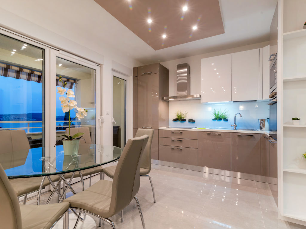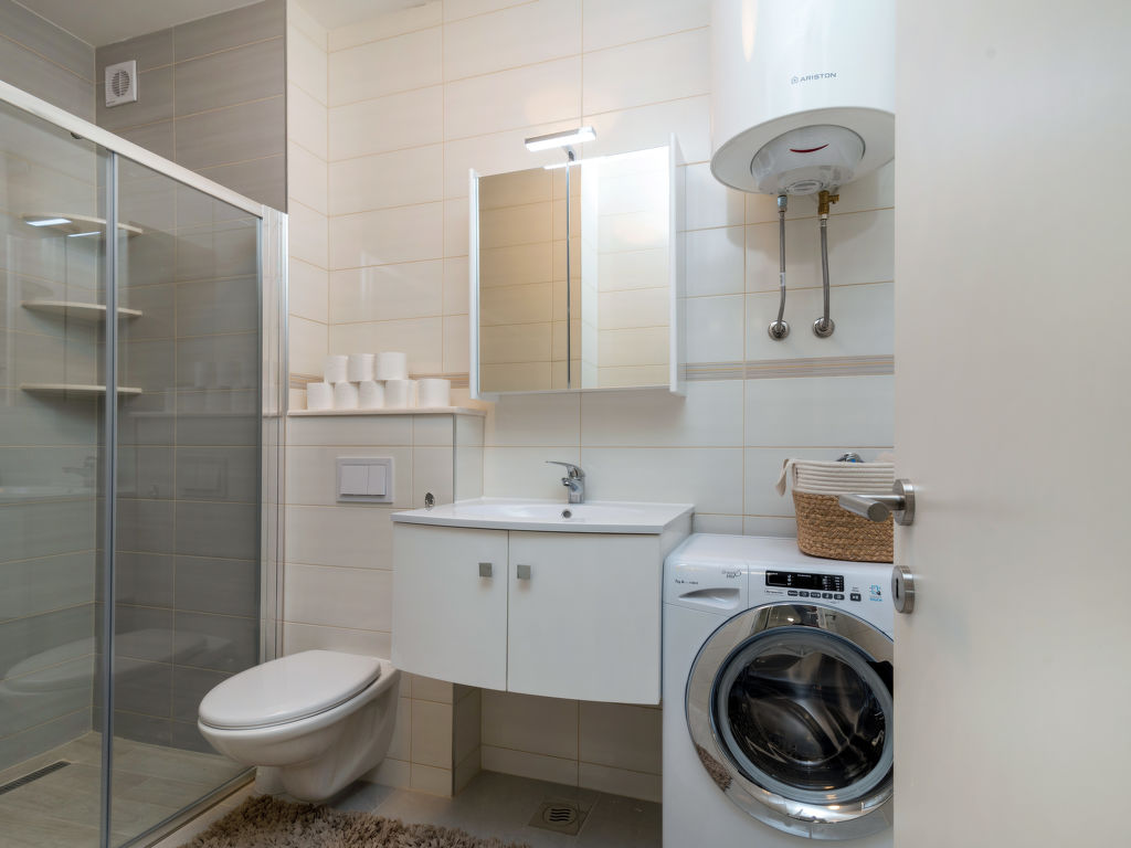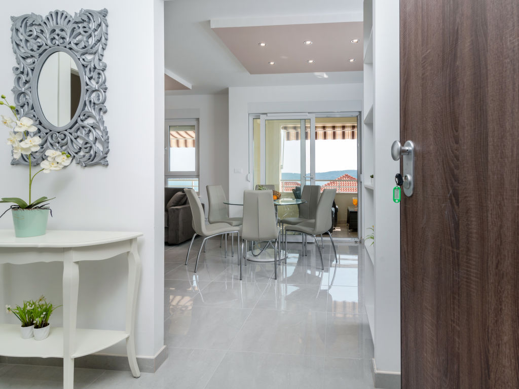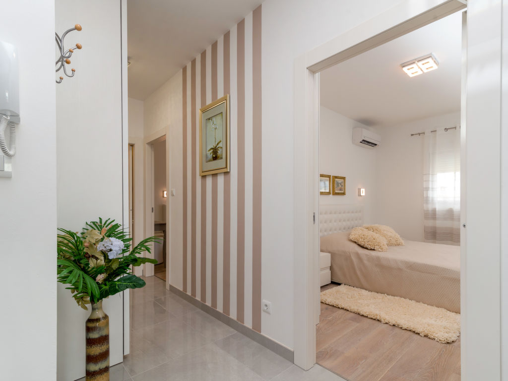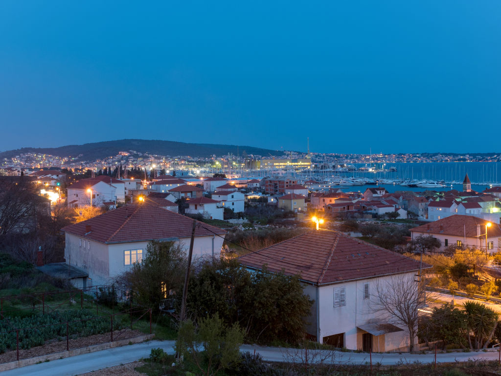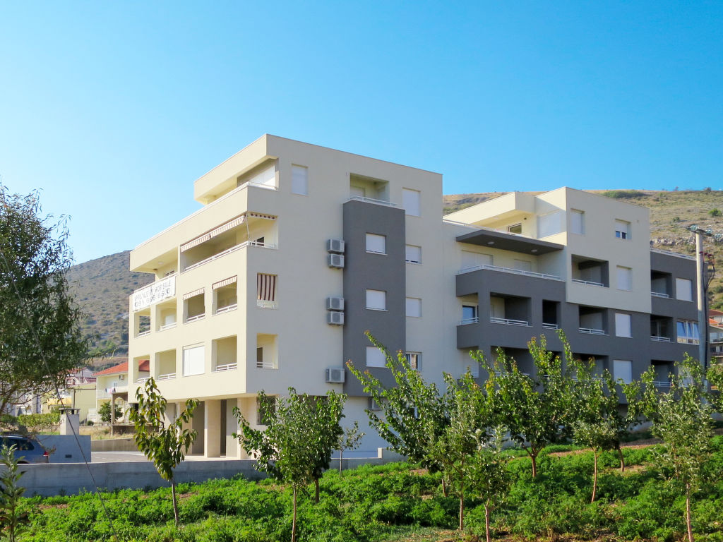 Appartementhaus "Bella Vista", Baujahr 2017. 300 m vom Zentrum von Seget Donji, 1.8 km vom Zentrum von Trogir, 27 km vom Zentrum von Split, 200 m vom Meer, 200 m vom Strand. Zur Mitbenutzung: Grundstück 1'000 m2. Grill. Im Hause: Internetzugang, Fahrstuhl. Parkplatz auf dem Grundstück, öffentliche Parkplätze auf der Strasse. Einkaufsgeschäft 150 m, Supermarkt 1.5 km, Restaurant 2 km, Kieselstrand 200 m.