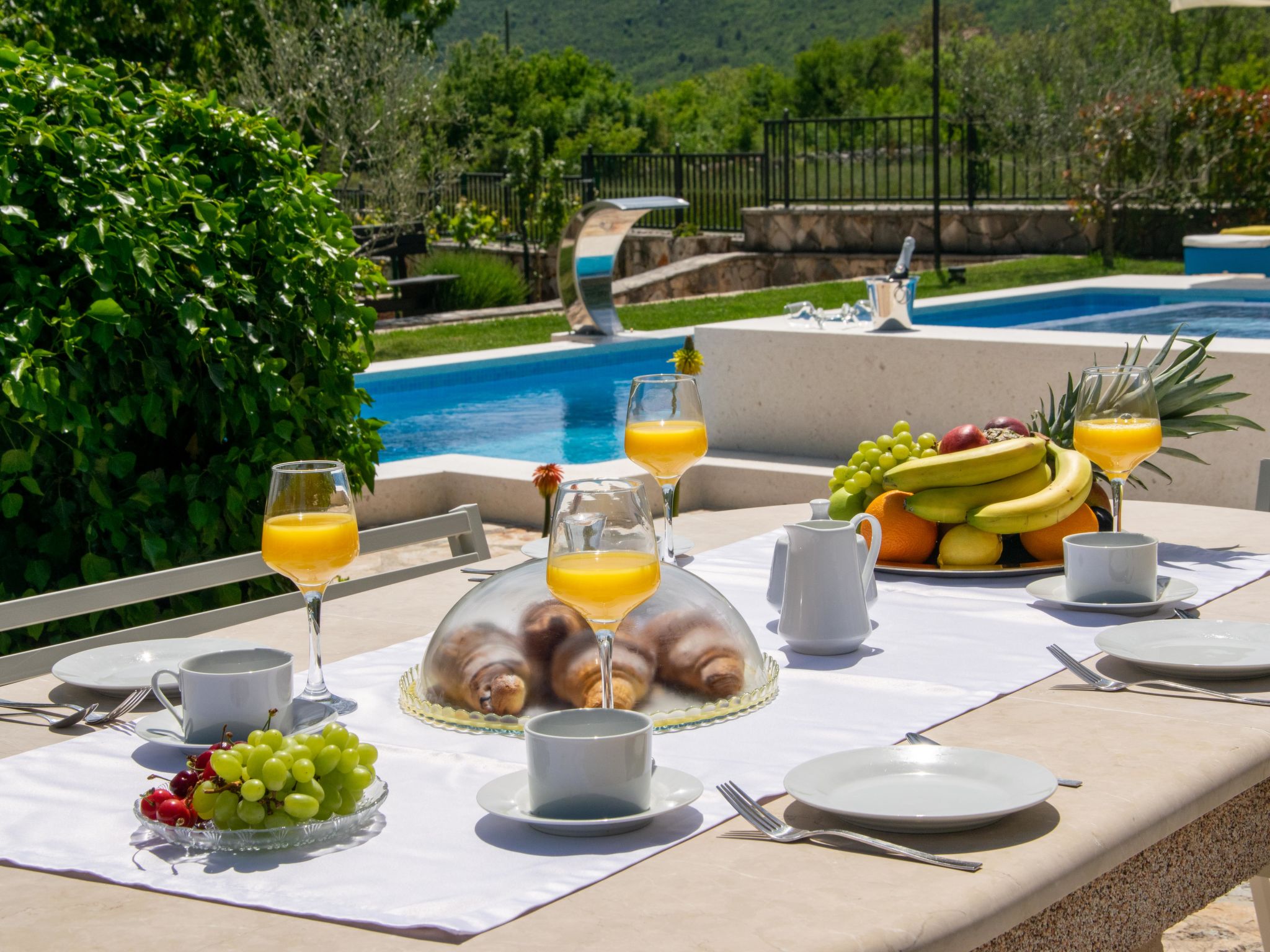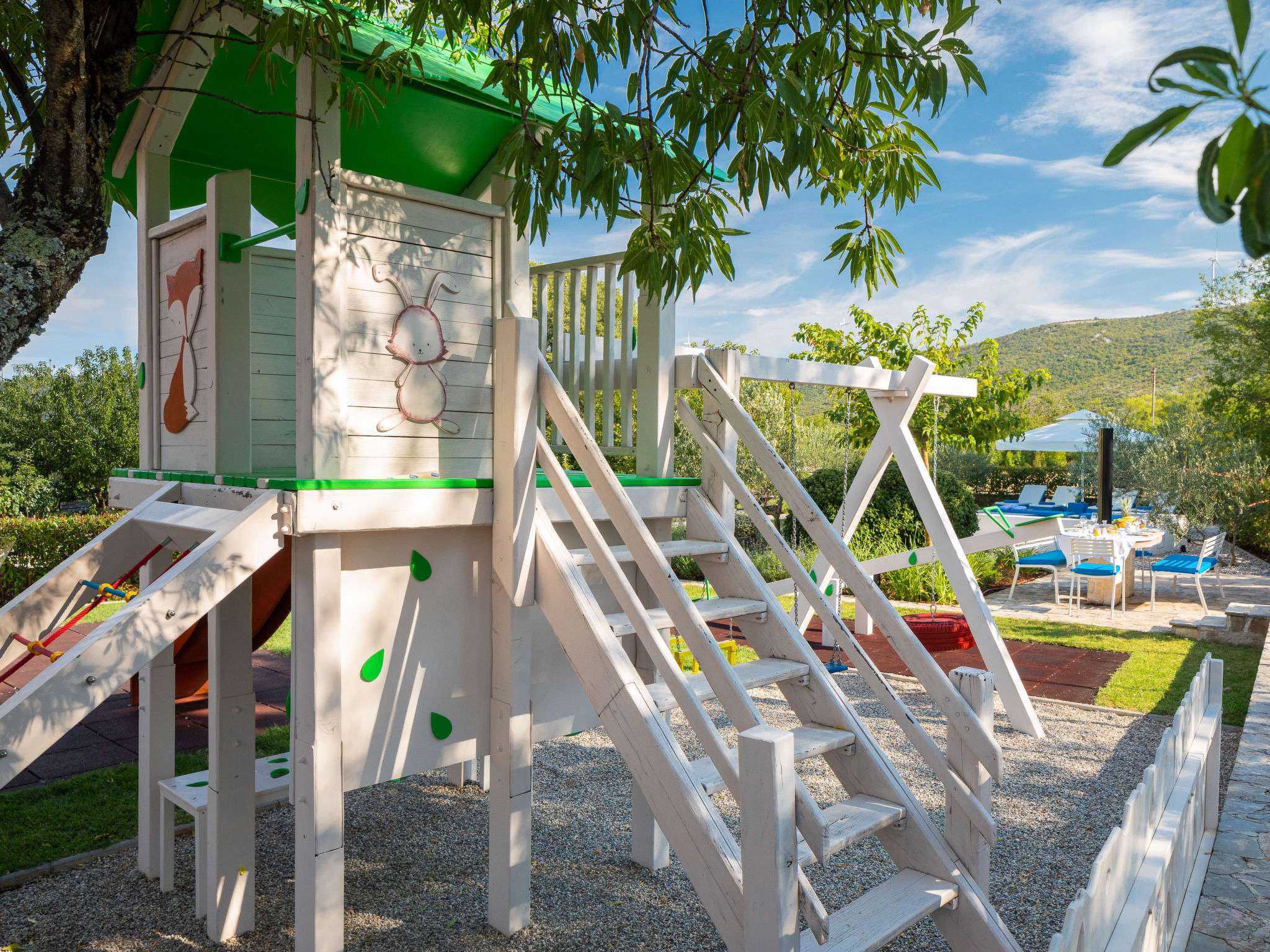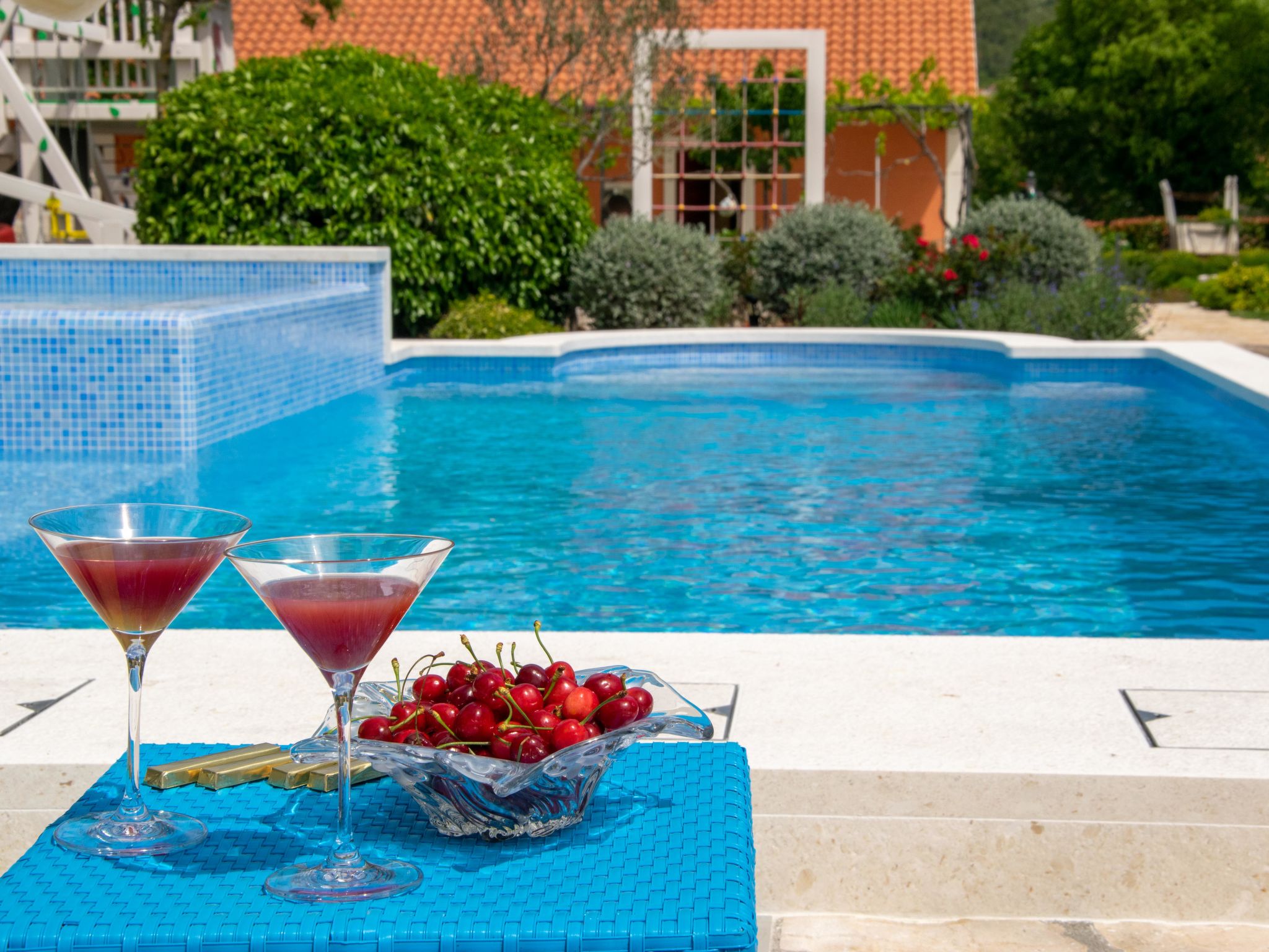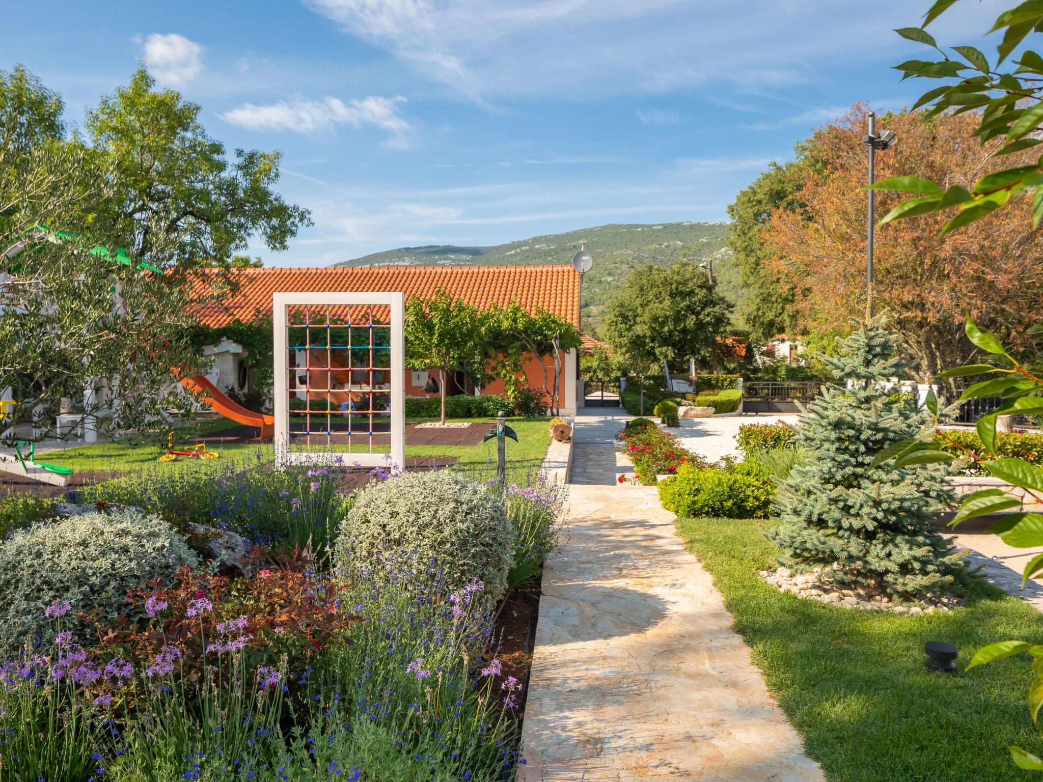 Kinderfreundliches Einfamilienhaus "Villa Dalmatica moderna". Im Weiler Žuvani, 13 km vom Zentrum von Trogir, 24 km vom Zentrum von Primošten, ruhige, sonnige Lage, 13 km vom Meer. Zur Alleinbenutzung: Grundstück 1'600 m2 (eingezäunt), gepflegter Garten, Schwimmbad (32 m2, 35 - 155 cm tief, 02.05.-26.09.) mit Innentreppe. Ungleichmässige Schwimmbadform, Dusche/WC im Poolbereich, Boccia, Terrasse (10 m2), Gartenmöbel, Grill, Kinderspielplatz (Rutschbahn, Schaukel, Sandkasten). Im Hause: Internetzugang, Sauna, Zentralheizung, Waschmaschine, Wäschetrockner. Parkplatz (für 3 Autos) beim Haus auf dem Grundstück. Einkaufsgeschäft 13 km, Restaurant 13 km, Kieselstrand 13 km, Strandbad 13 km. Schwimmbad mit Hydromassage und Wasserfall.