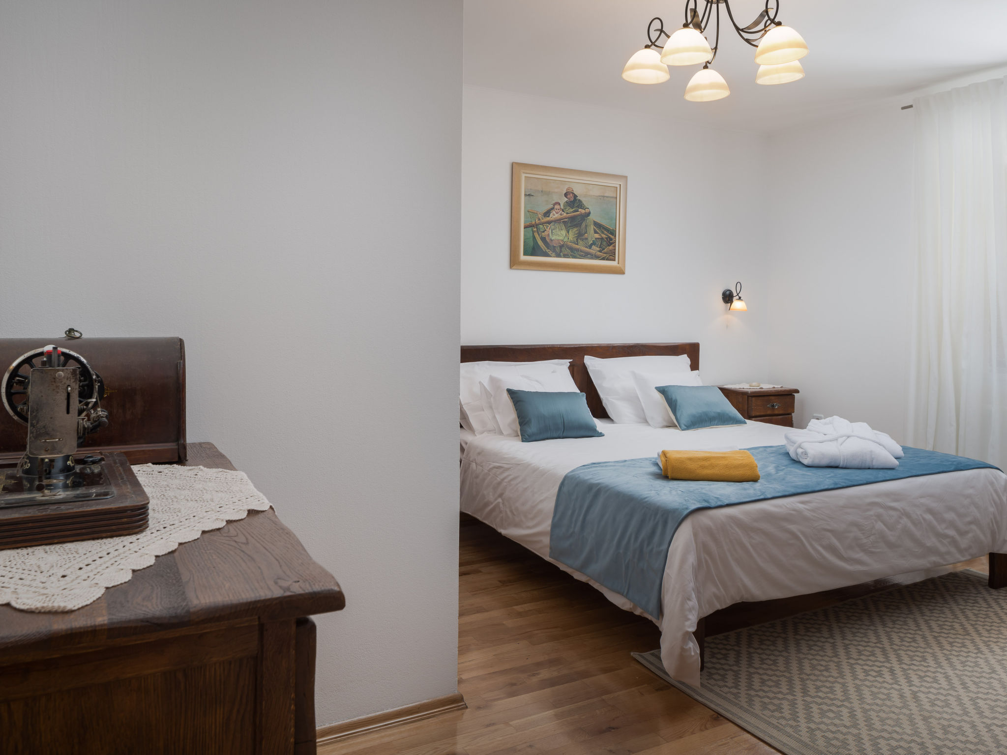 4-Zimmer-Haus 134 m2, Südlage. Wohn-/Esszimmer mit 1 Doppeldiwanbett (140 cm, Länge 200 cm), offenem Kamin, Kabel-TV, Stereoanlage, DVD und Klimaanlage. Ausgang zur Terrasse. 1 Zimmer mit 1 Doppelbett (2 x 80 cm, Länge 200 cm), Dusche/WC. 1 Zimmer mit 1 Doppelbett (2 x 80 cm, Länge 200 cm). 1 Kinderzimmer mit 1 x 2 Etagenbetten (90 cm, Länge 200 cm), TV. Offene Küche (4 Kochplatten, Backofen, Geschirrspüler, Mikrowelle, Tiefkühler, elektrische Kaffeemaschine). Dusche/WC. Terrasse 65 m2, überdacht. Terrassenmöbel, Liegestühle. Zur Verfügung: Safe, Bügeleisen, Kinderhochstuhl, Babybett, Haartrockner. Internet (Wireless LAN, gratis). Parkplatz (eingezäunt).
