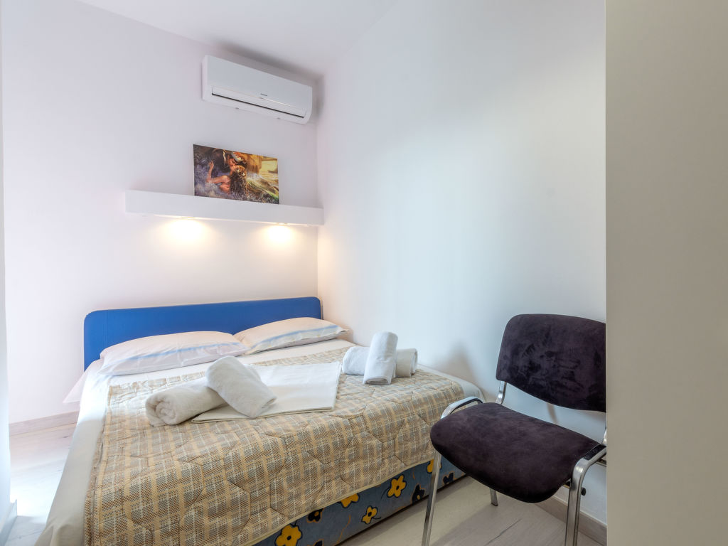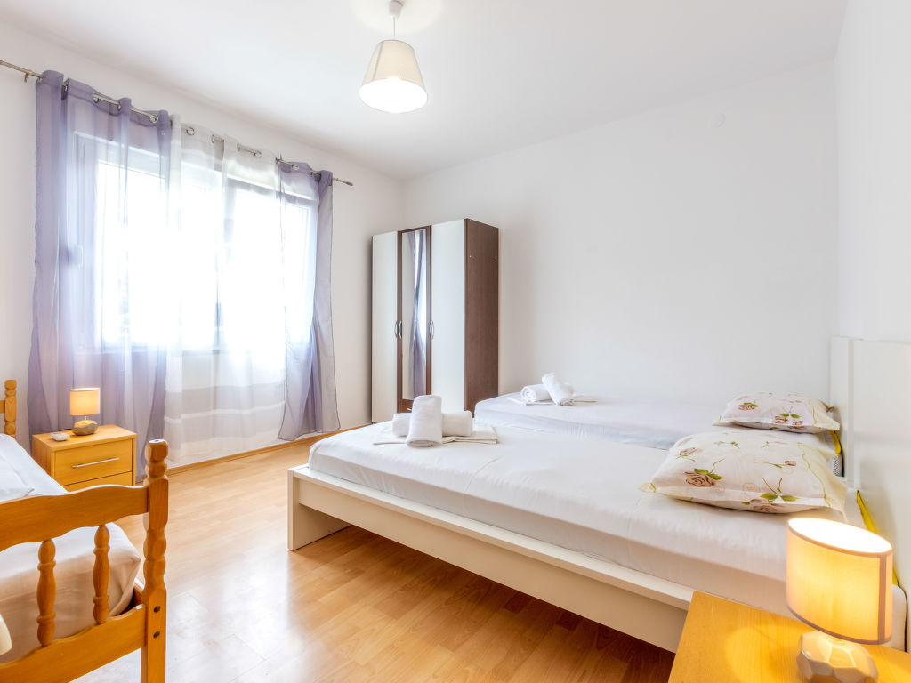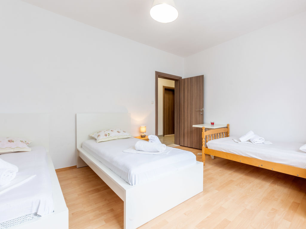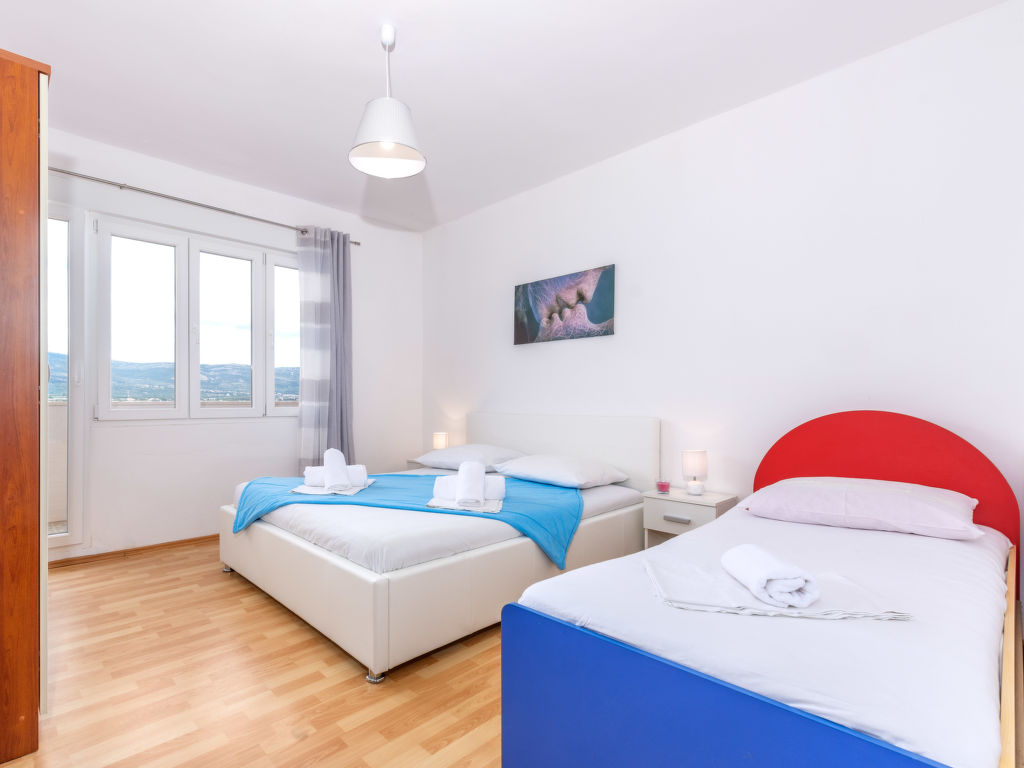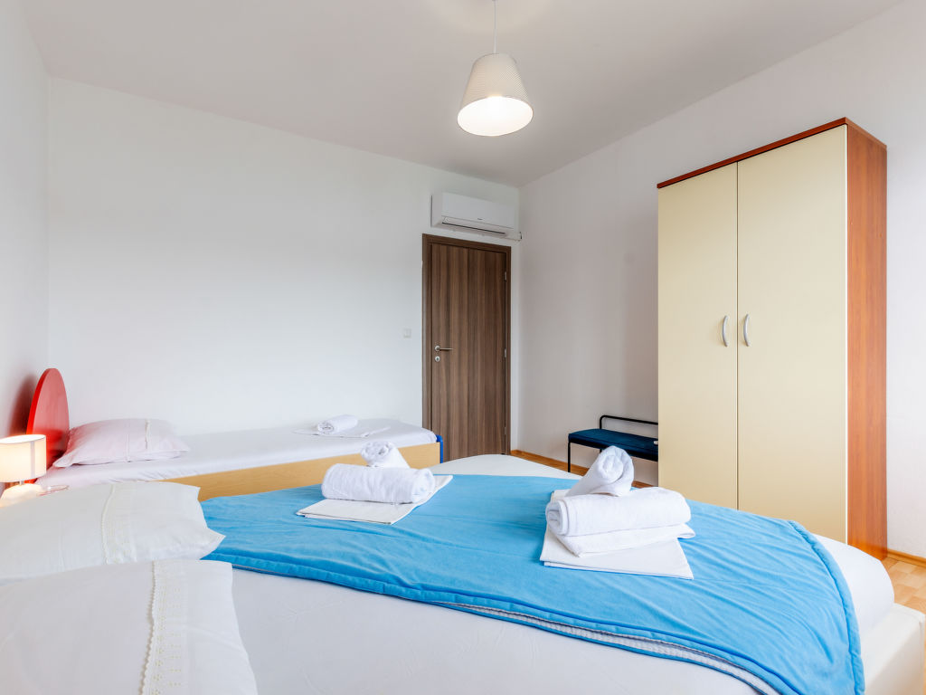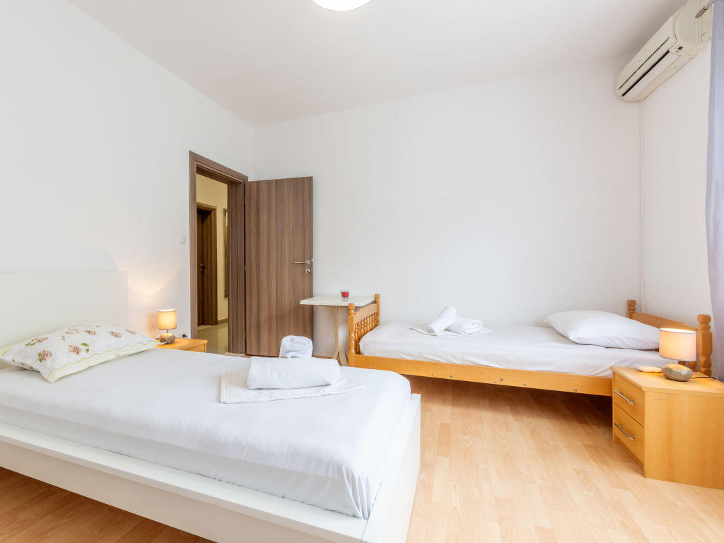 5-Zimmer-Wohnung 120 m2 im 1. Stock. Wohn-/Esszimmer mit Sat-TV (Flachbildschirm), Klimaanlage. Ausgang zum Balkon. 2 Zimmer, jedes Zimmer mit 1 franz. Bett (160 cm, Länge 200 cm), Klimaanlage. Ausgang zum Balkon. 1 Zimmer mit 3 Betten (80 cm, Länge 200 cm), Klimaanlage. Ausgang zum Balkon. 1 Zimmer mit 3 Betten (90 cm, Länge 200 cm), Klimaanlage. Offene Küche (Backofen, Geschirrspüler, 4 Glaskeramikherd Platten, Mikrowelle, Tiefkühler, elektrische Kaffeemaschine). 2 Duschen/WC. 3 Balkone 3 m2, Balkon 5 m2. Balkonmöbel, Liegestühle. Herrliche Sicht auf das Meer. Zur Verfügung: Waschmaschine. Internet (Wireless LAN, gratis).