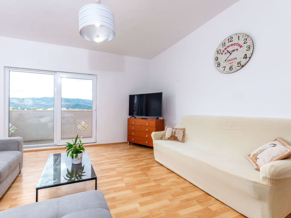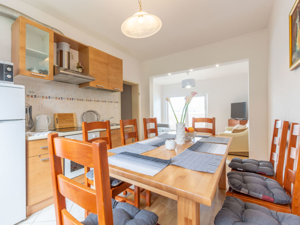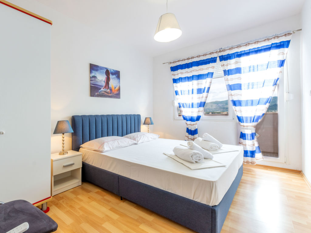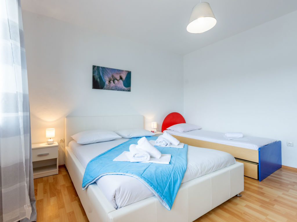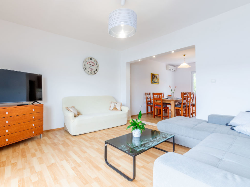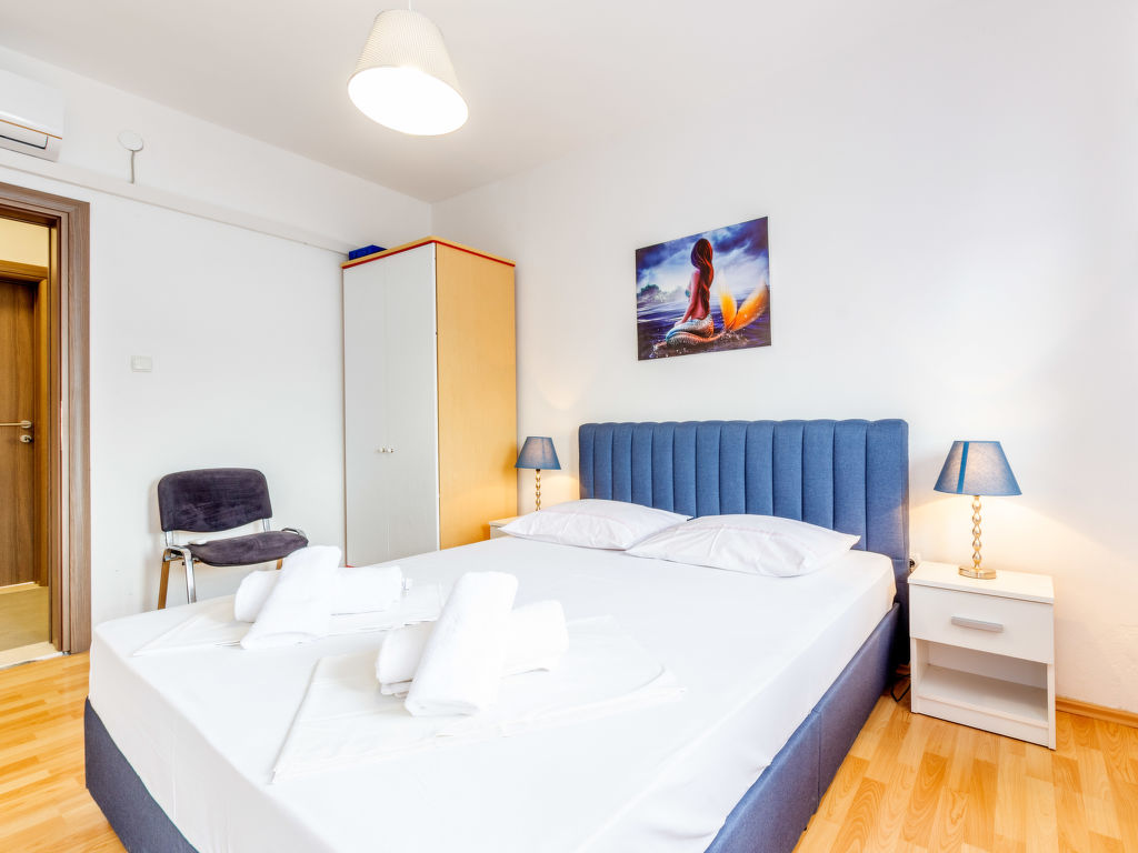 5-Zimmer-Wohnung 120 m2 im 1. Stock. Wohn-/Esszimmer mit Sat-TV (Flachbildschirm), Klimaanlage. Ausgang zum Balkon. 2 Zimmer, jedes Zimmer mit 1 franz. Bett (160 cm, Länge 200 cm), Klimaanlage. Ausgang zum Balkon. 1 Zimmer mit 3 Betten (80 cm, Länge 200 cm), Klimaanlage. Ausgang zum Balkon. 1 Zimmer mit 3 Betten (90 cm, Länge 200 cm), Klimaanlage. Offene Küche (Backofen, Geschirrspüler, 4 Glaskeramikherd Platten, Mikrowelle, Tiefkühler, elektrische Kaffeemaschine). 2 Duschen/WC. 3 Balkone 3 m2, Balkon 5 m2. Balkonmöbel, Liegestühle. Herrliche Sicht auf das Meer. Zur Verfügung: Waschmaschine. Internet (Wireless LAN, gratis).