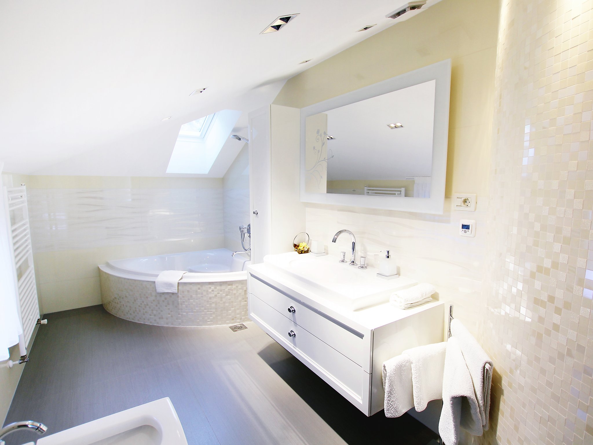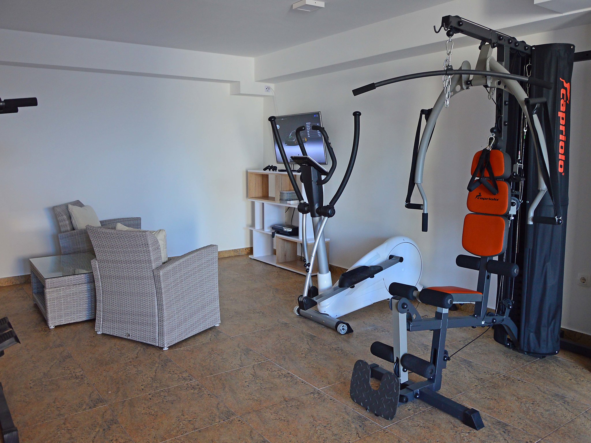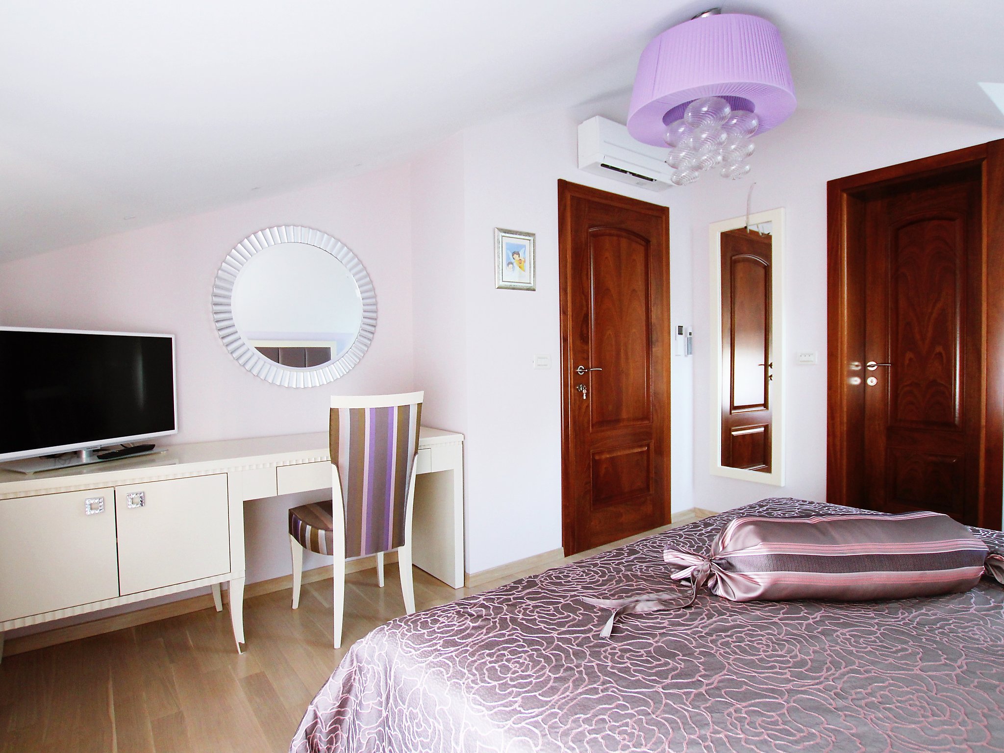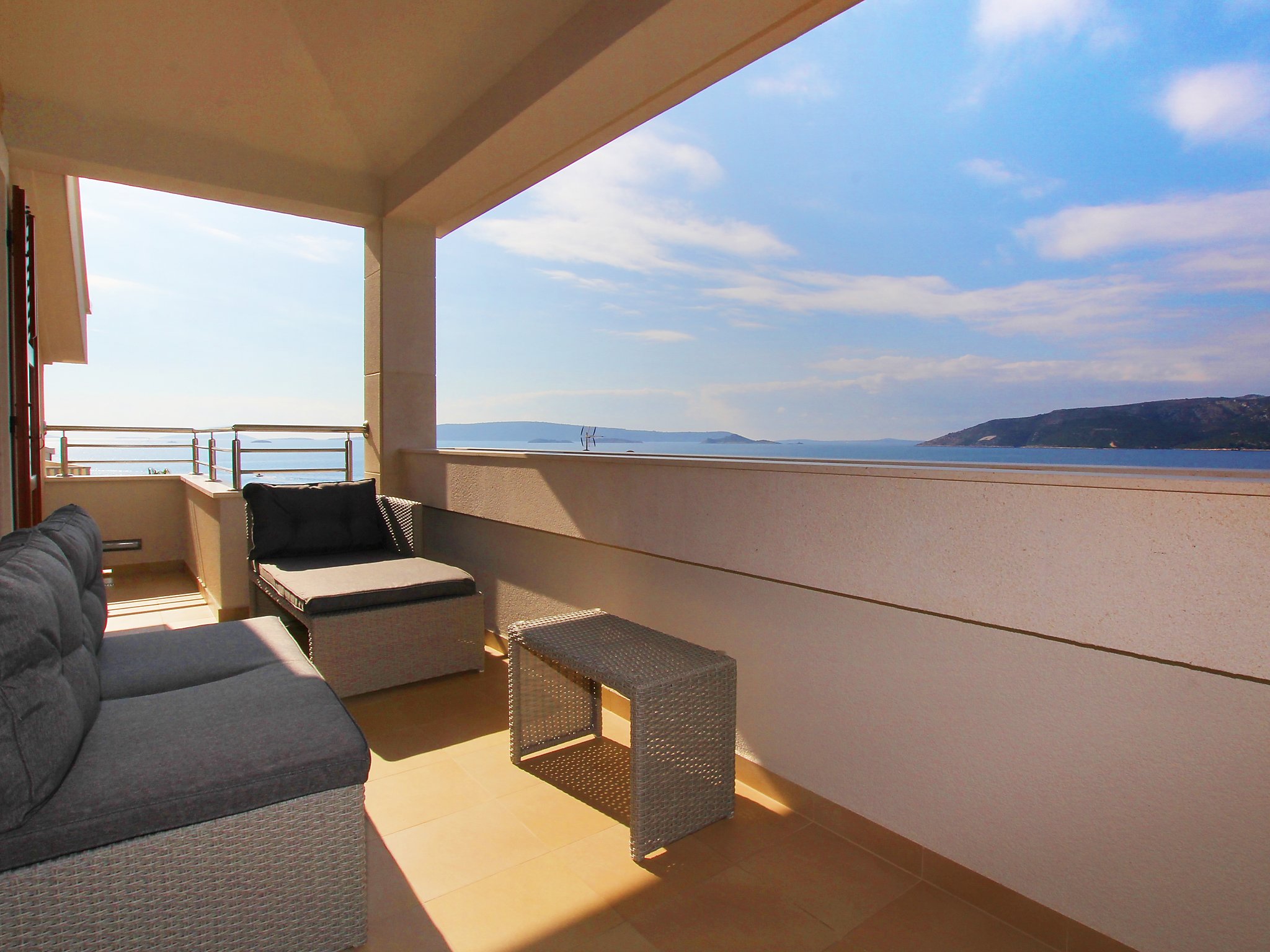 7-Zimmer-Haus 400 m2 auf 4 Stockwerken, Südwestlage. Wohn-/Esszimmer 50 m2 mit Sat-TV (Flachbildschirm), Klimaanlage. Ausgang zum Balkon. 1 Zimmer mit 1 franz. Bett (160 cm, Länge 200 cm), Dusche/WC und Sat-TV (Flachbildschirm), Klimaanlage. 1 Zimmer mit 1 Doppelbett (2 x 90 cm, Länge 200 cm), Bad/Bidet/WC und Sat-TV (Flachbildschirm), Klimaanlage. Offene Küche (Backofen, Geschirrspüler, 4 Glaskeramikherd Platten, Mikrowelle, Tiefkühler, elektrische Kaffeemaschine). 2. Obergeschoss: Wohn-/Esszimmer 50 m2 mit offenem Kamin und Sat-TV (Flachbildschirm), Klimaanlage. Ausgang zum Balkon, zur Terrasse. Küche (Backofen, Geschirrspüler, 4 Glaskeramikherd Platten, Mikrowelle, Tiefkühler, elektrische Kaffeemaschine). Dusche/WC. Dachgeschoss: 1 abgeschrägtes Zimmer, Deckenhöhe 145 - 290 cm mit Dachfenster mit 1 Doppelbett (2 x 90 cm, Länge 200 cm), Dusche/WC und TV (Flachbildschirm), Klimaanlage. 1 abgeschrägtes Zimmer, Deckenhöhe 145 - 290 cm mit Dachfenster mit 1 Doppelbett (2 x 90 cm, Länge 210 cm), Bad/Bidet/WC und Klimaanlage. Ausgang zur Terrasse. 1 abgeschrägtes Zimmer 20 m2, Deckenhöhe 145 - 290 cm mit Dachfenster mit 1 Doppelbett (2 x 90 cm, Länge 200 cm), Bad/Bidet/WC, mit Eckbadewanne und Klimaanlage. Ausgang zur Terrasse. 2 Balkone 7 m2, 2 Balkone 3 m2, Terrasse 20 m2 teilweise überdacht, Terrasse 15 m2 teilweise überdacht. Terrassenmöbel, Liegestühle. Herrliche Sicht auf das Meer. Zur Verfügung: Safe, Babybett. Internet (Wireless LAN, gratis). Im Erdgeschoss: Billardzimmer, TV (Flachbildschirm), sep. WC. Eine Ferienwohnung im 1. Stock mit Wohn-/Essbereich, offener Küche und 2 Schlafzimmern. Eine Ferienwohnung auf 2 Ebenen mit separatem Eingang, Wohn-/Essbereich und Küche im zweiten Stock und 3 Schlafzimmer in der obersten Etage.