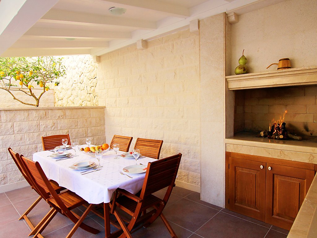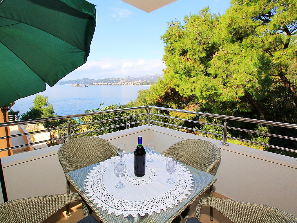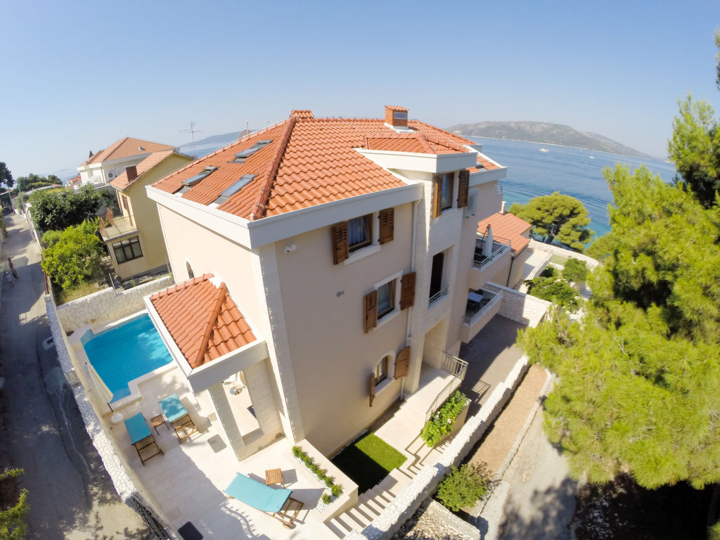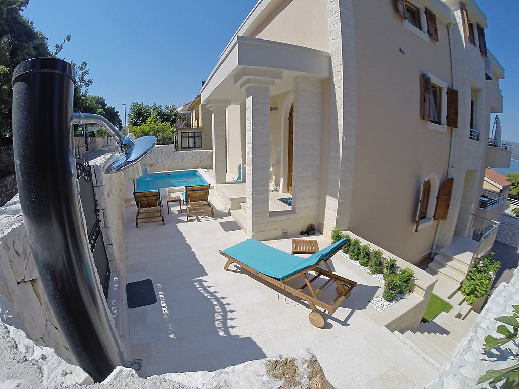 Okrug Donji 8 km von Trogir: Einfamilienhaus "Villa Mustra", auf 4 Stockwerken. Ruhige, sonnige Lage, 30 m vom Meer, 30 m vom Strand. Zur Alleinbenutzung: Grundstück 360 m2 (eingezäunt), Schwimmbad eckig (5 x 3 m, 18 m2, 150 cm tief, 19.05.-27.10.) mit Innentreppe. Aussendusche, Sprudelbad, Terrasse (20 m2), Gartenmöbel, Grill. Im Hause: Internetzugang, Billard, Zentralheizung, Alarmanlage, Waschmaschine, Wäschetrockner. Parkplatz (für 2 Autos) beim Haus auf dem Grundstück, öffentliche Parkplätze. Einkaufsgeschäft 1 km, Restaurant 5 km, Kieselstrand 700 m, Felsstrand 30 m. Das Haus besteht aus 2 Ferienwohnungen, die als eine Einheit vermietet werden.