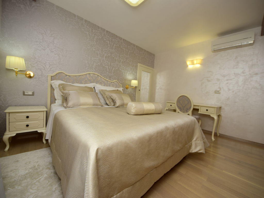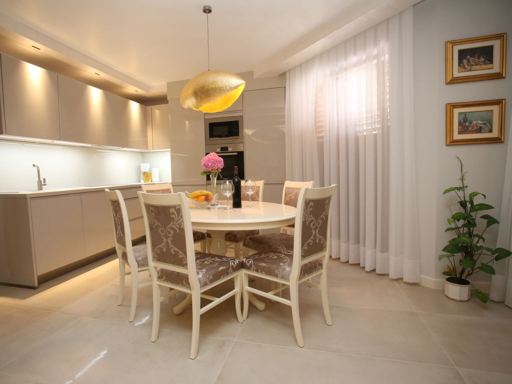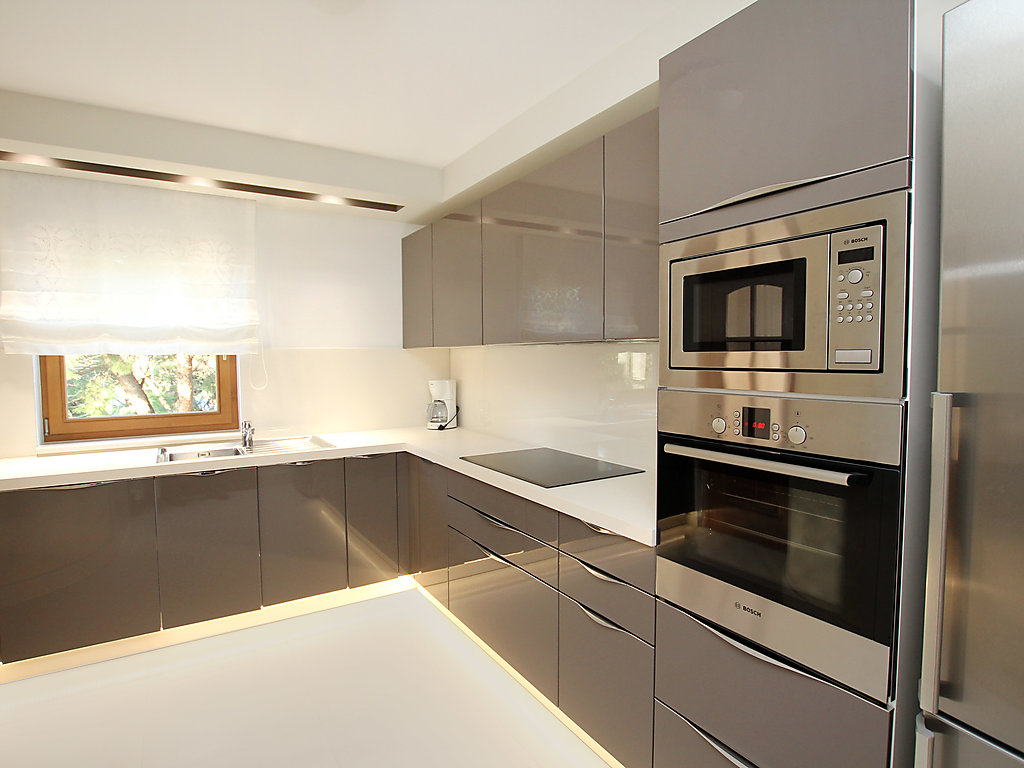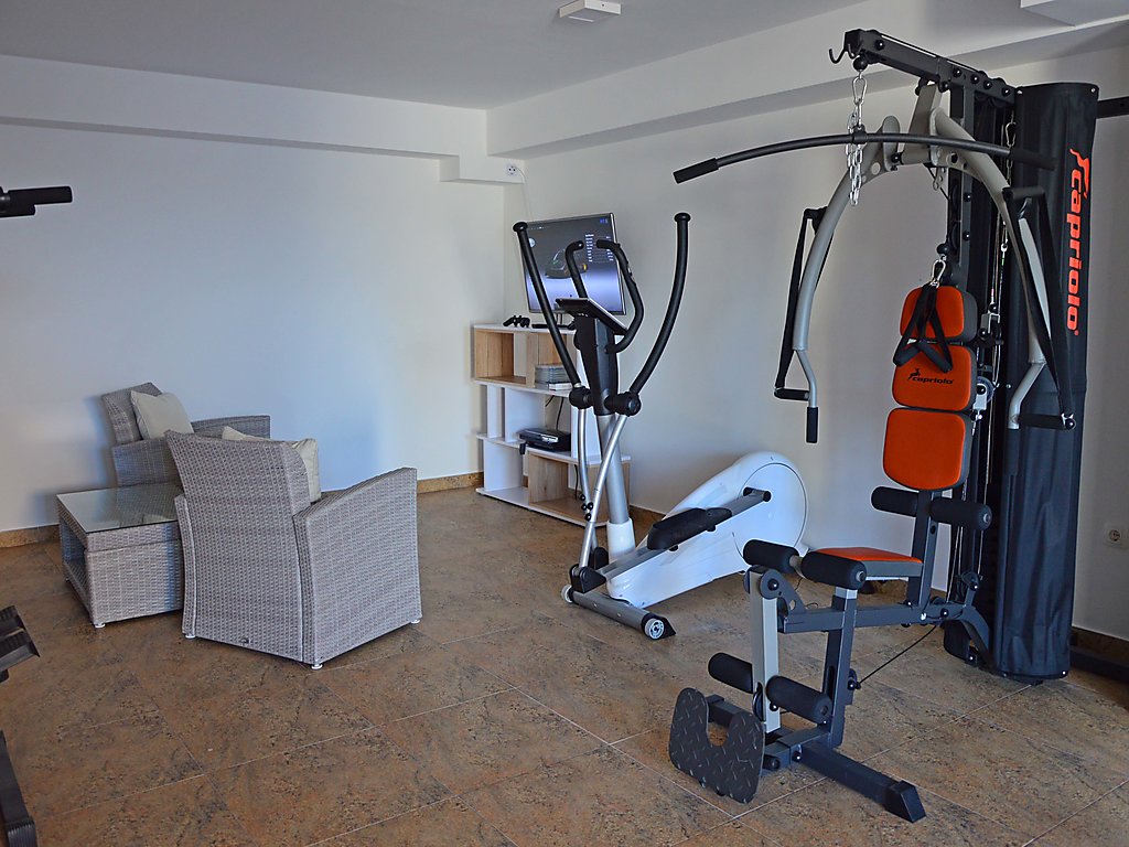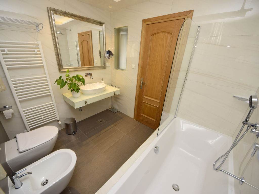 7-Zimmer-Haus 400 m2 auf 4 Stockwerken, Südwestlage. Wohn-/Esszimmer 50 m2 mit Sat-TV (Flachbildschirm), Klimaanlage. Ausgang zum Balkon. 1 Zimmer mit 1 franz. Bett (160 cm, Länge 200 cm), Dusche/WC und Sat-TV (Flachbildschirm), Klimaanlage. 1 Zimmer mit 1 Doppelbett (2 x 90 cm, Länge 200 cm), Bad/Bidet/WC und Sat-TV (Flachbildschirm), Klimaanlage. Offene Küche (Backofen, Geschirrspüler, 4 Glaskeramikherd Platten, Mikrowelle, Tiefkühler, elektrische Kaffeemaschine). 2. Obergeschoss: Wohn-/Esszimmer 50 m2 mit offenem Kamin und Sat-TV (Flachbildschirm), Klimaanlage. Ausgang zum Balkon, zur Terrasse. Küche (Backofen, Geschirrspüler, 4 Glaskeramikherd Platten, Mikrowelle, Tiefkühler, elektrische Kaffeemaschine). Dusche/WC. Dachgeschoss: 1 abgeschrägtes Zimmer, Deckenhöhe 145 - 290 cm mit Dachfenster mit 1 Doppelbett (2 x 90 cm, Länge 200 cm), Dusche/WC und TV (Flachbildschirm), Klimaanlage. 1 abgeschrägtes Zimmer, Deckenhöhe 145 - 290 cm mit Dachfenster mit 1 Doppelbett (2 x 90 cm, Länge 210 cm), Bad/Bidet/WC und Klimaanlage. Ausgang zur Terrasse. 1 abgeschrägtes Zimmer 20 m2, Deckenhöhe 145 - 290 cm mit Dachfenster mit 1 Doppelbett (2 x 90 cm, Länge 200 cm), Bad/Bidet/WC, mit Eckbadewanne und Klimaanlage. Ausgang zur Terrasse. 2 Balkone 7 m2, 2 Balkone 3 m2, Terrasse 20 m2 teilweise überdacht, Terrasse 15 m2 teilweise überdacht. Terrassenmöbel, Liegestühle. Herrliche Sicht auf das Meer. Zur Verfügung: Safe, Babybett. Internet (Wireless LAN, gratis). Im Erdgeschoss: Billardzimmer, TV (Flachbildschirm), sep. WC. Eine Ferienwohnung im 1. Stock mit Wohn-/Essbereich, offener Küche und 2 Schlafzimmern. Eine Ferienwohnung auf 2 Ebenen mit separatem Eingang, Wohn-/Essbereich und Küche im zweiten Stock und 3 Schlafzimmer in der obersten Etage.