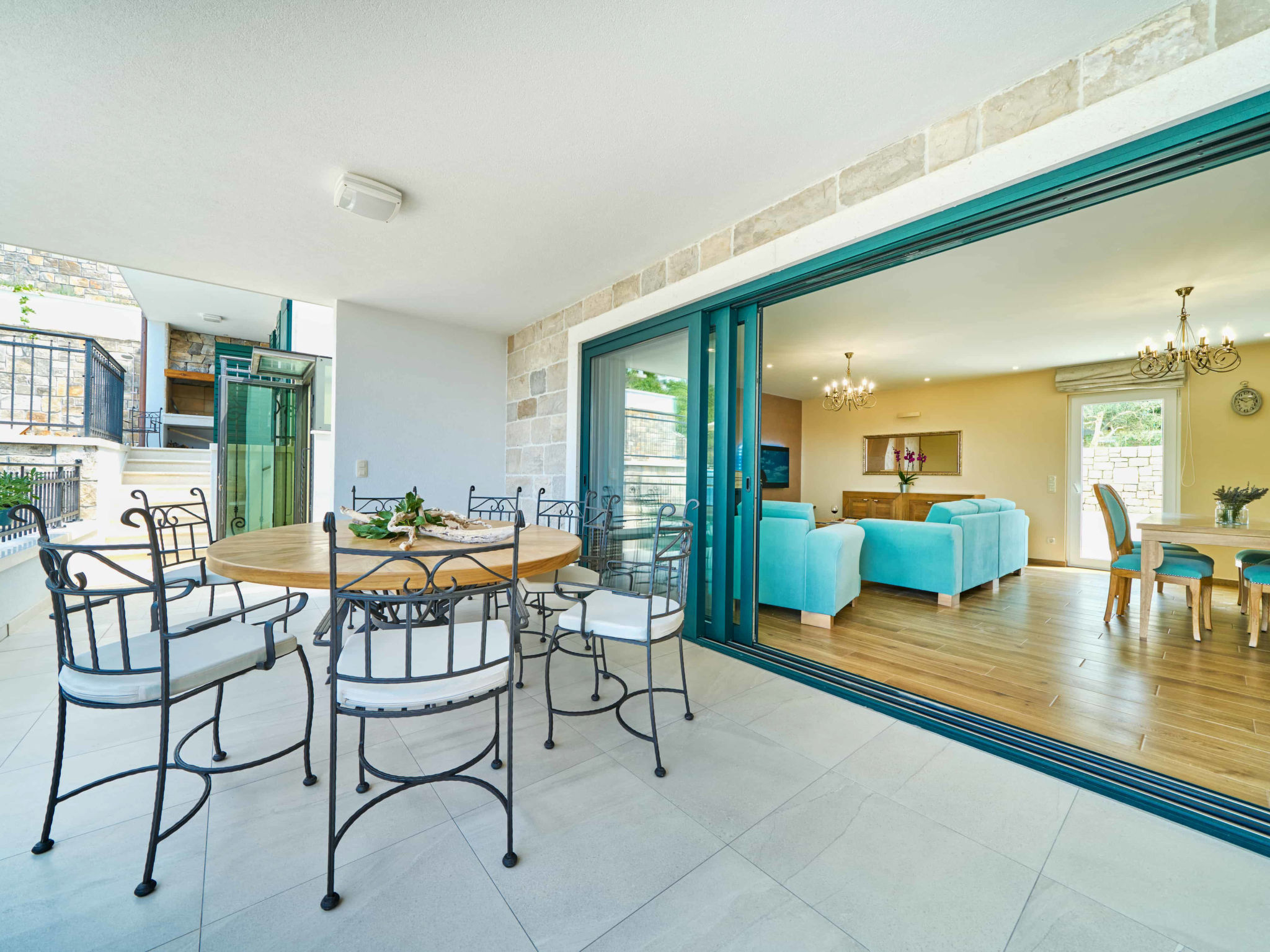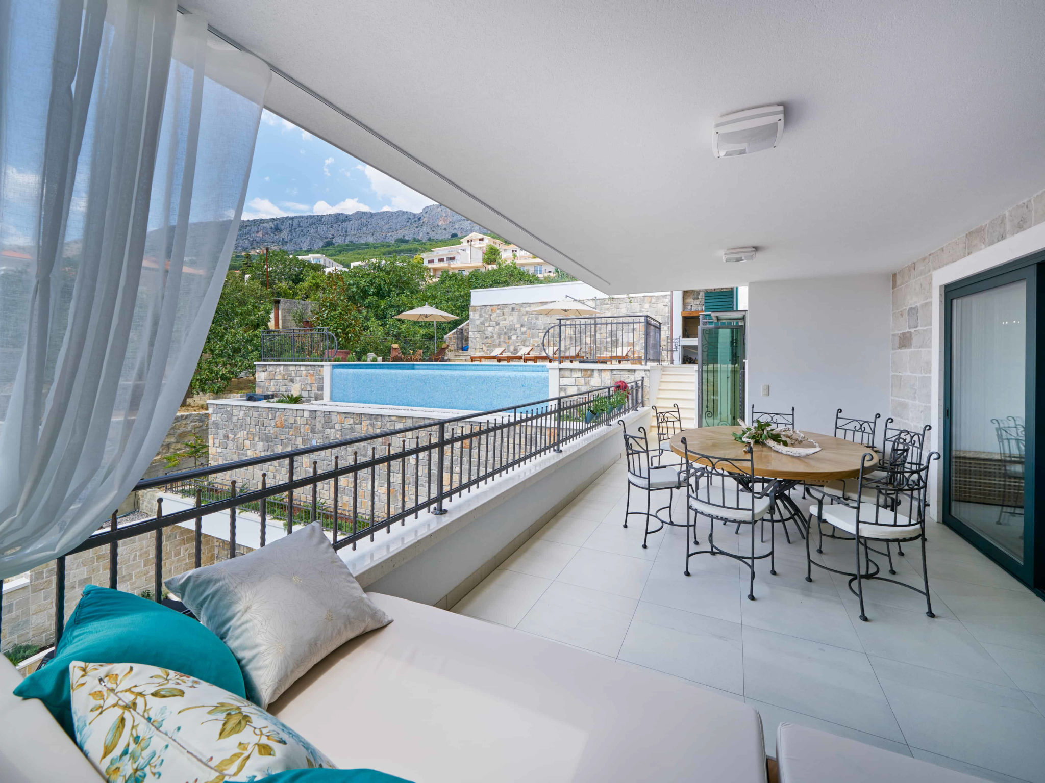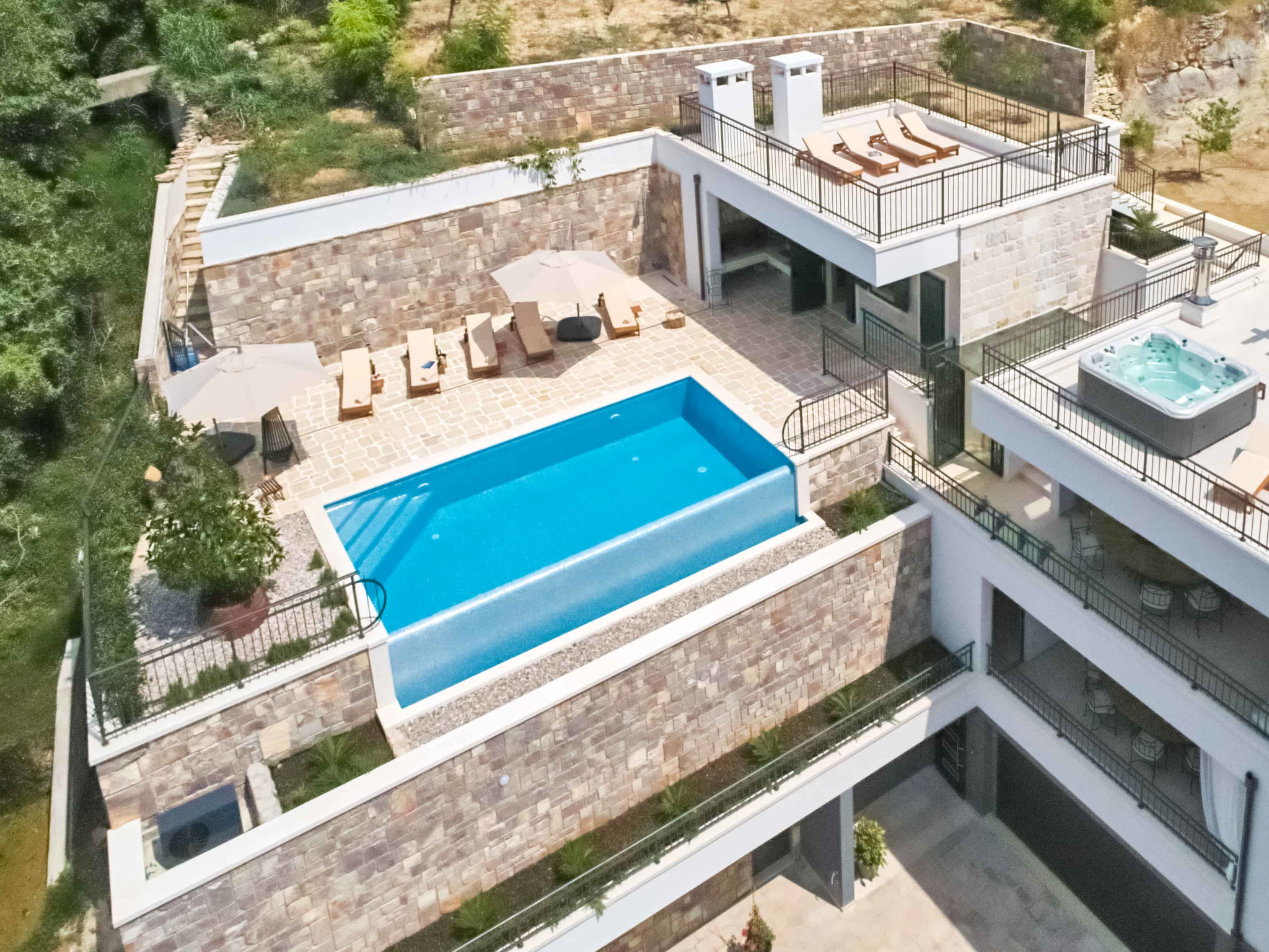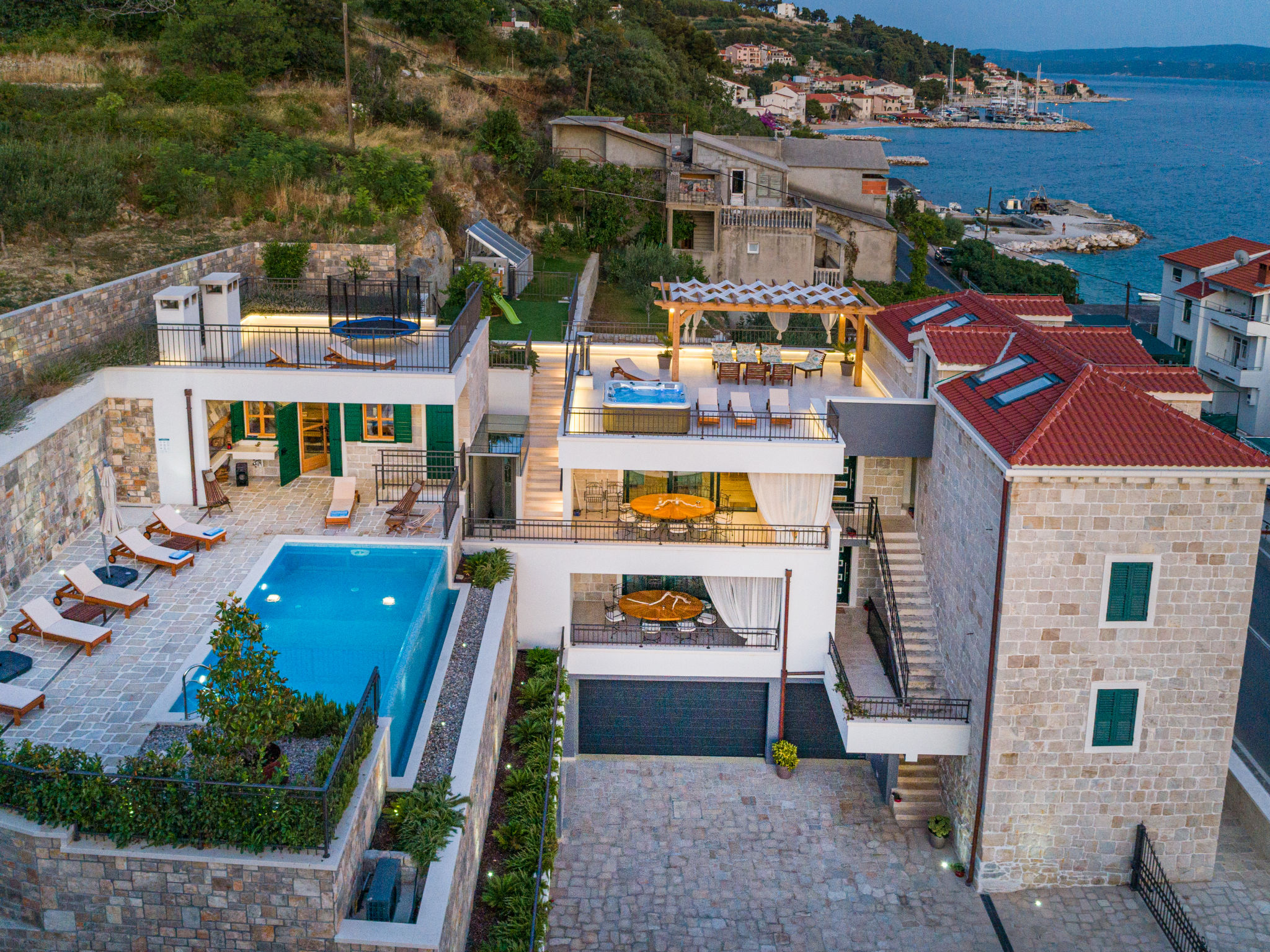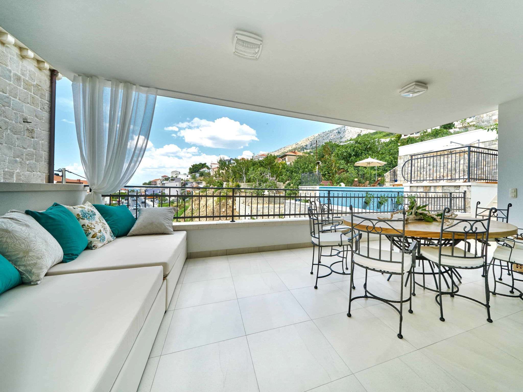 8-Zimmer-Villa 280 m2 auf 2 Stockwerken. Geräumig, schön eingerichtet: Wohn-/Esszimmer mit offenem Kamin und Sat-TV (Flachbildschirm), Klimaanlage. Ausgang zur Terrasse. 2 Zimmer, jedes Zimmer mit 1 franz. Bett (180 cm, Länge 200 cm), Dusche/WC und Sat-TV (Flachbildschirm). 1 Zimmer mit 2 Betten (90 cm, Länge 200 cm), Dusche/WC und Sat-TV (Flachbildschirm). Offene Küche (Backofen, Geschirrspüler, 4 Glaskeramikherd Platten, Toaster, Wasserkocher, Mikrowelle, Tiefkühler, elektrische Kaffeemaschine). Sep. WC. Obergeschoss: Wohn-/Esszimmer mit offenem Kamin und Sat-TV (Flachbildschirm). Ausgang zur Terrasse, zum Schwimmbad. 2 Zimmer, jedes Zimmer mit 1 franz. Bett (180 cm, Länge 200 cm), Dusche/WC und Sat-TV (Flachbildschirm). 1 Zimmer mit 2 Betten (90 cm, Länge 200 cm), Dusche/WC und Sat-TV (Flachbildschirm). Offene Küche (Backofen, Geschirrspüler, 4 Glaskeramikherd Platten, Toaster, Wasserkocher, Mikrowelle, Tiefkühler, elektrische Kaffeemaschine). Sep. WC. Bodenheizung. Balkon 10 m2, 2 Terrassen 20 m2, überdacht. Terrassenmöbel, Liegestühle. Schöne Sicht auf das Meer. Zur Verfügung: Safe, Bügeleisen, Kinderhochstuhl, Babybett, Haartrockner. Internet (Wireless LAN, gratis). Bitte beachten: Rauchmelder, Feuerlöscher.