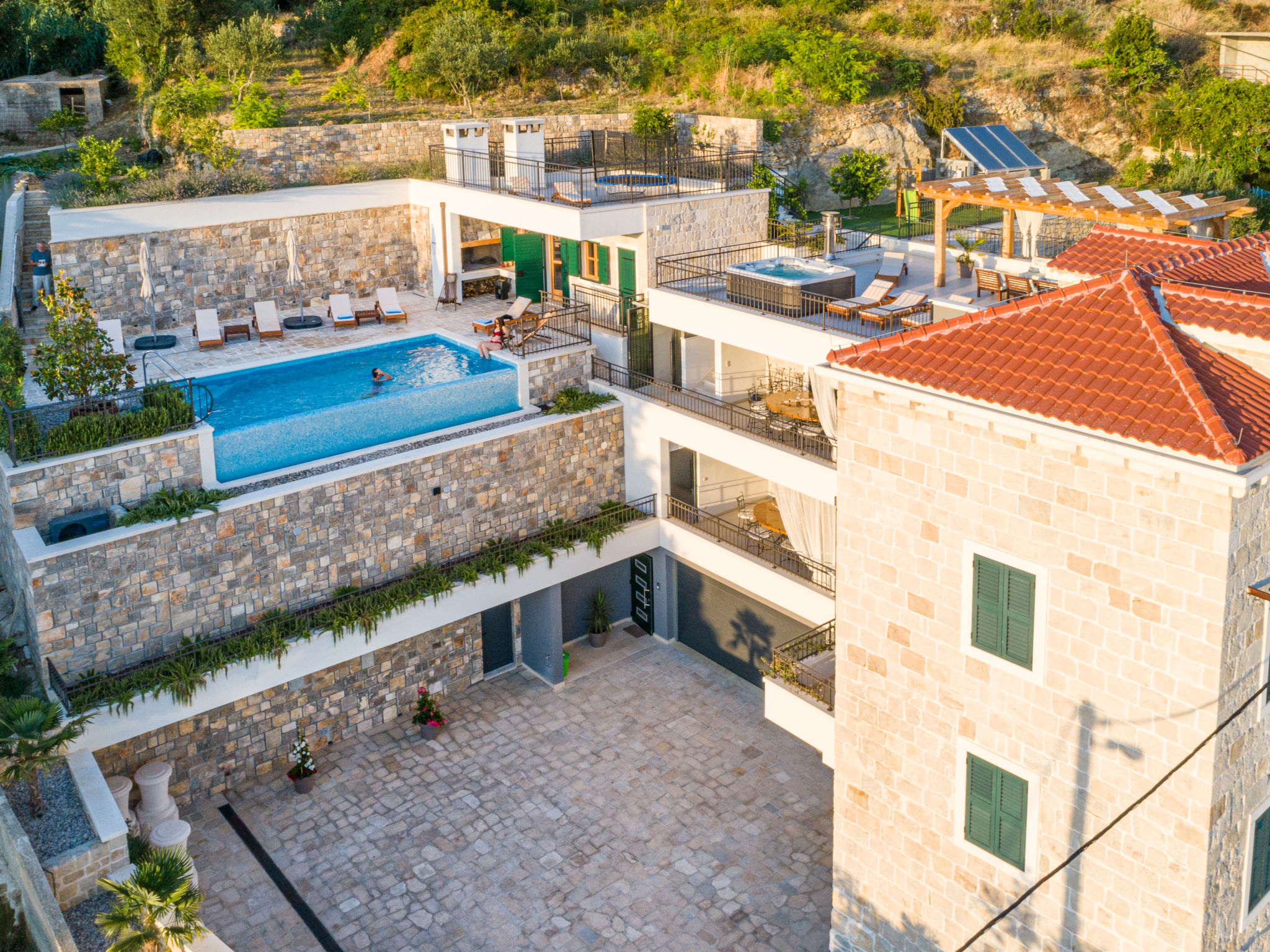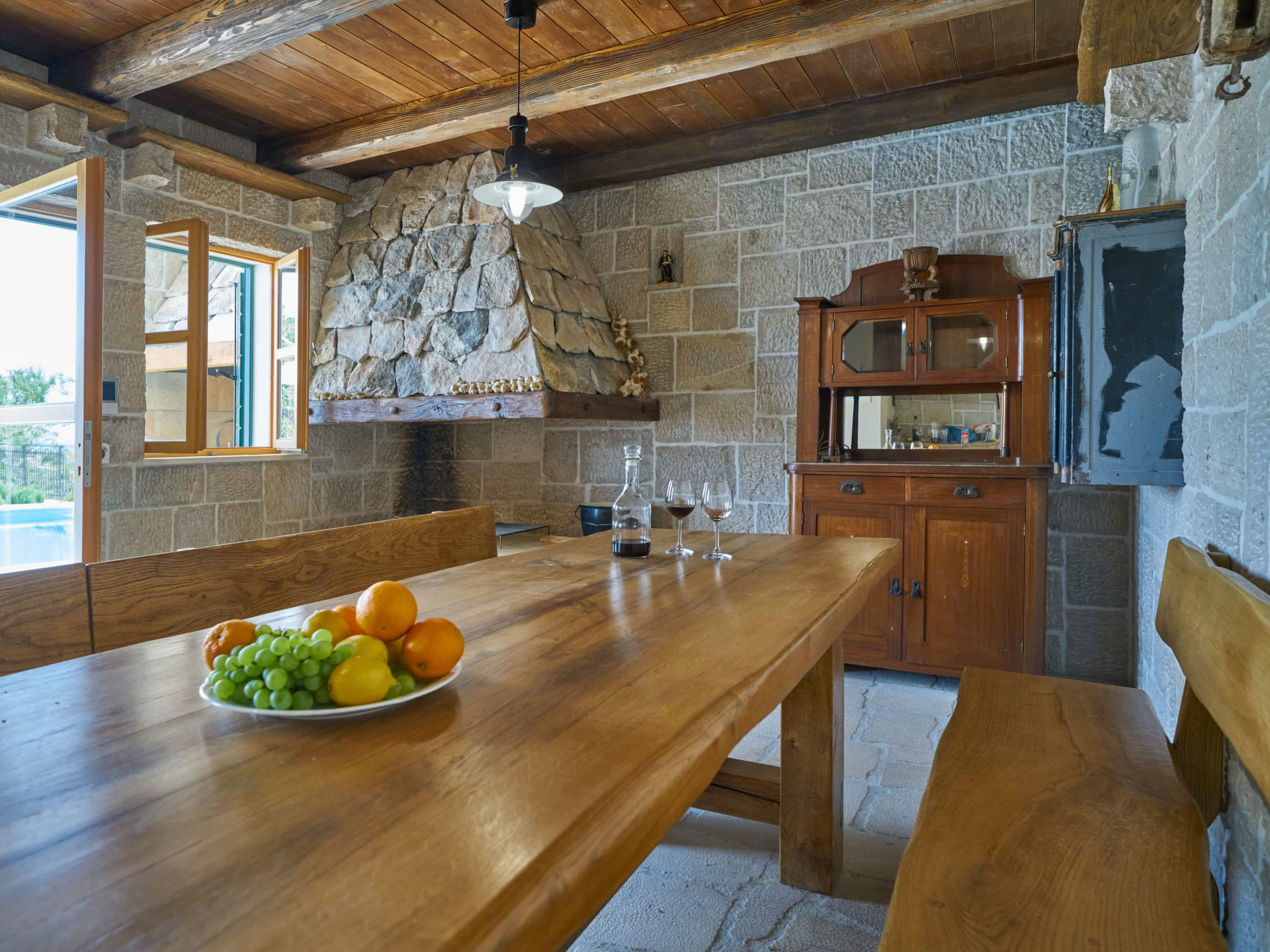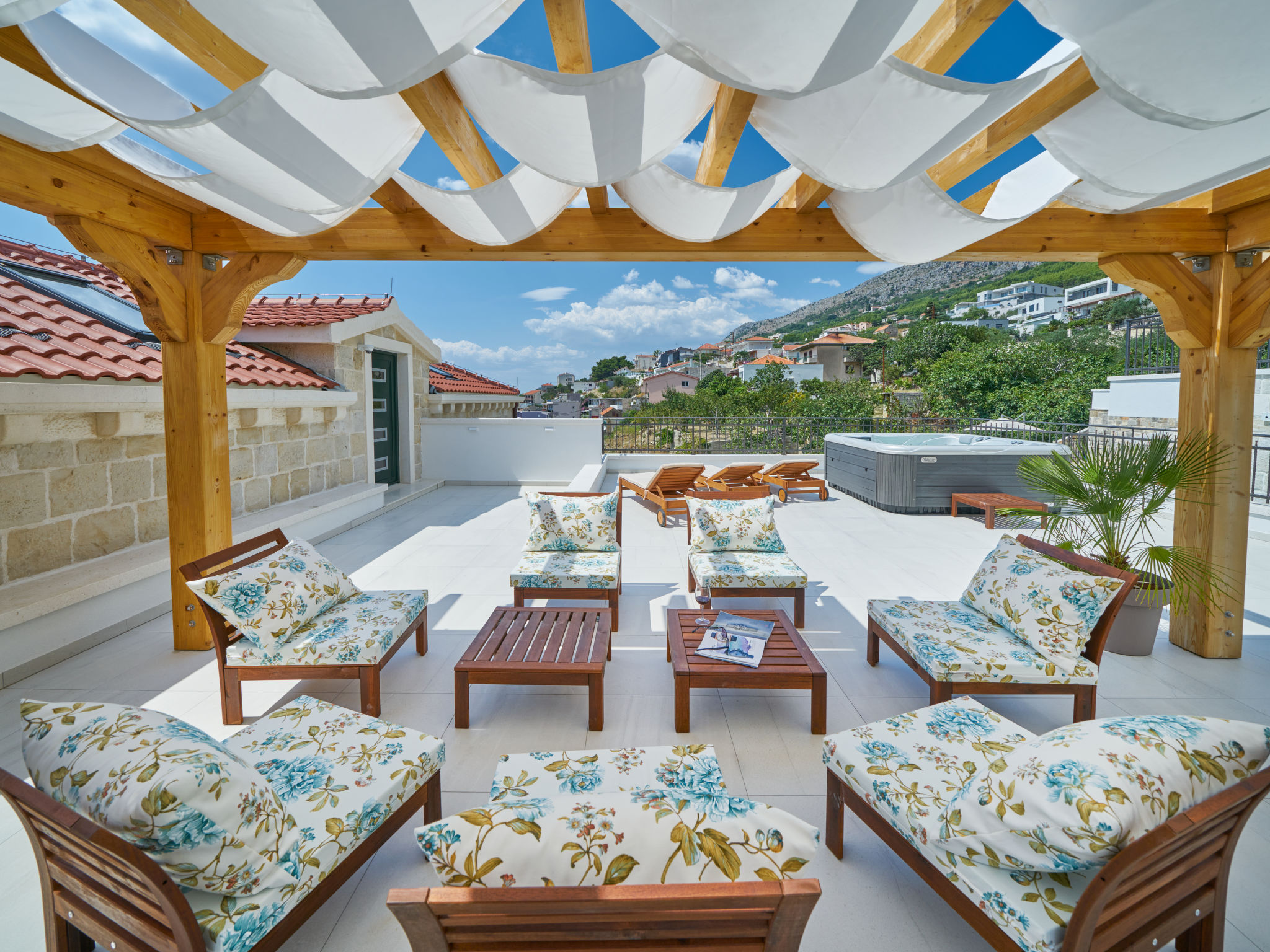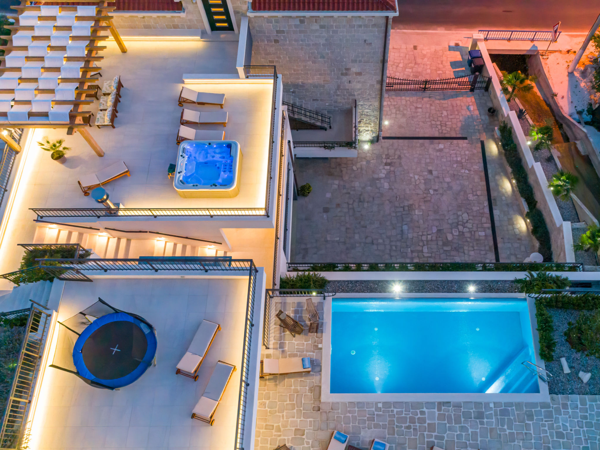 8-Zimmer-Villa 280 m2 auf 2 Stockwerken. Geräumig, schön eingerichtet: Wohn-/Esszimmer mit offenem Kamin und Sat-TV (Flachbildschirm), Klimaanlage. Ausgang zur Terrasse. 2 Zimmer, jedes Zimmer mit 1 franz. Bett (180 cm, Länge 200 cm), Dusche/WC und Sat-TV (Flachbildschirm). 1 Zimmer mit 2 Betten (90 cm, Länge 200 cm), Dusche/WC und Sat-TV (Flachbildschirm). Offene Küche (Backofen, Geschirrspüler, 4 Glaskeramikherd Platten, Toaster, Wasserkocher, Mikrowelle, Tiefkühler, elektrische Kaffeemaschine). Sep. WC. Obergeschoss: Wohn-/Esszimmer mit offenem Kamin und Sat-TV (Flachbildschirm). Ausgang zur Terrasse, zum Schwimmbad. 2 Zimmer, jedes Zimmer mit 1 franz. Bett (180 cm, Länge 200 cm), Dusche/WC und Sat-TV (Flachbildschirm). 1 Zimmer mit 2 Betten (90 cm, Länge 200 cm), Dusche/WC und Sat-TV (Flachbildschirm). Offene Küche (Backofen, Geschirrspüler, 4 Glaskeramikherd Platten, Toaster, Wasserkocher, Mikrowelle, Tiefkühler, elektrische Kaffeemaschine). Sep. WC. Bodenheizung. Balkon 10 m2, 2 Terrassen 20 m2, überdacht. Terrassenmöbel, Liegestühle. Schöne Sicht auf das Meer. Zur Verfügung: Safe, Bügeleisen, Kinderhochstuhl, Babybett, Haartrockner. Internet (Wireless LAN, gratis). Bitte beachten: Rauchmelder, Feuerlöscher.