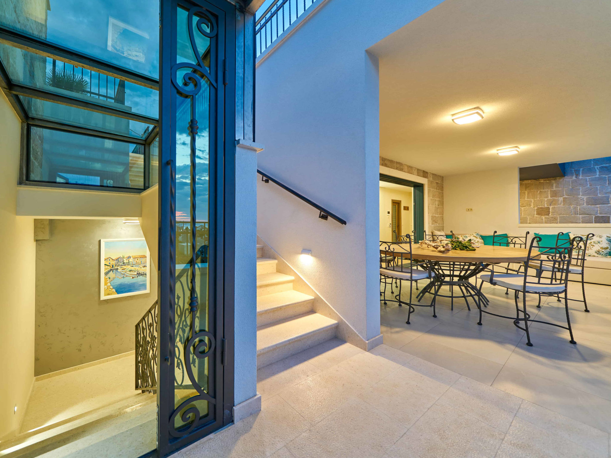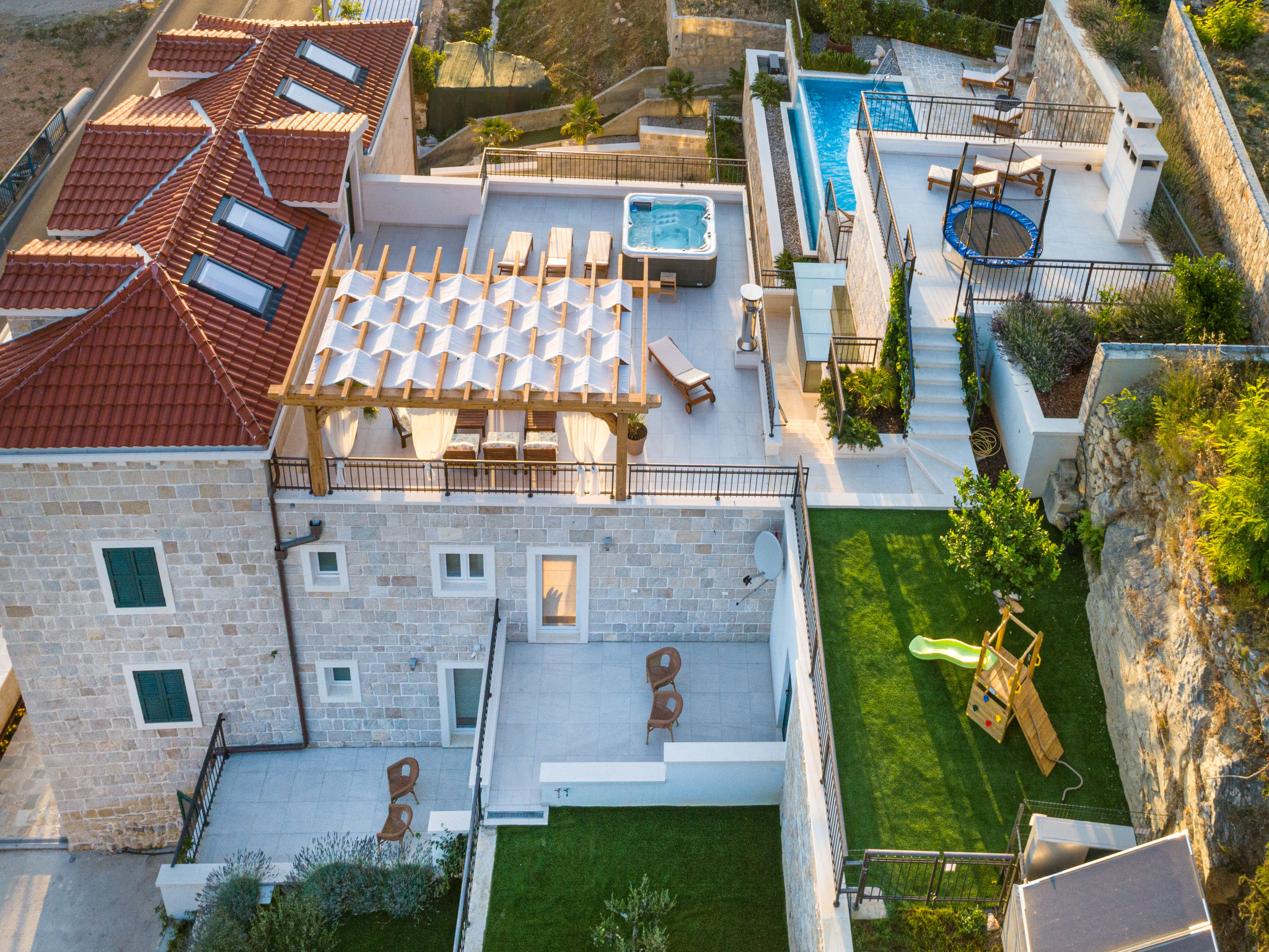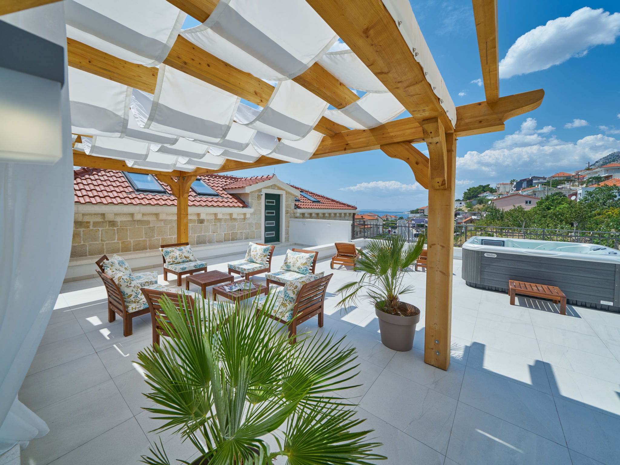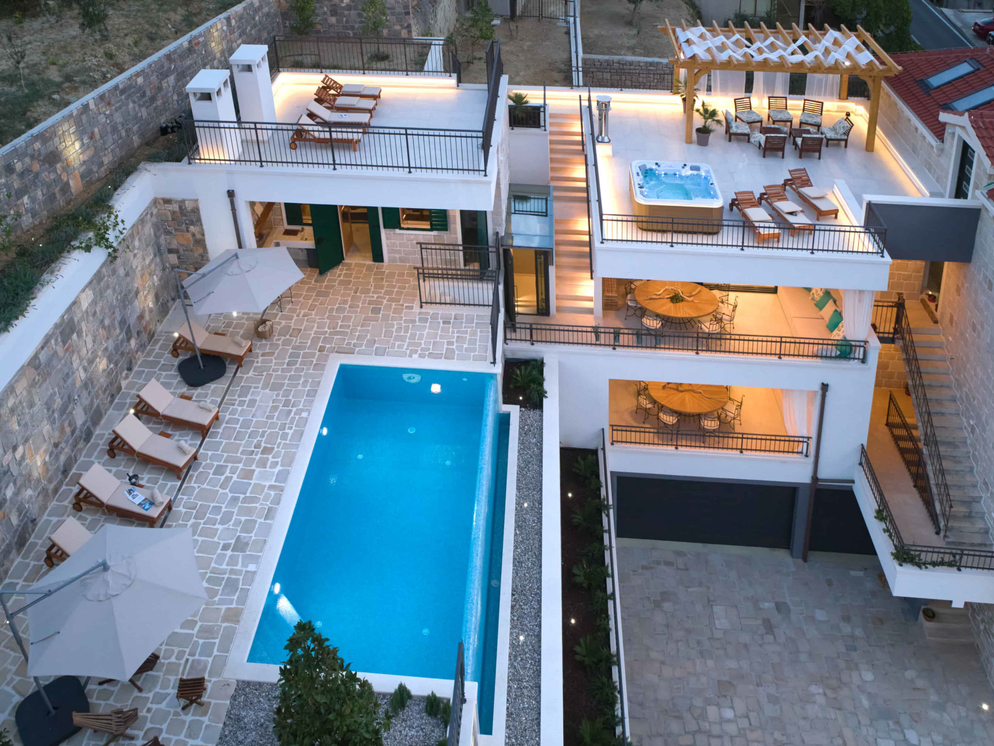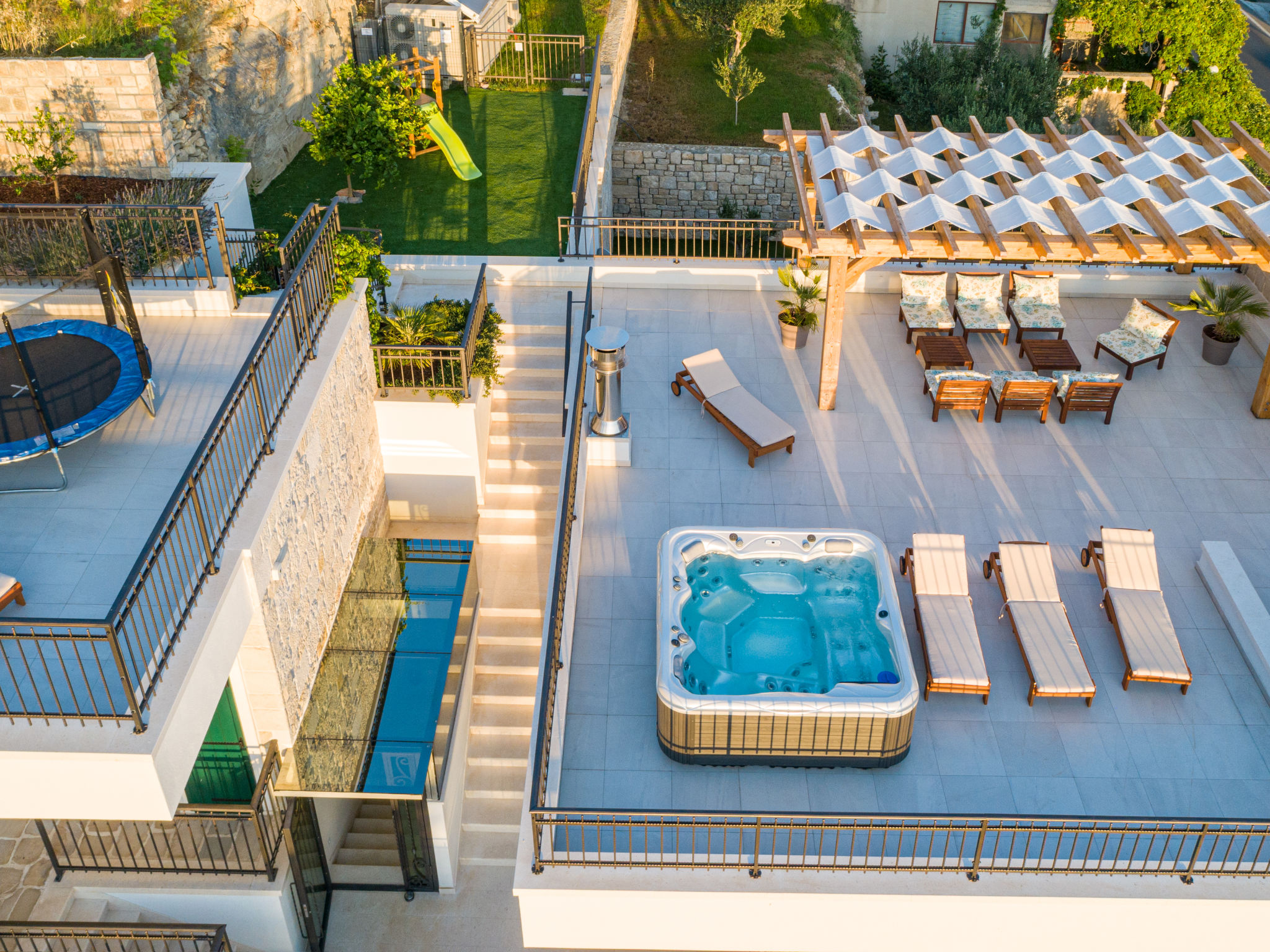 8-Zimmer-Villa 280 m2 auf 2 Stockwerken. Geräumig, schön eingerichtet: Wohn-/Esszimmer mit offenem Kamin und Sat-TV (Flachbildschirm), Klimaanlage. Ausgang zur Terrasse. 2 Zimmer, jedes Zimmer mit 1 franz. Bett (180 cm, Länge 200 cm), Dusche/WC und Sat-TV (Flachbildschirm). 1 Zimmer mit 2 Betten (90 cm, Länge 200 cm), Dusche/WC und Sat-TV (Flachbildschirm). Offene Küche (Backofen, Geschirrspüler, 4 Glaskeramikherd Platten, Toaster, Wasserkocher, Mikrowelle, Tiefkühler, elektrische Kaffeemaschine). Sep. WC. Obergeschoss: Wohn-/Esszimmer mit offenem Kamin und Sat-TV (Flachbildschirm). Ausgang zur Terrasse, zum Schwimmbad. 2 Zimmer, jedes Zimmer mit 1 franz. Bett (180 cm, Länge 200 cm), Dusche/WC und Sat-TV (Flachbildschirm). 1 Zimmer mit 2 Betten (90 cm, Länge 200 cm), Dusche/WC und Sat-TV (Flachbildschirm). Offene Küche (Backofen, Geschirrspüler, 4 Glaskeramikherd Platten, Toaster, Wasserkocher, Mikrowelle, Tiefkühler, elektrische Kaffeemaschine). Sep. WC. Bodenheizung. Balkon 10 m2, 2 Terrassen 20 m2, überdacht. Terrassenmöbel, Liegestühle. Schöne Sicht auf das Meer. Zur Verfügung: Safe, Bügeleisen, Kinderhochstuhl, Babybett, Haartrockner. Internet (Wireless LAN, gratis). Bitte beachten: Rauchmelder, Feuerlöscher.