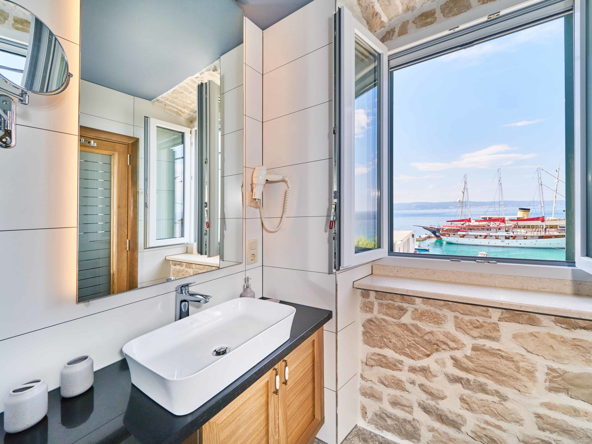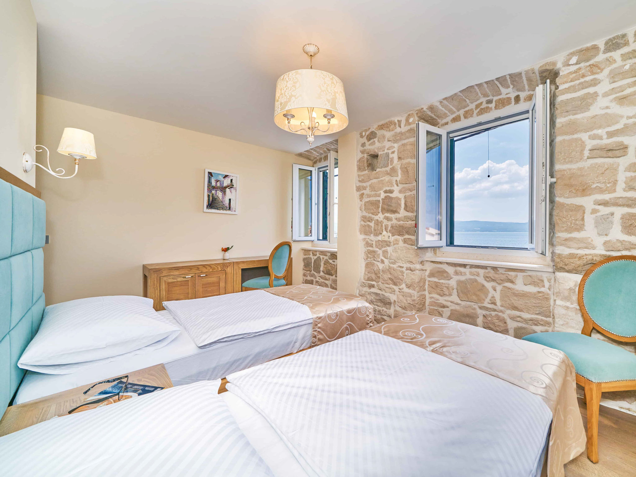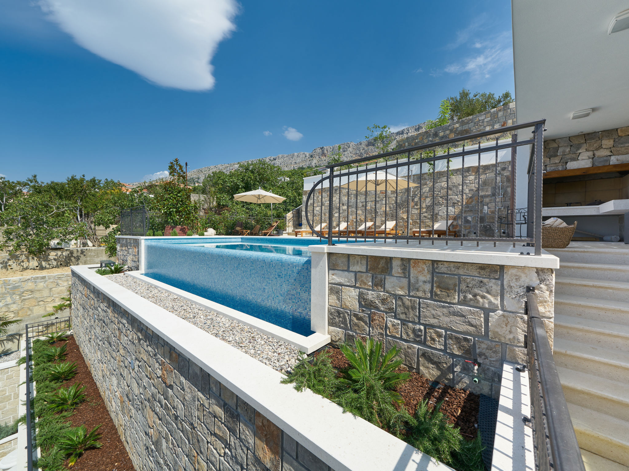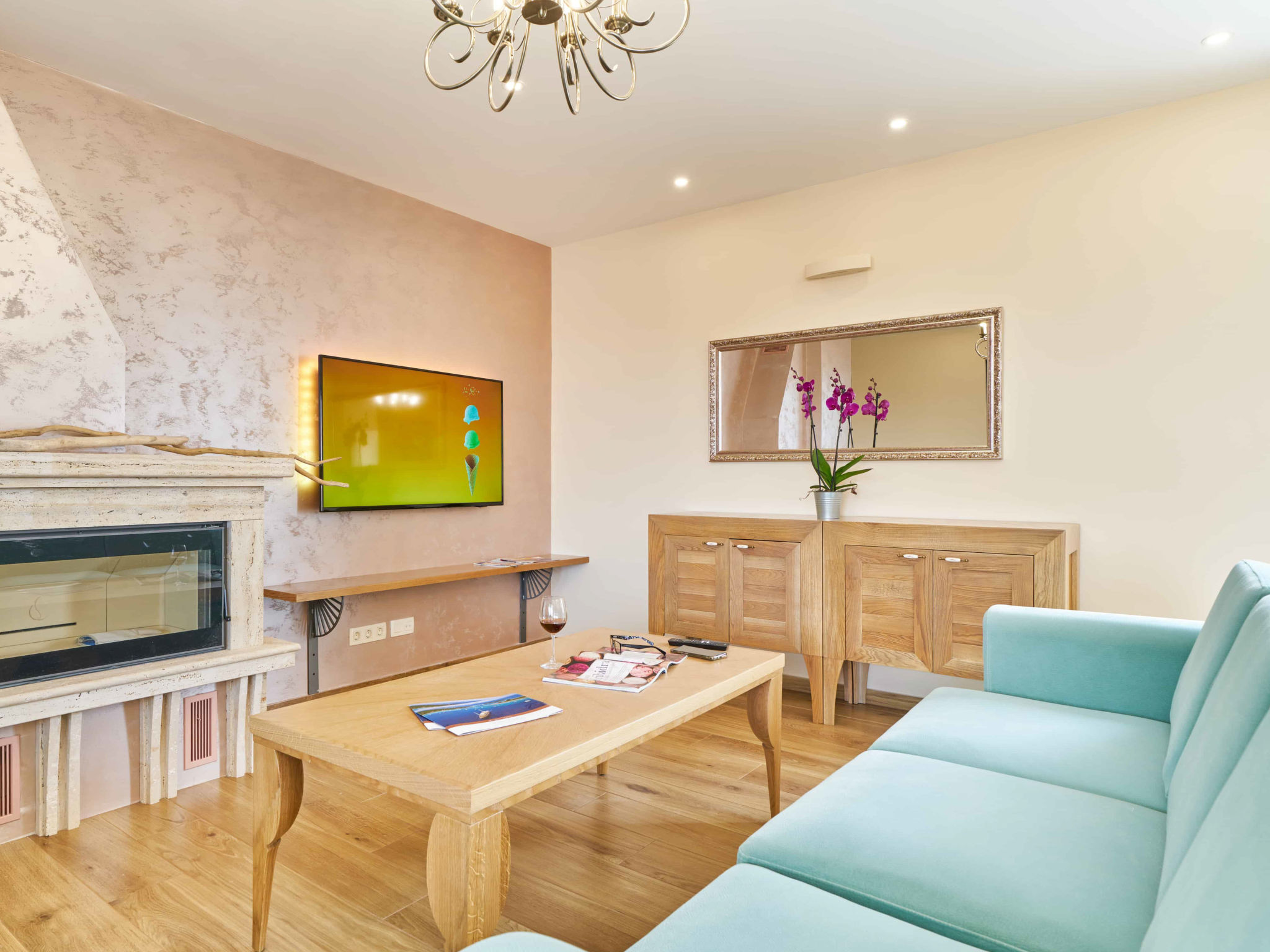 8-Zimmer-Villa 280 m2 auf 2 Stockwerken. Geräumig, schön eingerichtet: Wohn-/Esszimmer mit offenem Kamin und Sat-TV (Flachbildschirm), Klimaanlage. Ausgang zur Terrasse. 2 Zimmer, jedes Zimmer mit 1 franz. Bett (180 cm, Länge 200 cm), Dusche/WC und Sat-TV (Flachbildschirm). 1 Zimmer mit 2 Betten (90 cm, Länge 200 cm), Dusche/WC und Sat-TV (Flachbildschirm). Offene Küche (Backofen, Geschirrspüler, 4 Glaskeramikherd Platten, Toaster, Wasserkocher, Mikrowelle, Tiefkühler, elektrische Kaffeemaschine). Sep. WC. Obergeschoss: Wohn-/Esszimmer mit offenem Kamin und Sat-TV (Flachbildschirm). Ausgang zur Terrasse, zum Schwimmbad. 2 Zimmer, jedes Zimmer mit 1 franz. Bett (180 cm, Länge 200 cm), Dusche/WC und Sat-TV (Flachbildschirm). 1 Zimmer mit 2 Betten (90 cm, Länge 200 cm), Dusche/WC und Sat-TV (Flachbildschirm). Offene Küche (Backofen, Geschirrspüler, 4 Glaskeramikherd Platten, Toaster, Wasserkocher, Mikrowelle, Tiefkühler, elektrische Kaffeemaschine). Sep. WC. Bodenheizung. Balkon 10 m2, 2 Terrassen 20 m2, überdacht. Terrassenmöbel, Liegestühle. Schöne Sicht auf das Meer. Zur Verfügung: Safe, Bügeleisen, Kinderhochstuhl, Babybett, Haartrockner. Internet (Wireless LAN, gratis). Bitte beachten: Rauchmelder, Feuerlöscher.