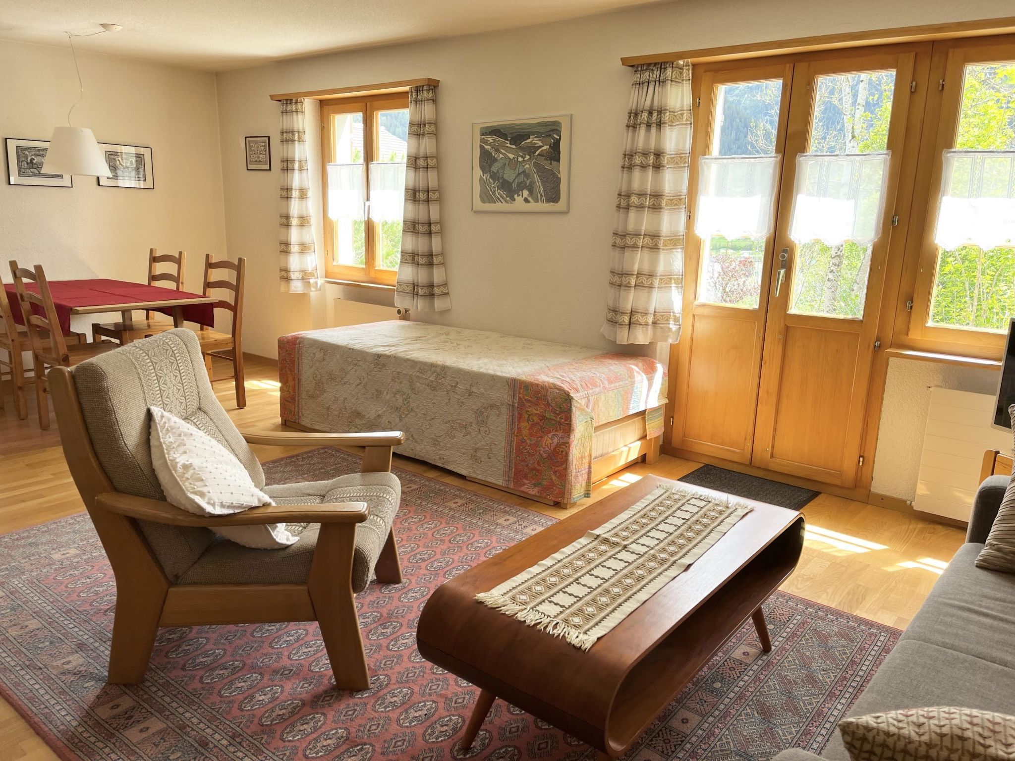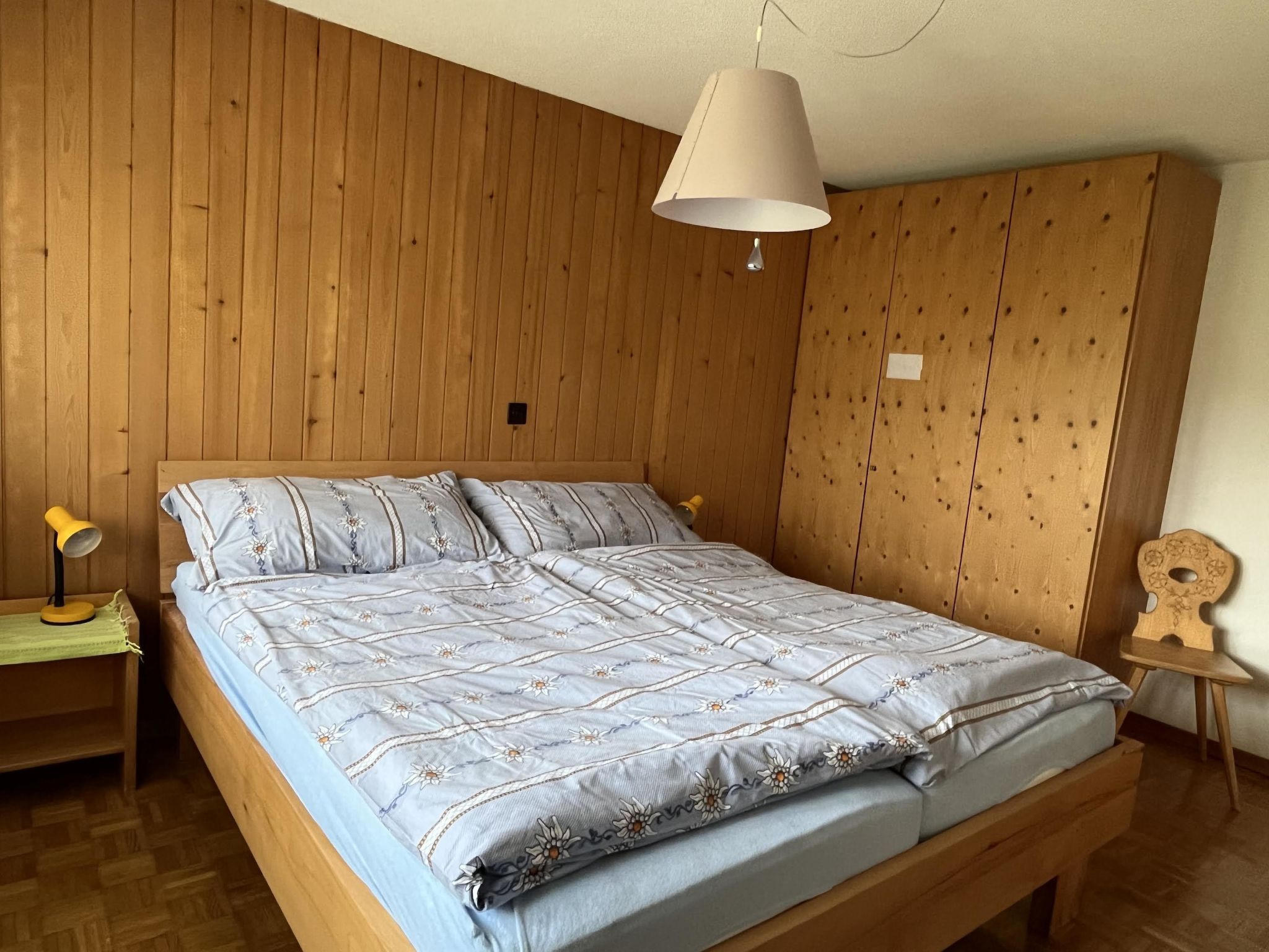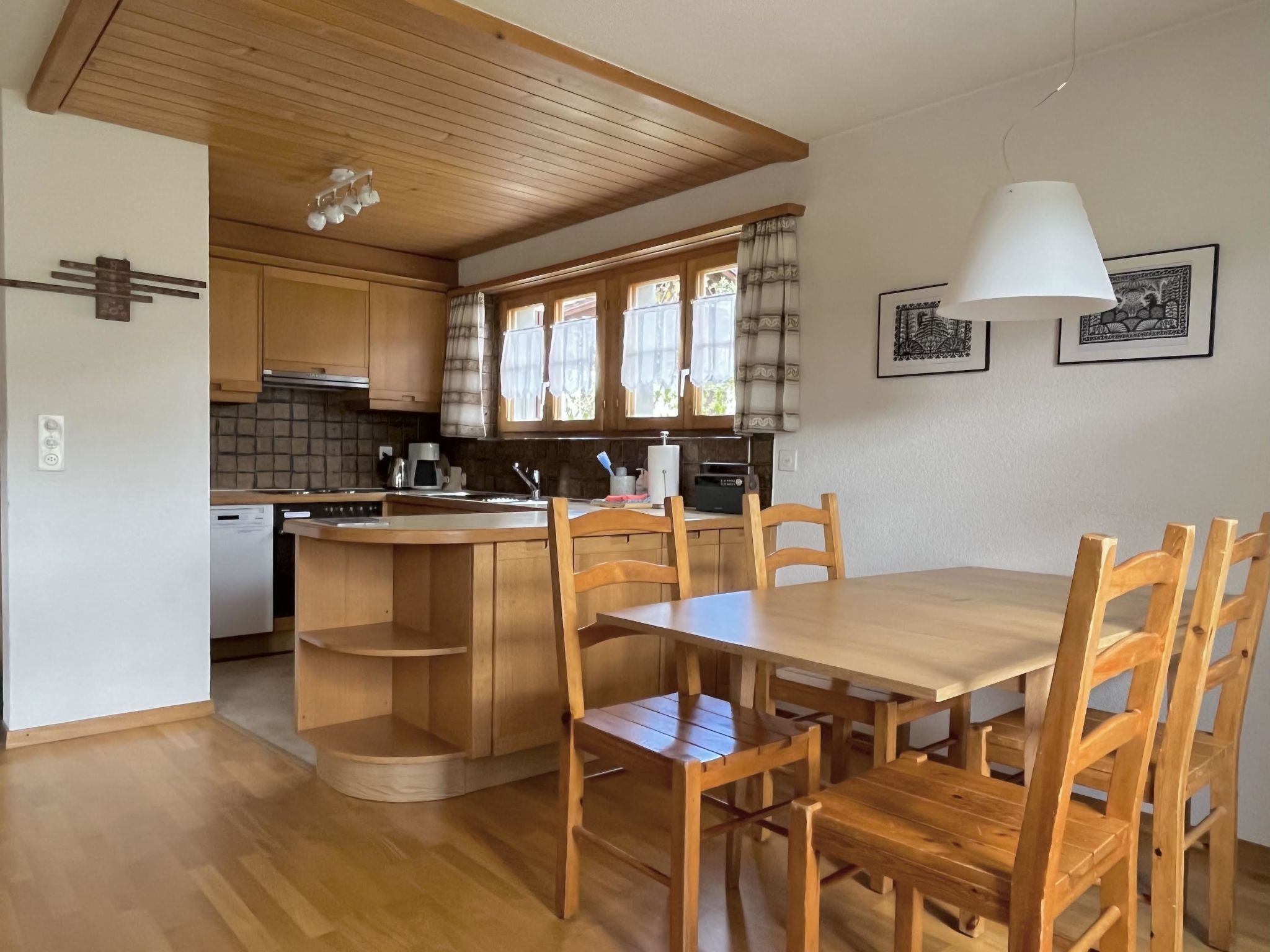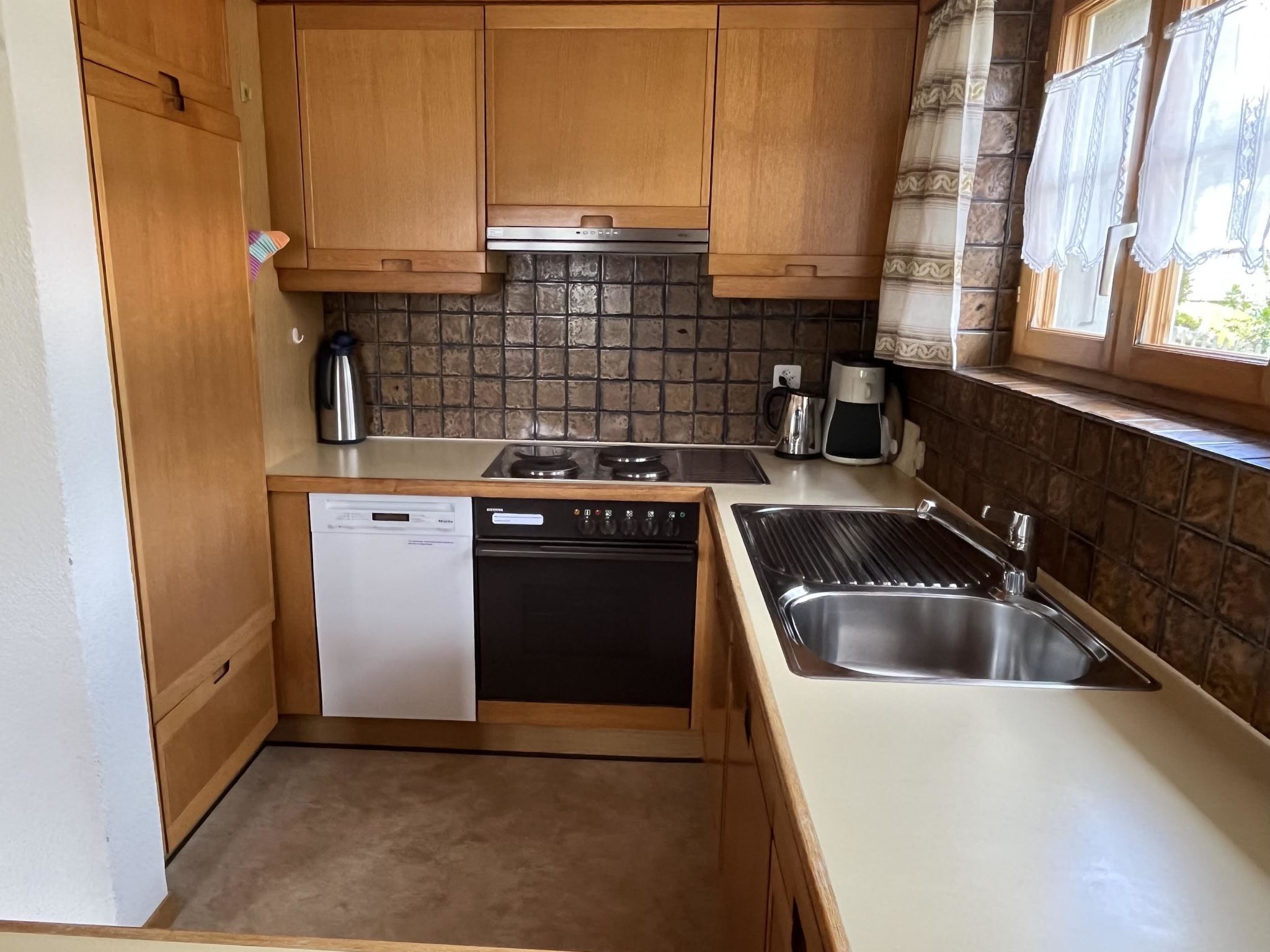 Wohnzimmer mit Sitzgruppe, Esstisch, TV/Radio, Telefon, WiFi, 1 Einzelbett (90x200cm) mit 1 Unterziehbett (90x200cm) und Ausziehsofa (140x190cm). Offene Küche mit Geschirrspüler, Filterkaffeemachine und Raclette-Set. 1 Schlafzimmer mit 2 zusammengeschobenen Einzelbetten (2x90x200cm) und Schrank. 1 Badezimmer mit Dusche/WC. Kinderbett (60x120cm) inkl. Bettwäsche und Kinderhochstuhl vorhanden.