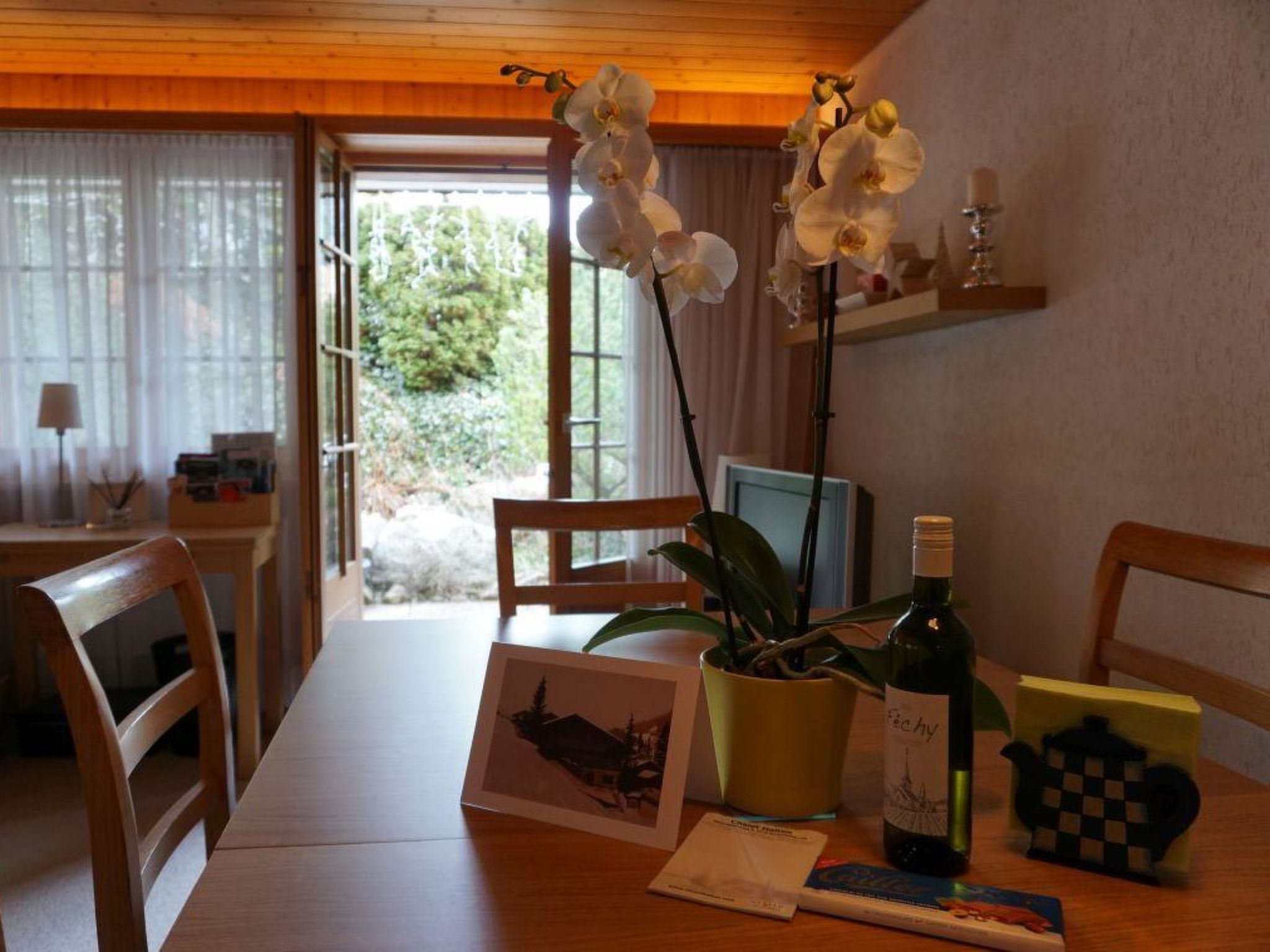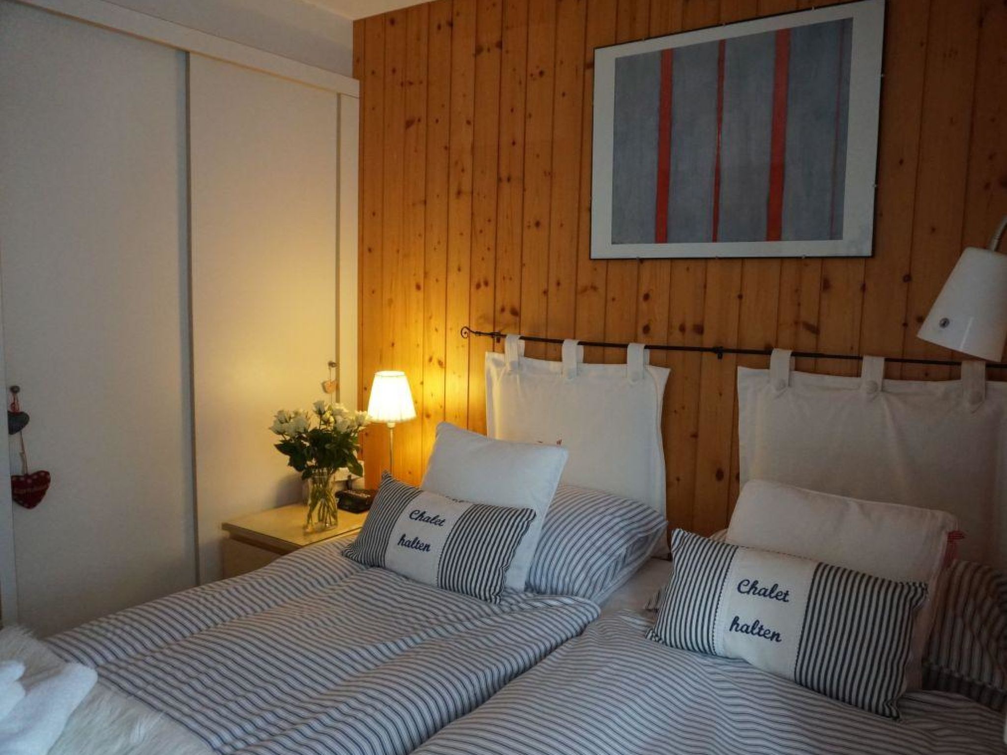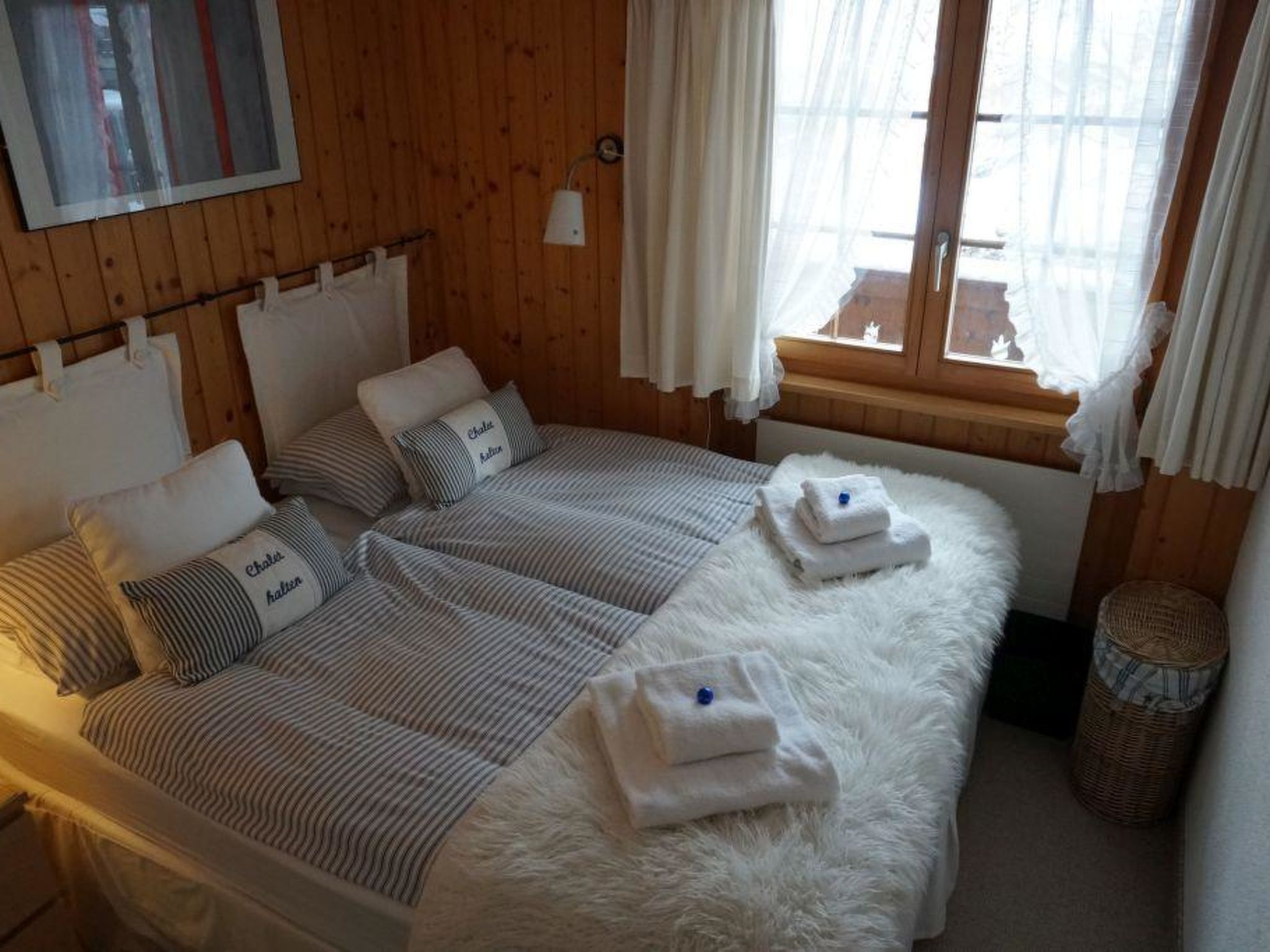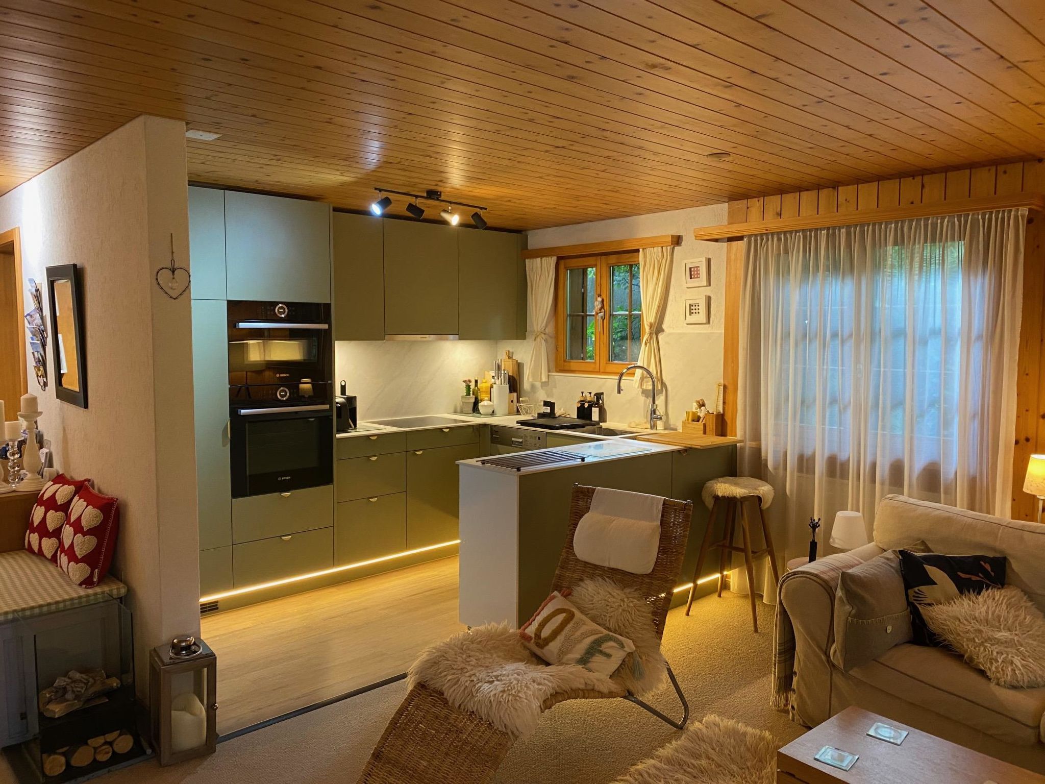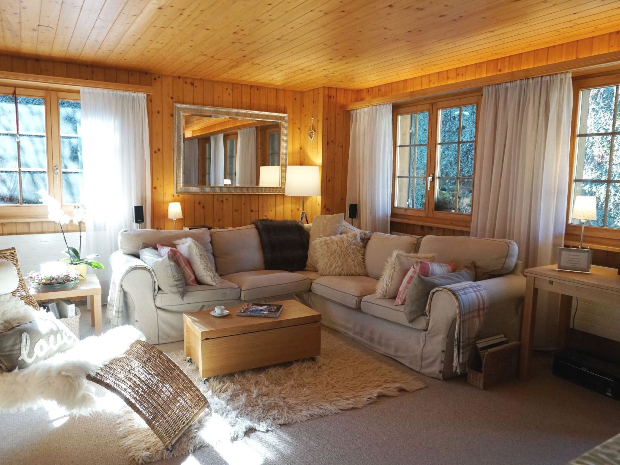 Wohn-/Esszimmer mit offener Küche (u.a. ausgestattet mit Kerramikherd, Backofen, Mikrowelle, Kühlschrank mit Gefrierfach, Geschierspülmaschine, Kapsel-Kaffeemaschine (Nespresso), Fondue- und Raclette-Set, Wasserkocher), Esstisch, Sitzgruppe und TV, Playstation (1), DVD/CD/Radio/Dolby surround System, kleinem Bio-Ethanol-Kamin. Beide Schlafzimmer haben Doppelbetten (2x90x190cm und 2x90x200cm). 1 Badezimmer mit Dusche/WC. WiFi. Kinderbett (71x112cm) inkl. Bettwäsche und Kinderhochstuhl vorhanden.