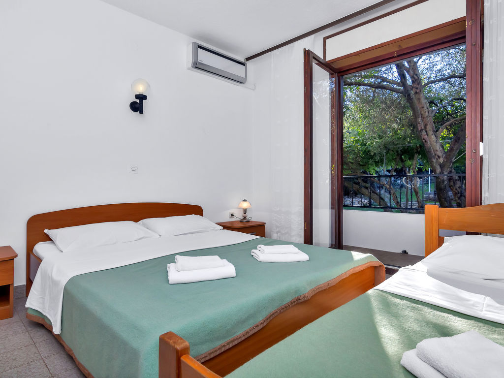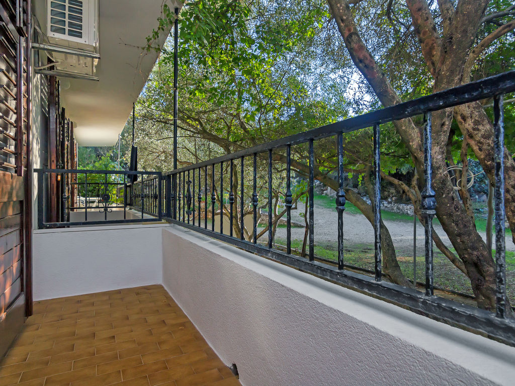 2-Zimmer-Wohnung 36 m2 im 1. Stock, Ostlage. Wohn-/Esszimmer mit Sat-TV (Flachbildschirm), Klimaanlage. Ausgang zur Terrasse. 1 Zimmer mit 1 Bett (90 cm, Länge 200 cm), 1 franz. Bett (160 cm, Länge 200 cm), Dusche/WC, Sat-TV und Klimaanlage. Ausgang zum Balkon. Offene Küche (Backofen, 2 Glaskeramikherd Platten, Tiefkühler). Dusche/WC. Klimaanlage (extra). Balkon 4 m2, Terrasse 8 m2, überdacht. Terrassenmöbel. Herrliche Sicht auf das Meer. Zur Verfügung: Internet (Wireless LAN, gratis). 1 Haustier/Hund erlaubt.