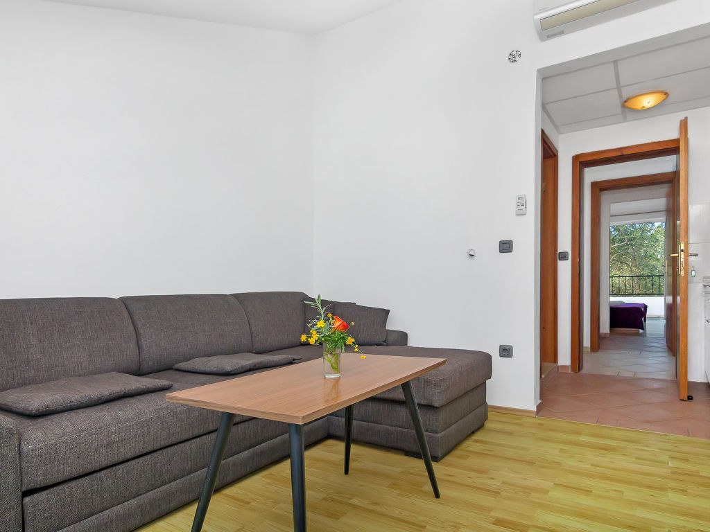 2-Zimmer-Wohnung 36 m2 im 2. Stock, Ostlage. Wohn-/Esszimmer mit Sat-TV und Klimaanlage. Ausgang zur Terrasse. 1 Zimmer mit 1 Diwanbett (90 cm, Länge 200 cm), 1 franz. Bett (160 cm, Länge 200 cm), Dusche/WC, Sat-TV und Klimaanlage. Ausgang zum Balkon. Offene Küche (Backofen, 2 Glaskeramikherd Platten, Tiefkühler). Dusche/WC. Klimaanlage (extra). Balkon 4 m2, Terrasse 8 m2. Terrassenmöbel. Herrliche Sicht auf das Meer. Zur Verfügung: Internet (Wireless LAN, gratis). 1 Haustier/Hund erlaubt.