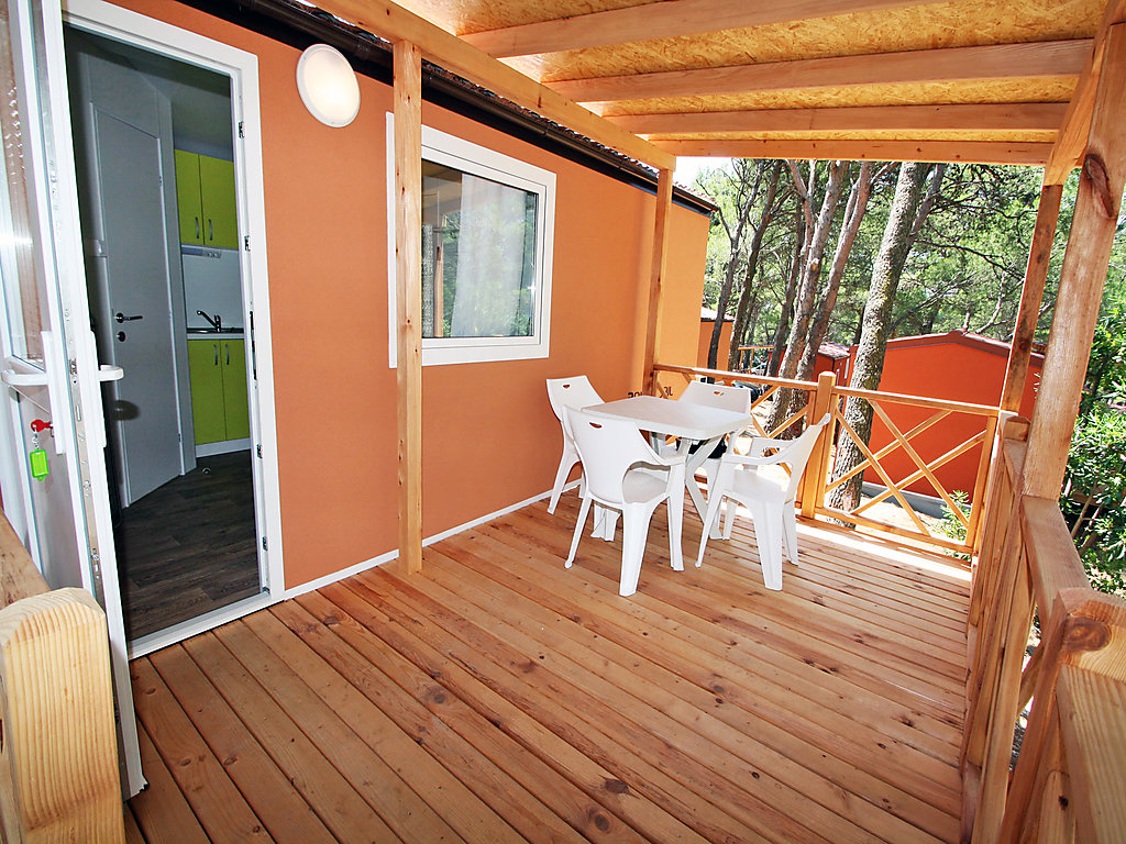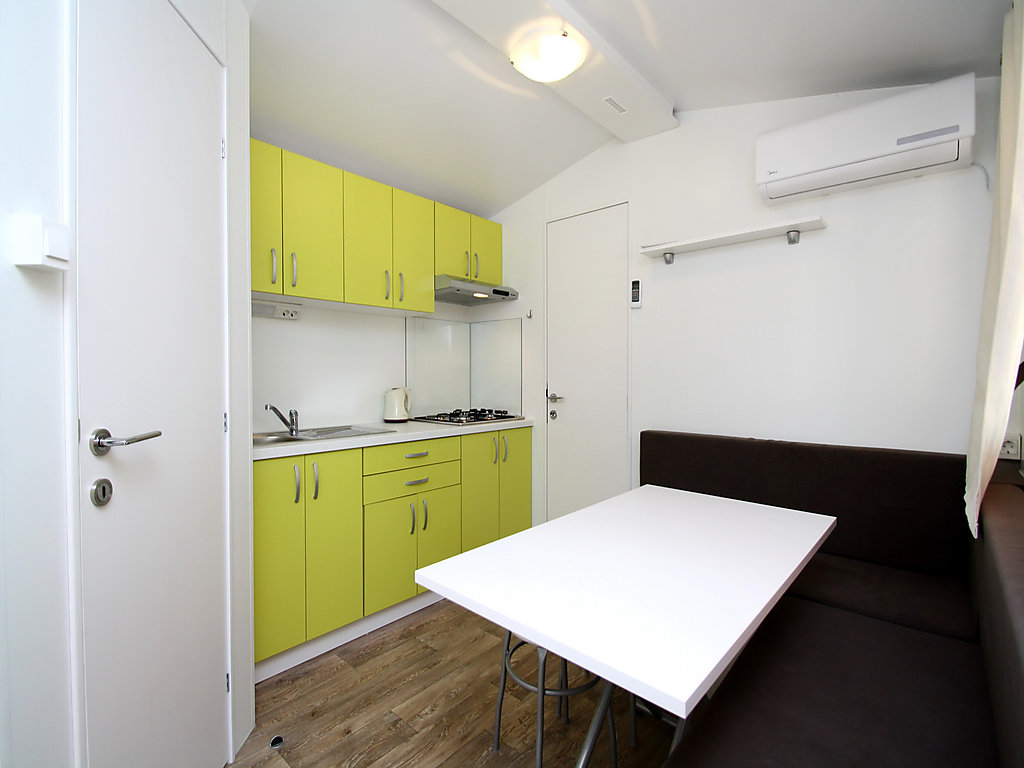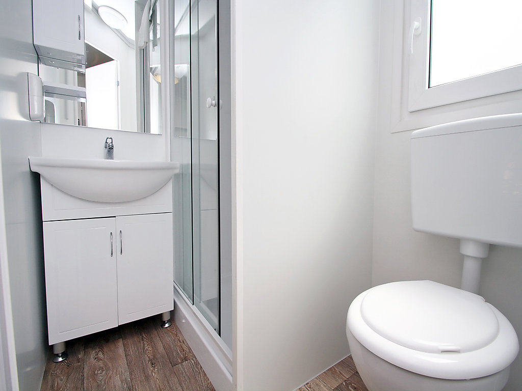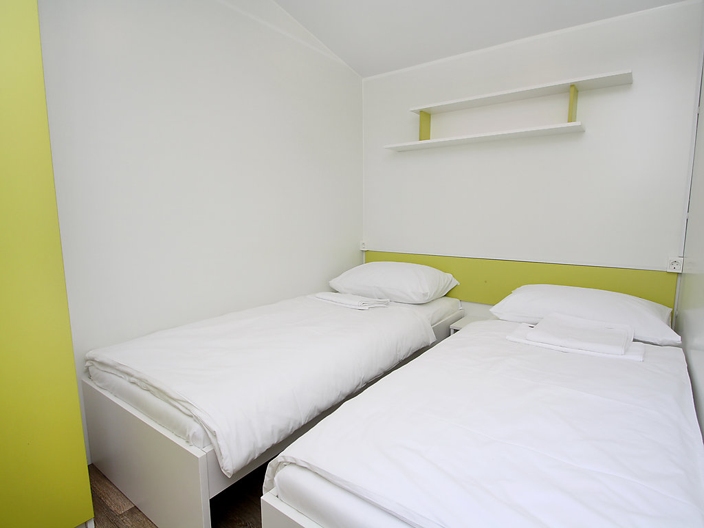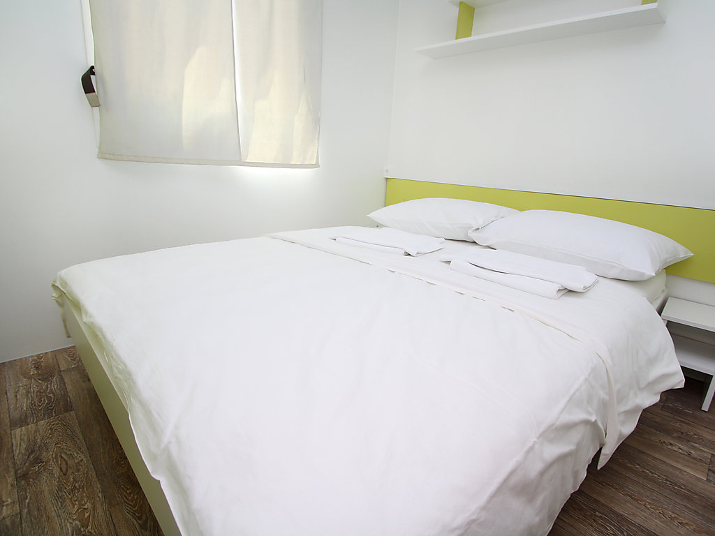 3-Zimmer-Mobilheim 24 m2. Wohn-/Esszimmer mit Sat-TV (Flachbildschirm). Ausgang zur Terrasse. 1 Zimmer mit 1 franz. Bett (140 cm, Länge 200 cm). 1 Zimmer mit 2 Betten (80 cm, Länge 200 cm). Offene Küche (4 Kochplatten, Tiefkühler). Dusche/WC. Terrasse 8 m2, überdacht. Terrassenmöbel. Zur Verfügung: Internet (Wireless LAN, gratis). Meer, Strand sind 80-200 m von den Wohnmobilen entfernt.