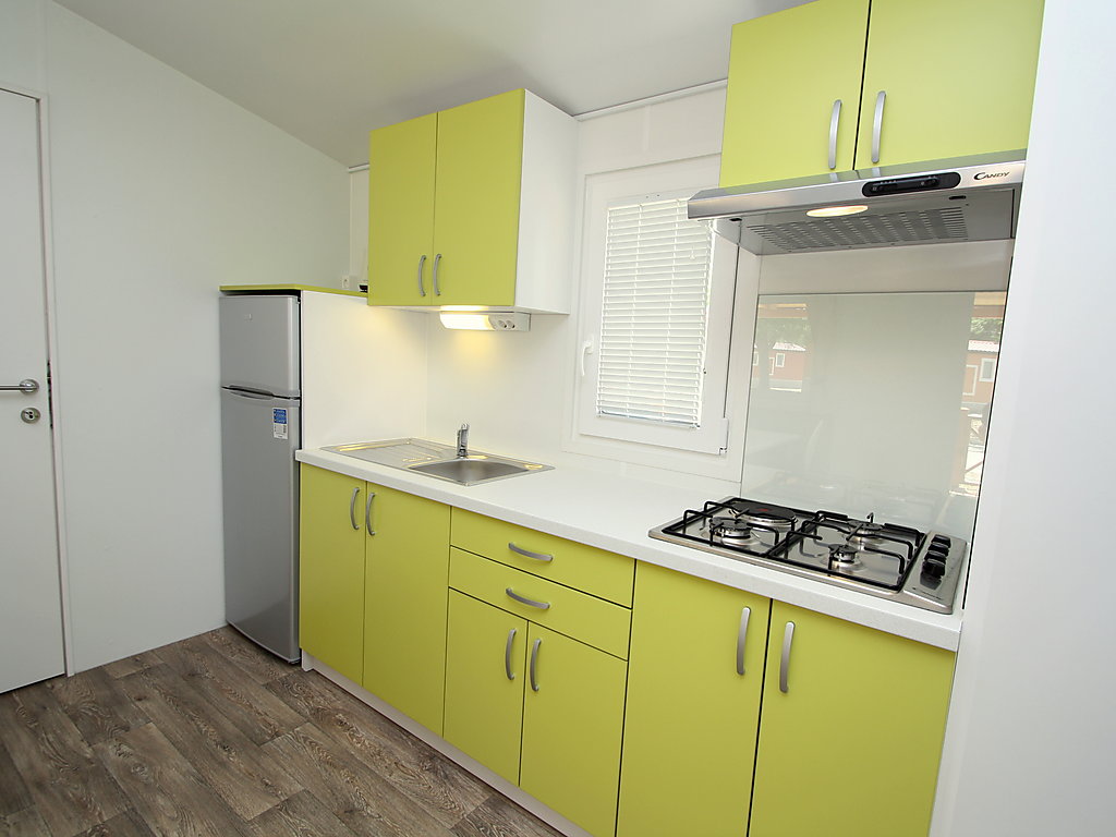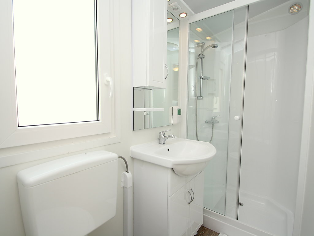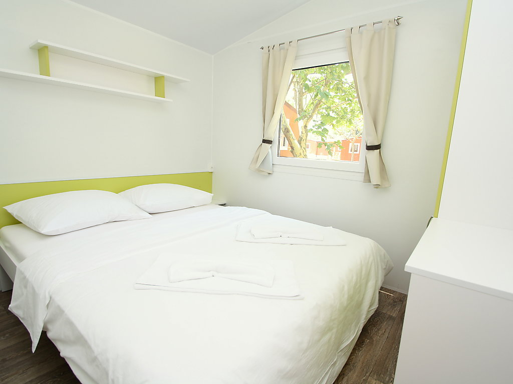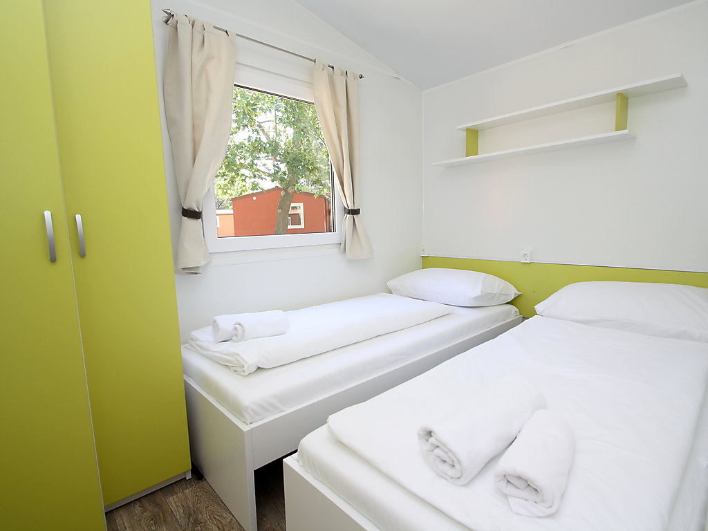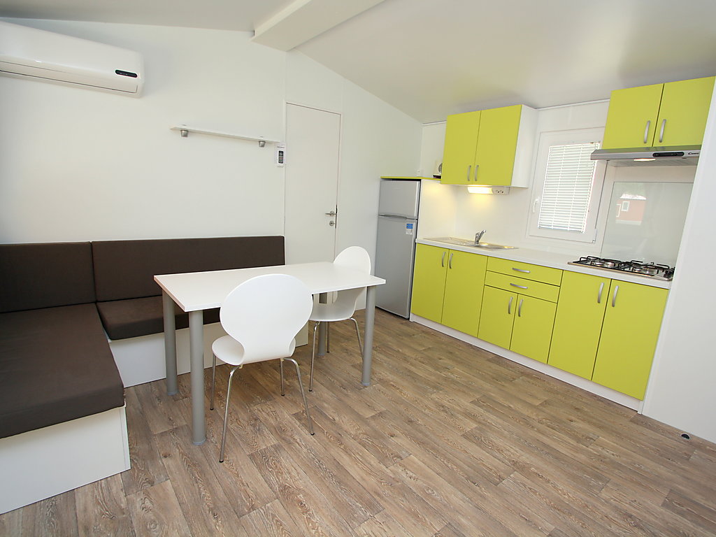 3-Zimmer-Mobilheim 32 m2. Wohn-/Esszimmer mit 1 Doppeldiwanbett (140 cm, Länge 190 cm), Sat-TV (Flachbildschirm), Klimaanlage. Ausgang zur Terrasse. 1 Zimmer mit 1 franz. Bett (2 x 80 cm, Länge 200 cm), Dusche/WC. 1 Zimmer mit 2 Betten (80 cm, Länge 200 cm). Offene Küche (4 Kochplatten). Dusche/WC. Terrasse 10 m2, überdacht. Terrassenmöbel. Zur Verfügung: Internet (Wireless LAN, gratis). Meer, Strand sind 80-200 m von den Wohnmobilen entfernt.