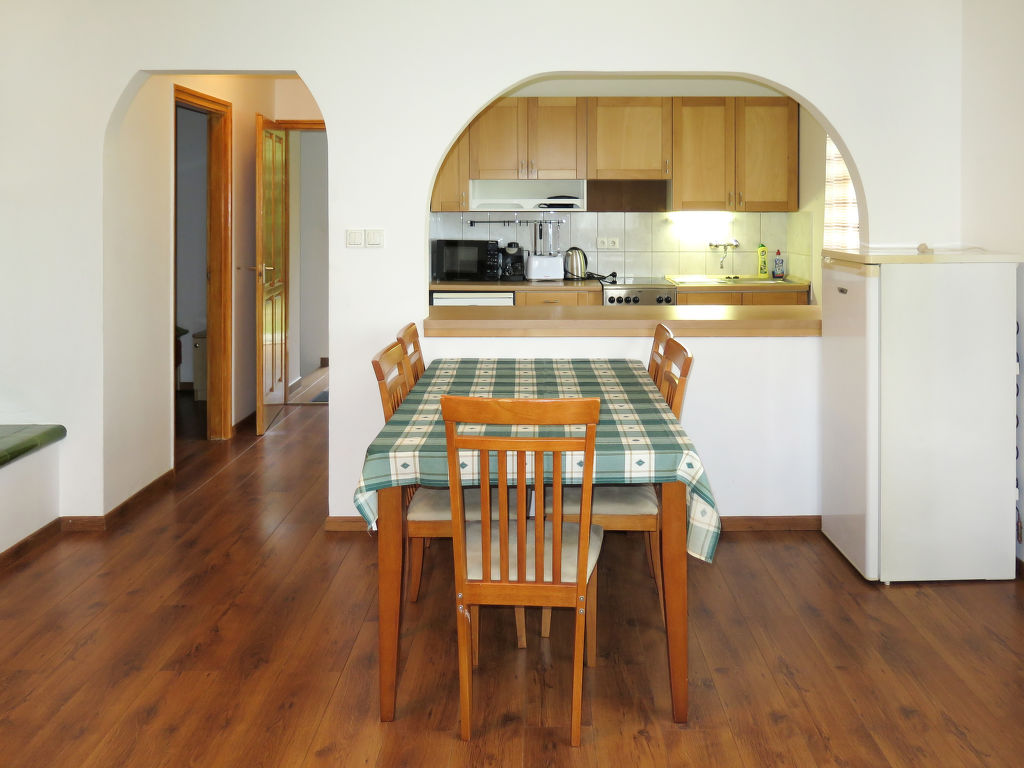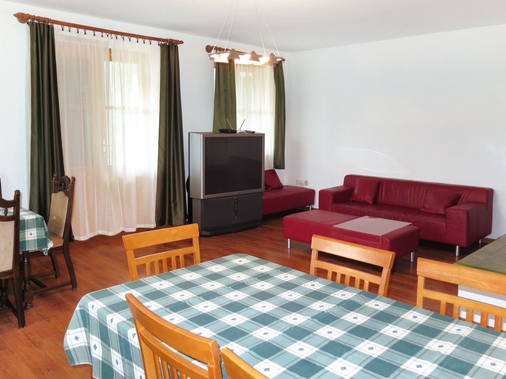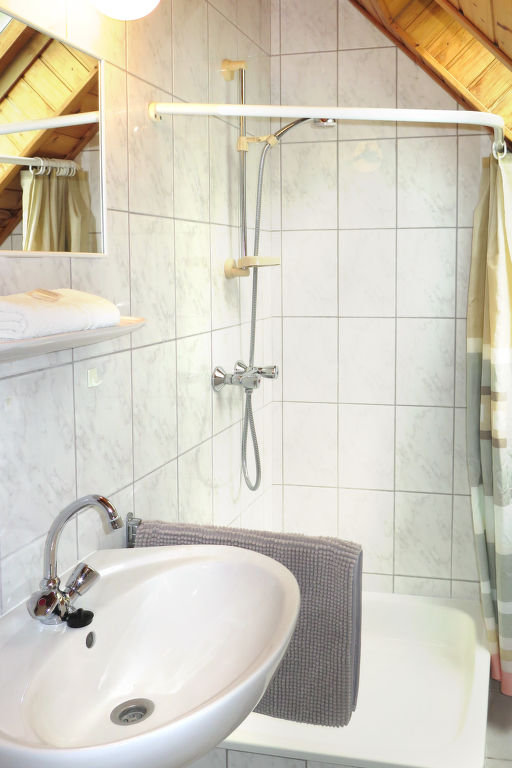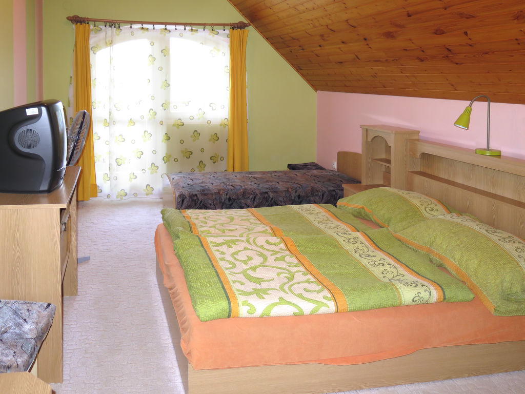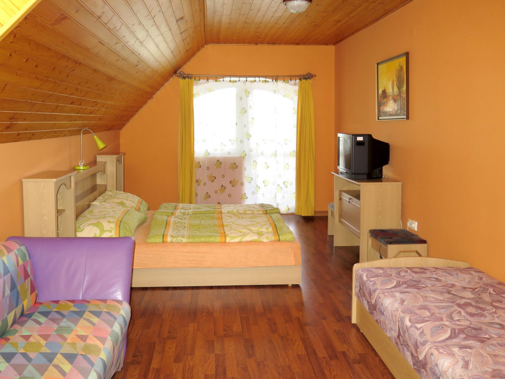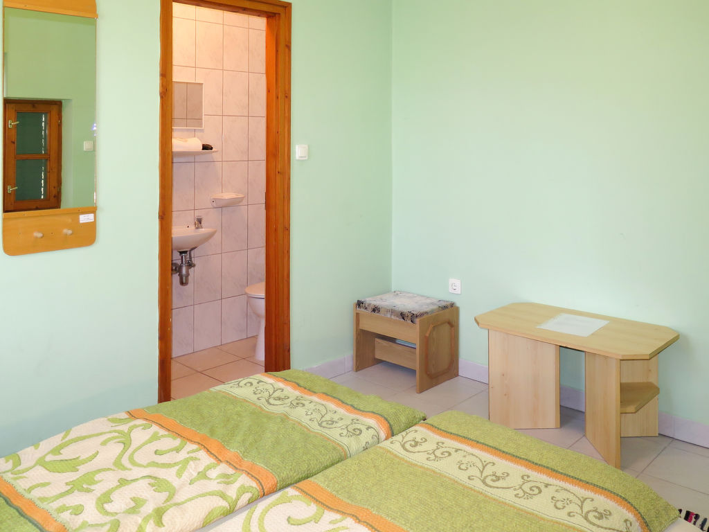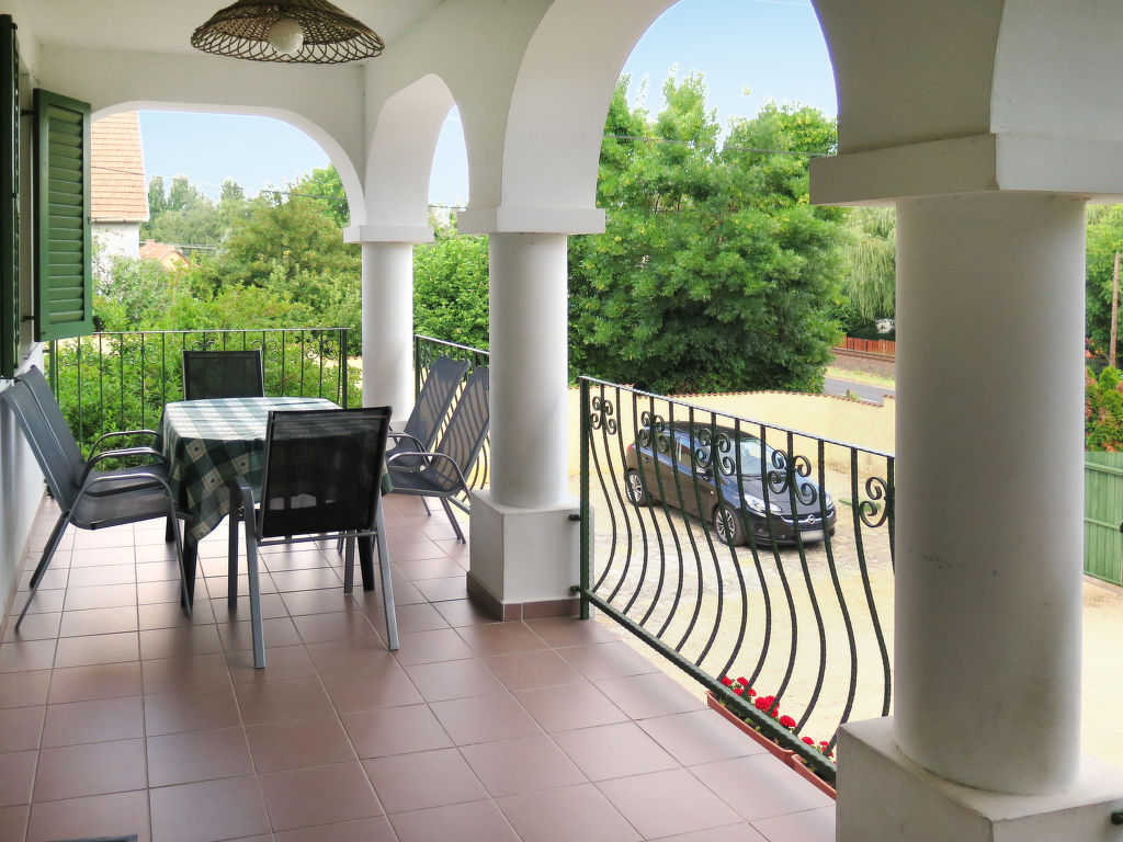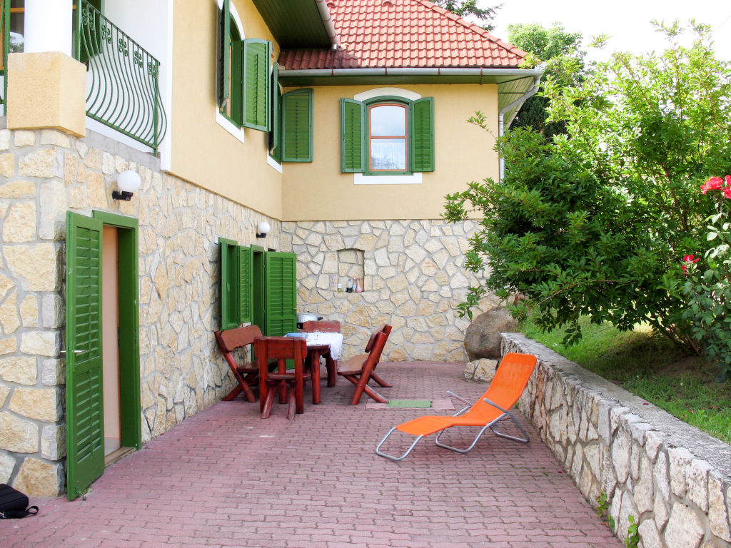 Grosses Einfamilienhaus "Sabine". 200 m vom Zentrum von Abrahamhegy, 5 km vom Zentrum von Badacsony, sonnige Lage am Hang, in einem Wohnquartier, 300 m vom See, an einer Strasse. Zur Alleinbenutzung: Grundstück 300 m2 (eingezäunt), gepflegter Garten mit Rasen und Bäumen. Treppenweg (20 Stufen) bis zum Haus. Parkplatz (für 3 Autos) auf dem Grundstück. Einkaufsgeschäft, Restaurant 200 m, Bahnstation "Abrahamhegy" 400 m, Grasstrand 300 m. Bitte beachten: Besitzer wohnt in separatem Hausteil. Eisenbahnlinie 80 m vom Haus.