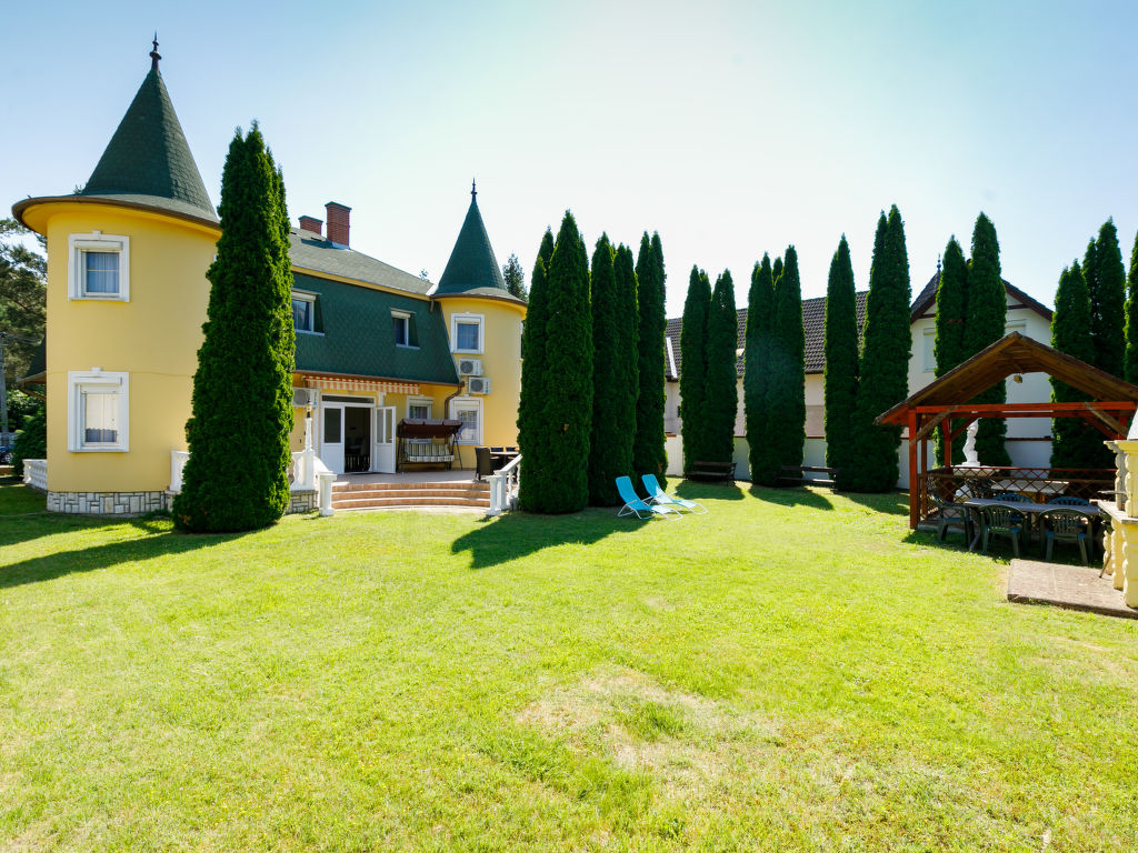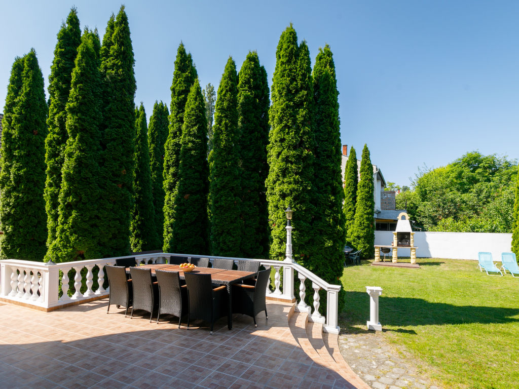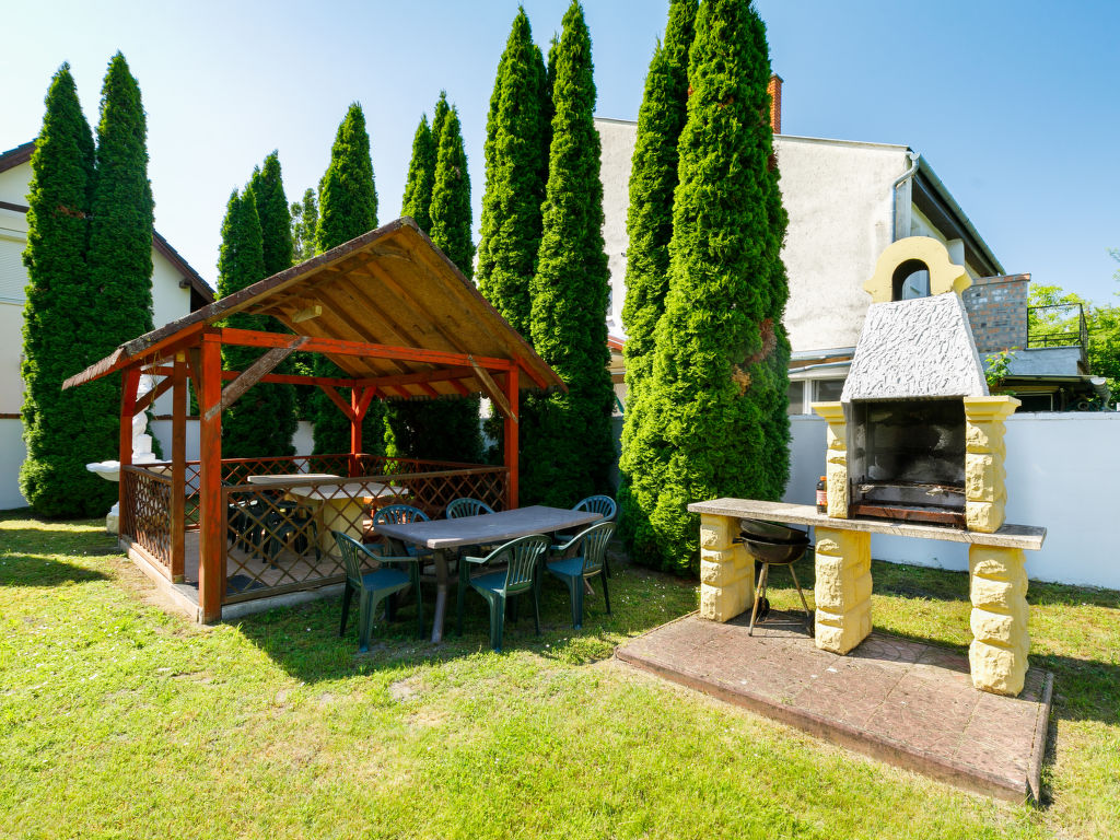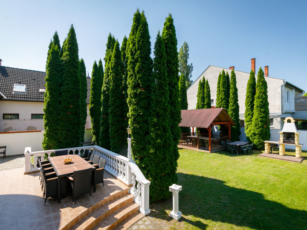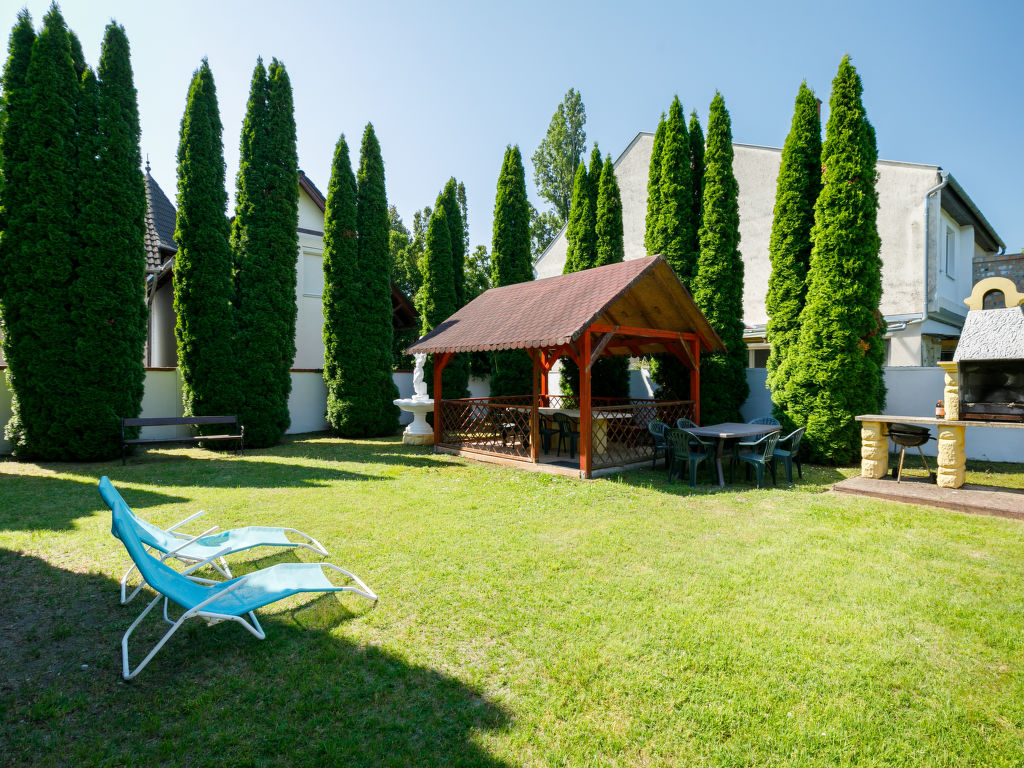 Balatonföldvár: Gemütliche Villa "Big Thuja", auf 2 Stockwerken, renoviert im Jahre 2021. Im Ort, zentrale Lage, 400 m vom See. Zur Alleinbenutzung: Grundstück (eingezäunt), Garten 600 m2 mit Rasen und Bäumen, Liegewiese. Sitzplatz, Grill. Im Hause: Wireless LAN, Klimaanlage. Supermarkt, Restaurant, Grasstrand 500 m. Sporthafen 600 m.