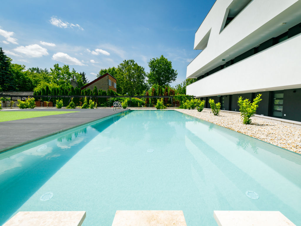 Balatonszemes 7 km von Balatonlelle: Modernes, schönes Appartementhaus, Baujahr 2020. Im Ort, zentrale Lage, 100 m vom See. Zur Mitbenutzung: Schwimmbad eckig beheizt (8 x 20 m, saisonale Verfügbarkeit: 15.Mai.-15.Sep.). Im Hause: Internetcafé, Wireless LAN, Fahrstuhl, Sonnenterrasse. Lebensmittelgeschäft 200 m, Restaurant 100 m, Bahnstation 450 m, Grasstrand 300 m. Sporthafen 100 m. Nahe gelegene Sehenswürdigkeiten: Tihany 14 km.