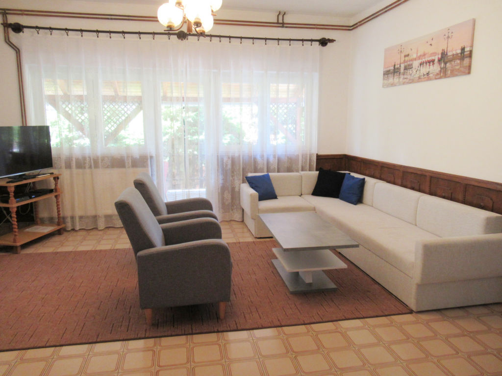 Grosses Einfamilienhaus "Fehervari". 1.3 km vom Zentrum von Balatonalmadi, am Ortsrand, sonnige Lage in einem Wohnquartier, 1.5 km vom See. Zur Alleinbenutzung: Grundstück 700 m2 (eingezäunt) mit Pflanzen, Wiese. Terrasse, Gartenmöbel, Grill, Feuerstelle, Parkplatz auf dem Grundstück. Einkaufsgeschäft 500 m, Restaurant 600 m, Sandstrand 1.5 km.