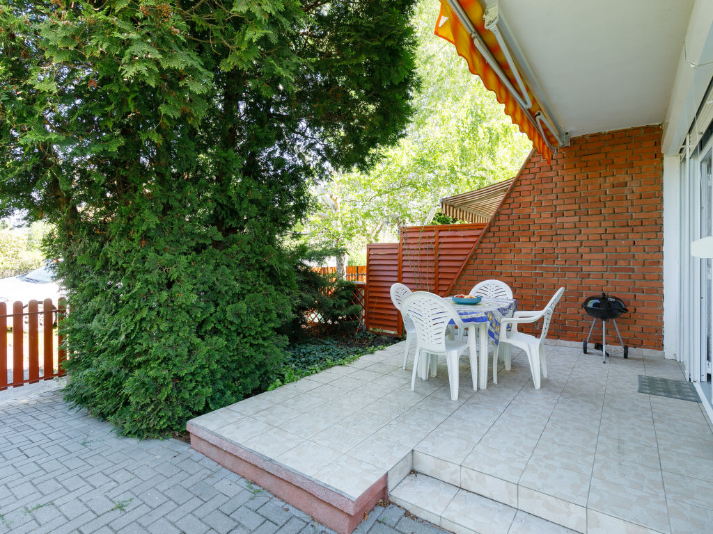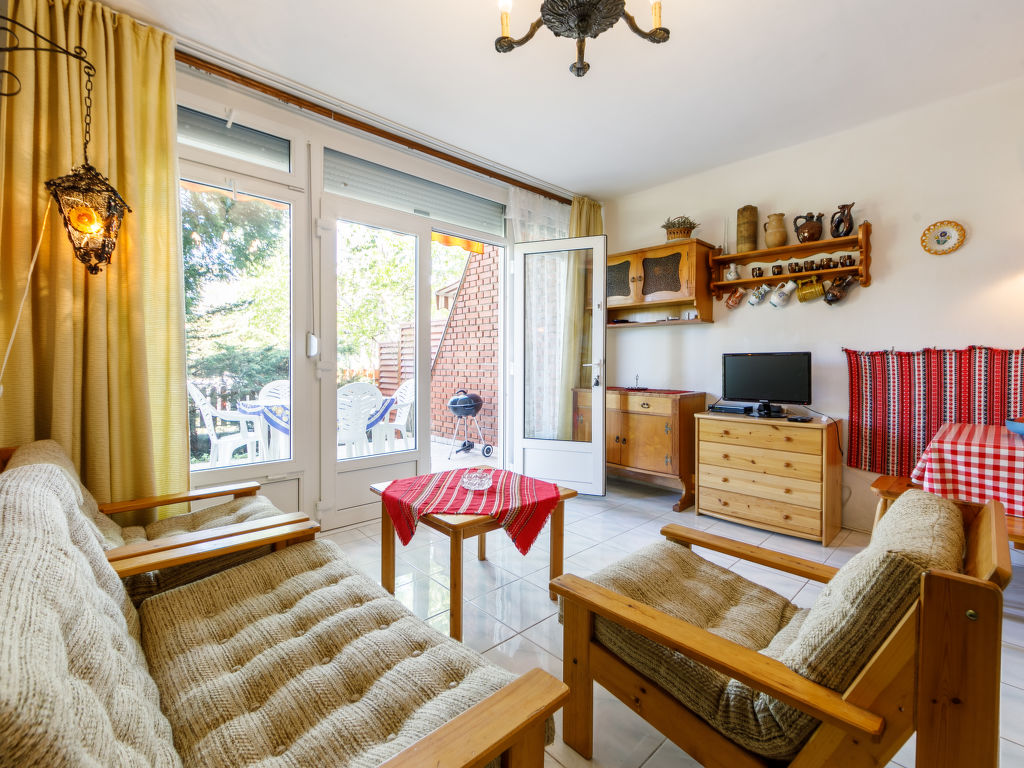 3-Zimmer-Doppelhaushälfte 56 m2. Zweckmässig eingerichtet: Wohnzimmer mit Sat-TV. Ausgang zur Terrasse. Offene Küche (2 Kochplatten). Bad/WC. Obergeschoss: 1 Zimmer mit 2 Betten. 1 Zimmer mit 2 Betten und Klimaanlage. Ausgang zum Balkon. Sep. WC. Balkon 6 m2, Terrasse 10 m2. Gartengrill (mobil), Liegestühle (2). Parkplatz (eingezäunt, 2 Autos). 1 Haustier/Hund erlaubt.