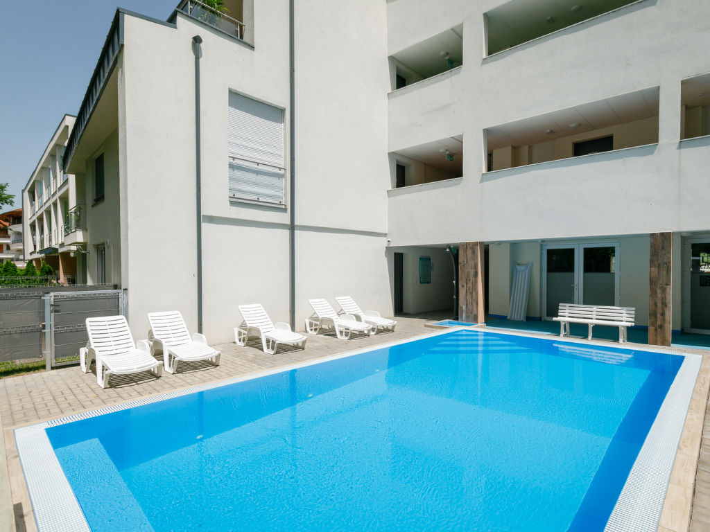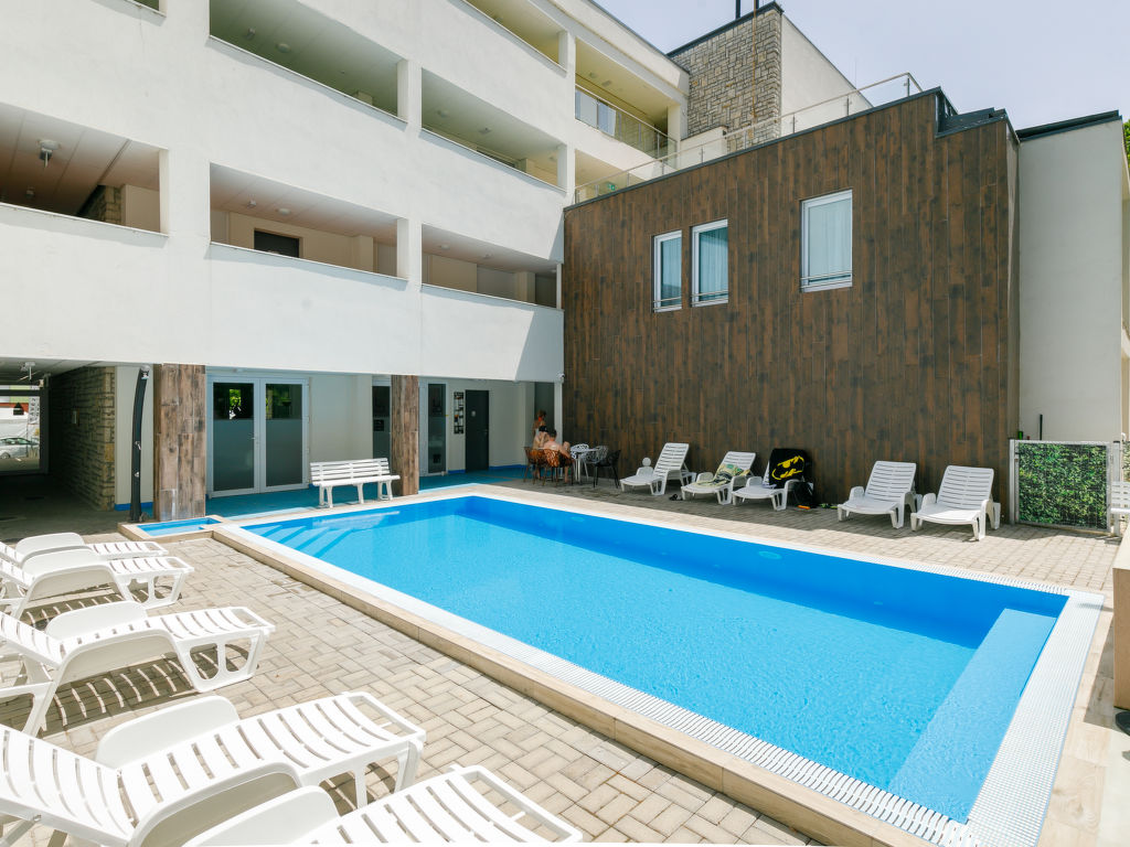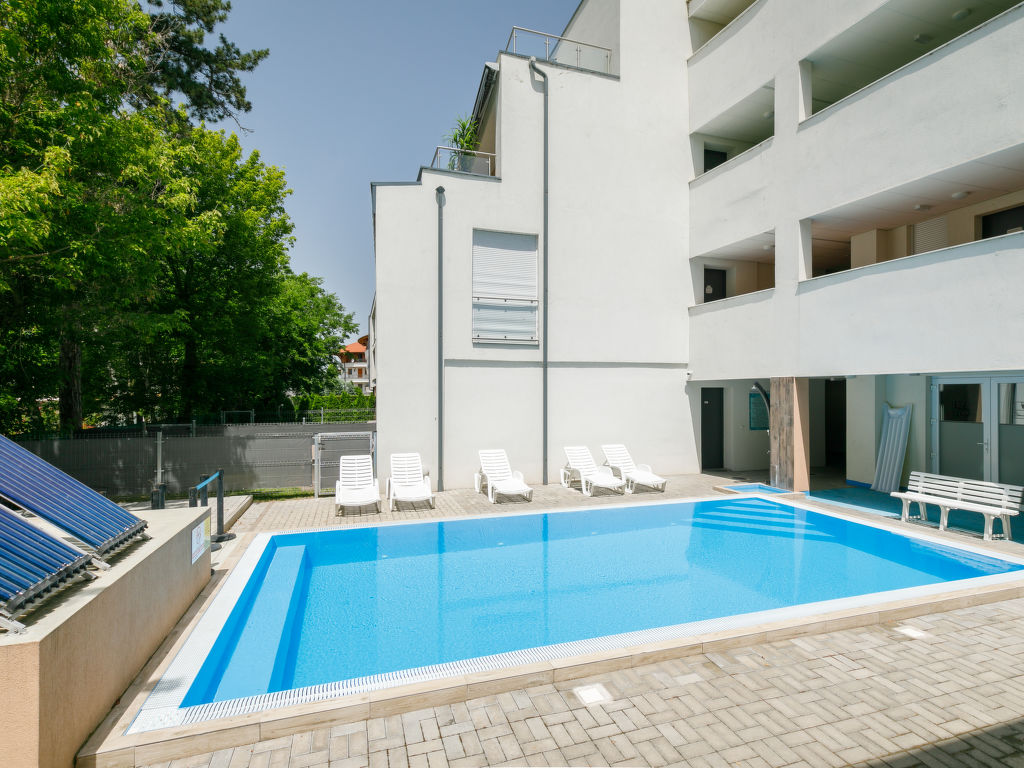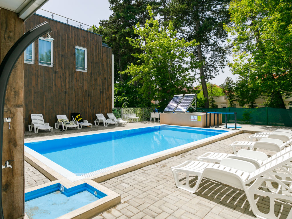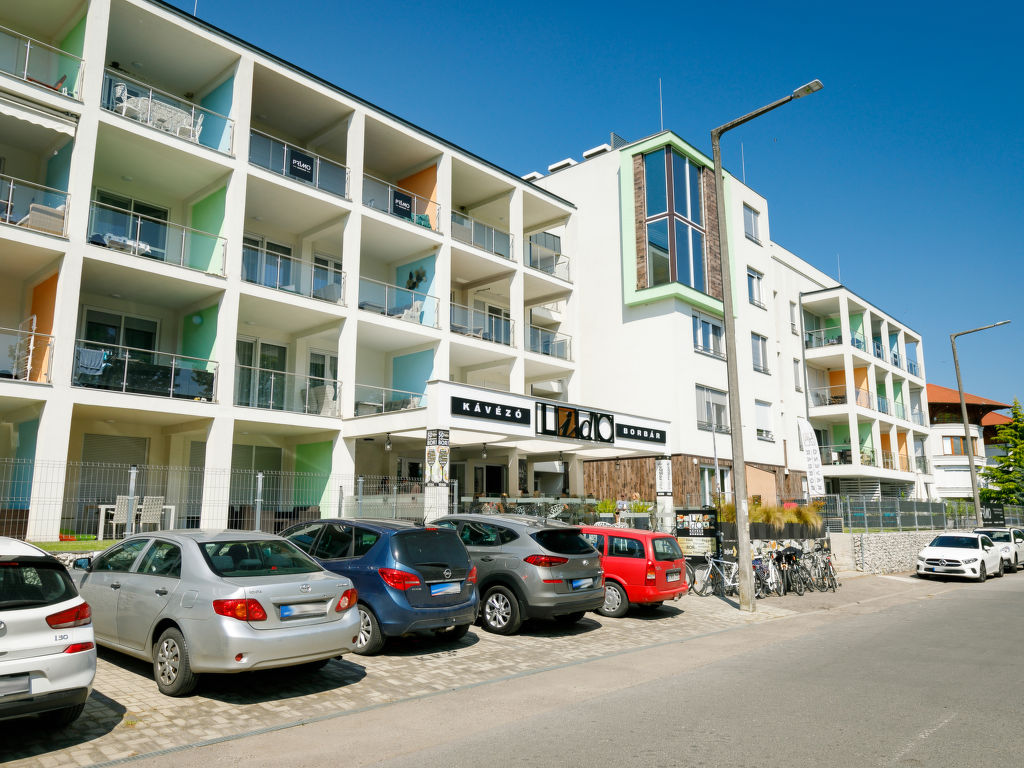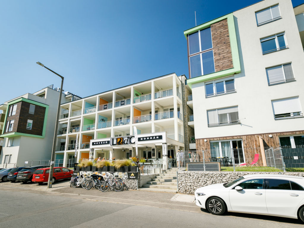 Balatonlelle: Modernes Appartementhaus. Im Herzen der Stadt, 200 m vom See. Zur Mitbenutzung: Garten, Schwimmbad eckig (8 x 4 m, 32 m2, saisonale Verfügbarkeit: 01.Mai.-01.Okt.). Aussendusche. Im Hause: Internetcafé, Klimaanlage. Supermarkt 150 m, Restaurant 100 m, Bäckerei, Fußgängerzone 50 m, Zentrum zu Fuss in 5 Minuten erreichbar, Bahnstation 100 m, Grasstrand 200 m. Radweg 100 m. Bitte beachten: Ferienwohnung Ref. HU8638.250.1 befindet sich auf dem gleichen Grundstück.