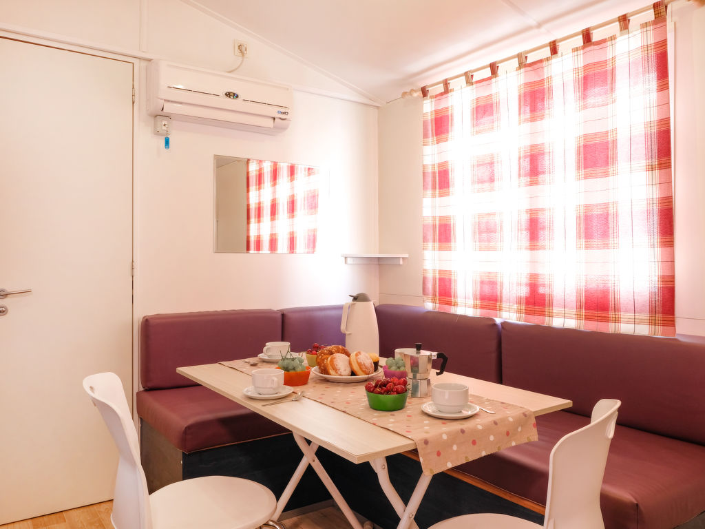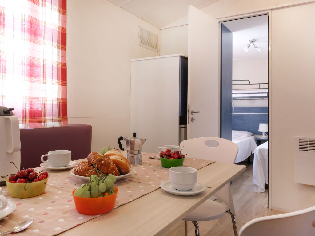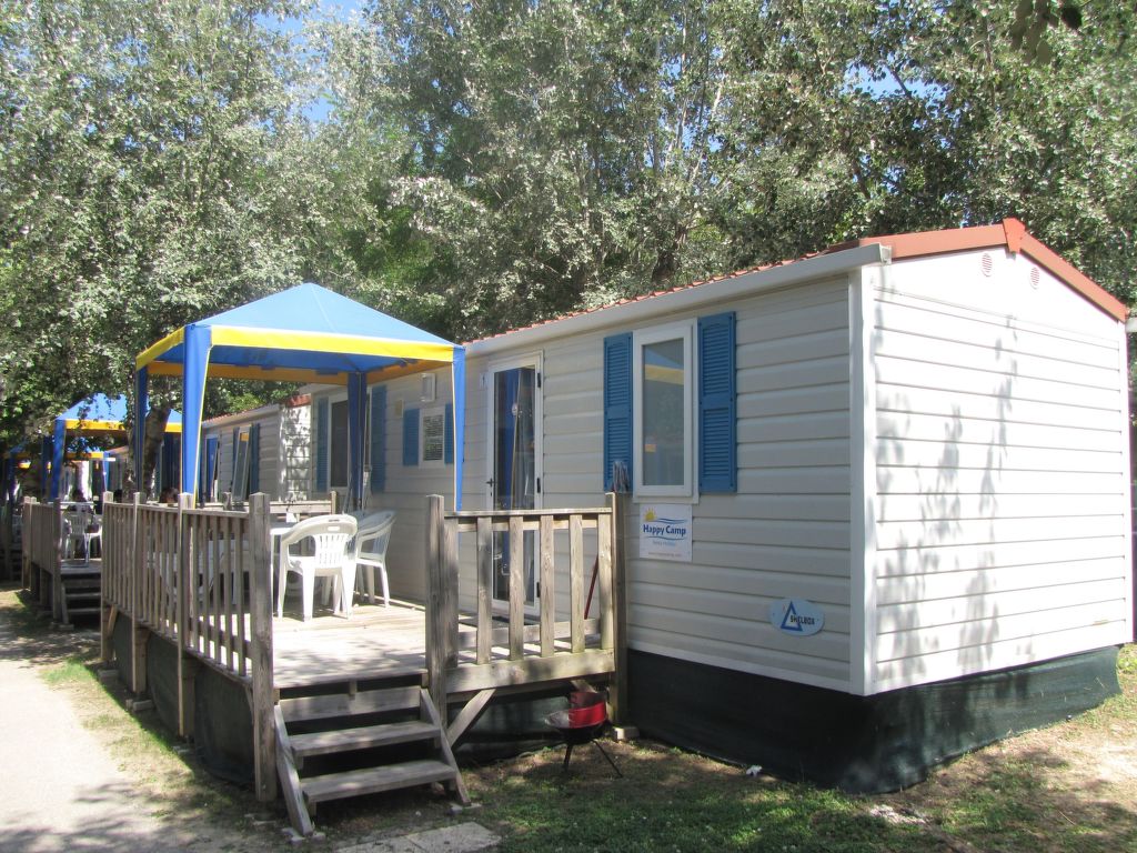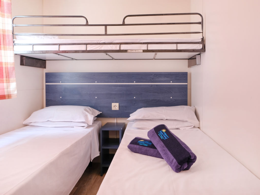 "Happy Standard", 3-Zimmer-Mobilheim 25 m2. Objekt geeignet für 5 Erwachsene + 1 Kind. Zweckmässig eingerichtet: Wohn-/Schlafzimmer mit 1 Diwanbett, Esstisch, E-Heizung und Klimaanlage. 1 Zimmer mit 1 franz. Bett (140 cm). 1 Zimmer mit 2 Betten (70 cm), 1 x 1 Etagenbetten (Länge 150 cm). Offene Küche (4 Kochplatten). Dusche/WC. Terrasse. Terrassenmöbel, Elektrogrill (mobil), Liegestühle (2). Zur Verfügung: Fliegengitter. Bitte beachten: Nichtraucher-Unterkunft. KE19004810