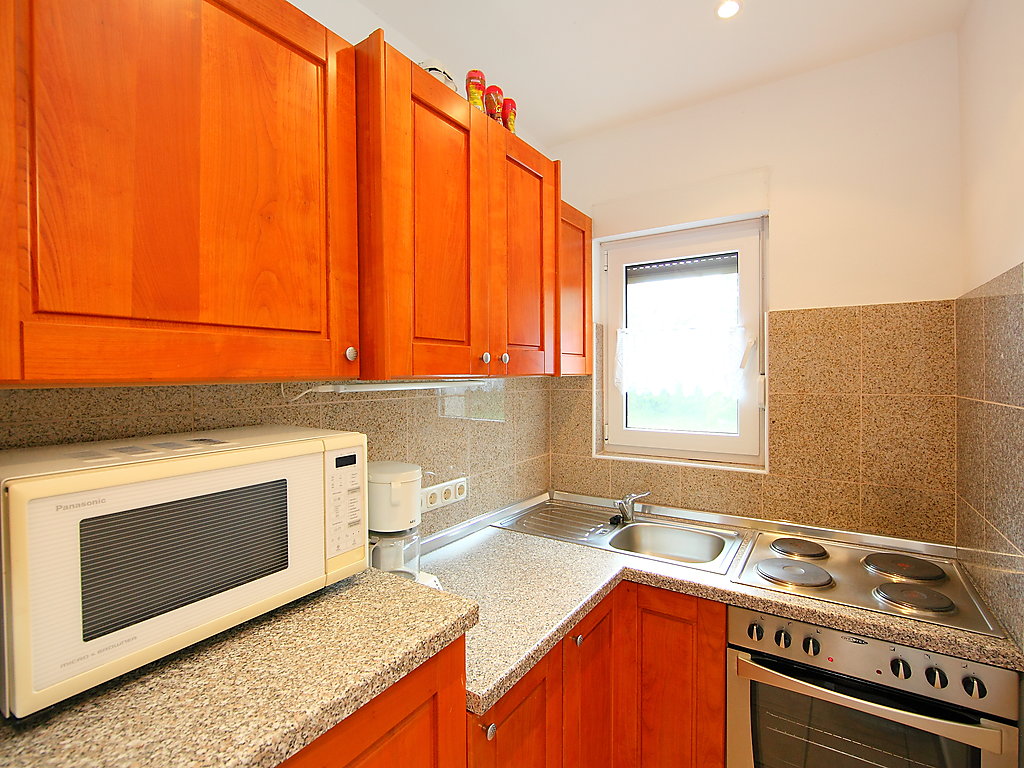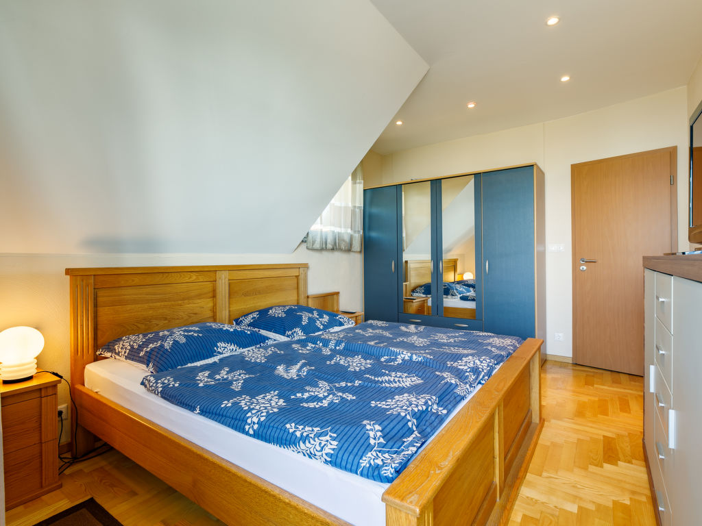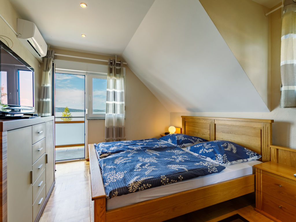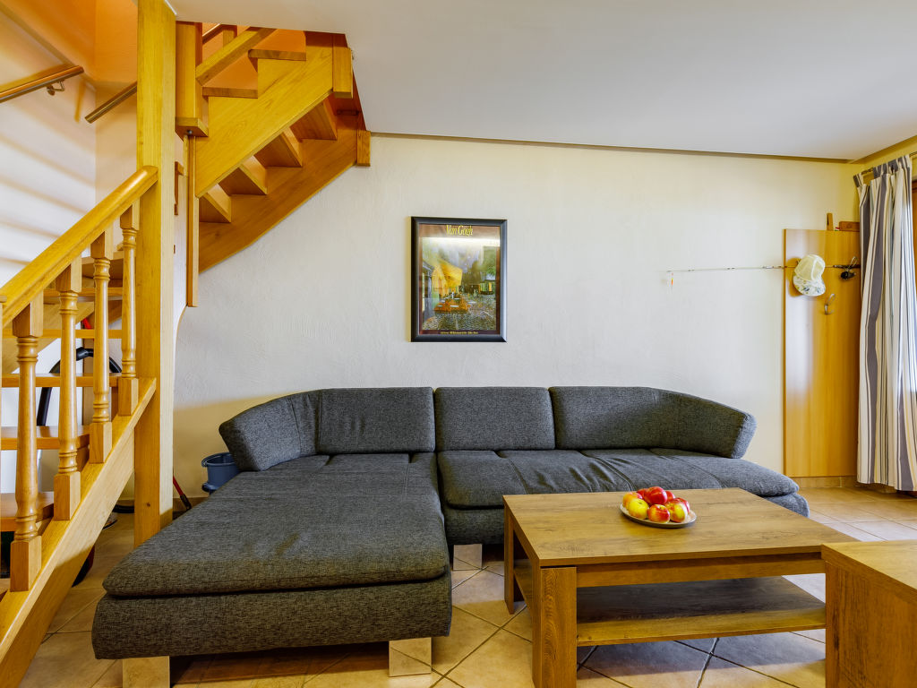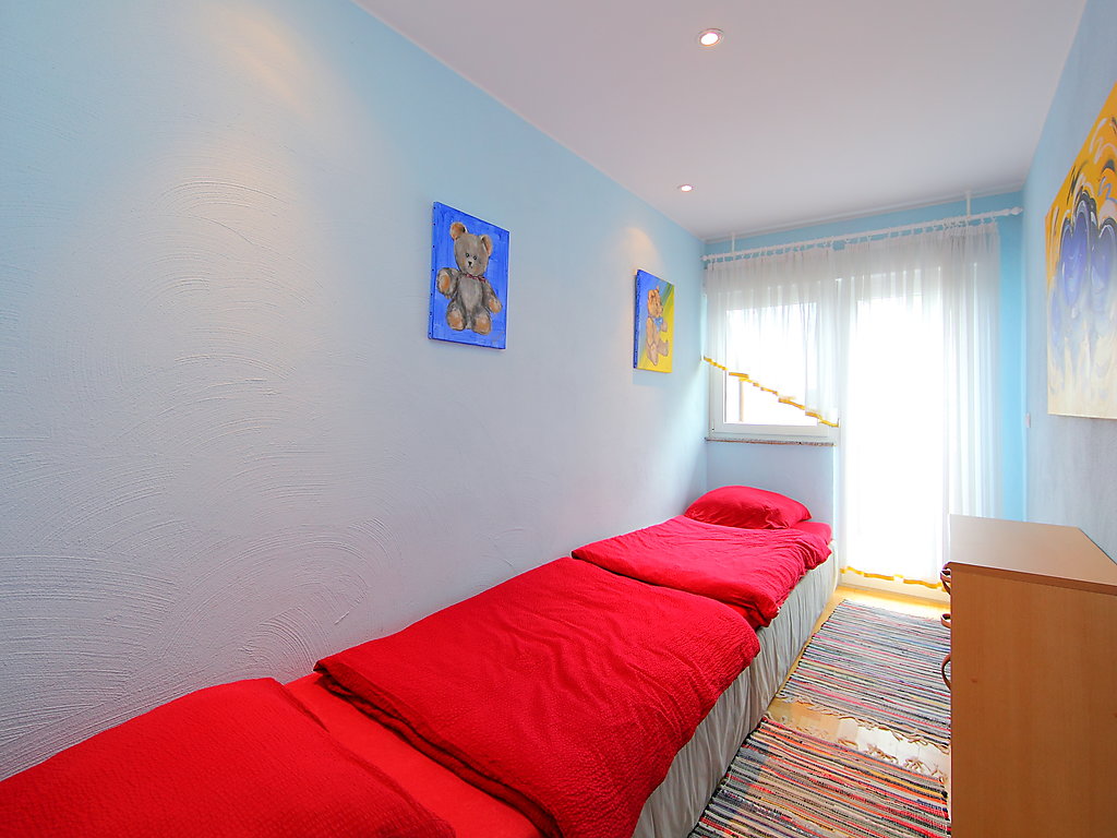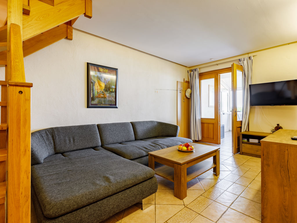 4-Zimmer-Doppelhaushälfte 80 m2. Schön und gemütlich eingerichtet: Wohnzimmer mit Sat-TV. Esszimmer. 1 Zimmer mit 1 franz. Bett. Kleine Küche (4 Kochplatten, Backofen, Tiefkühler). Dusche/WC. Obergeschoss: Eingang. 1 Zimmer mit 1 Doppelbett (200 cm, Länge 200 cm). Ausgang zum Balkon. 1 Zimmer mit 2 Betten. Ausgang zum Balkon. Dusche/WC. 2 Balkone, Terrasse. Terrassenmöbel, Balkonmöbel, Gartengrill, Liegestühle. Sehr schöne, auf den See. Parkplatz (eingezäunt).