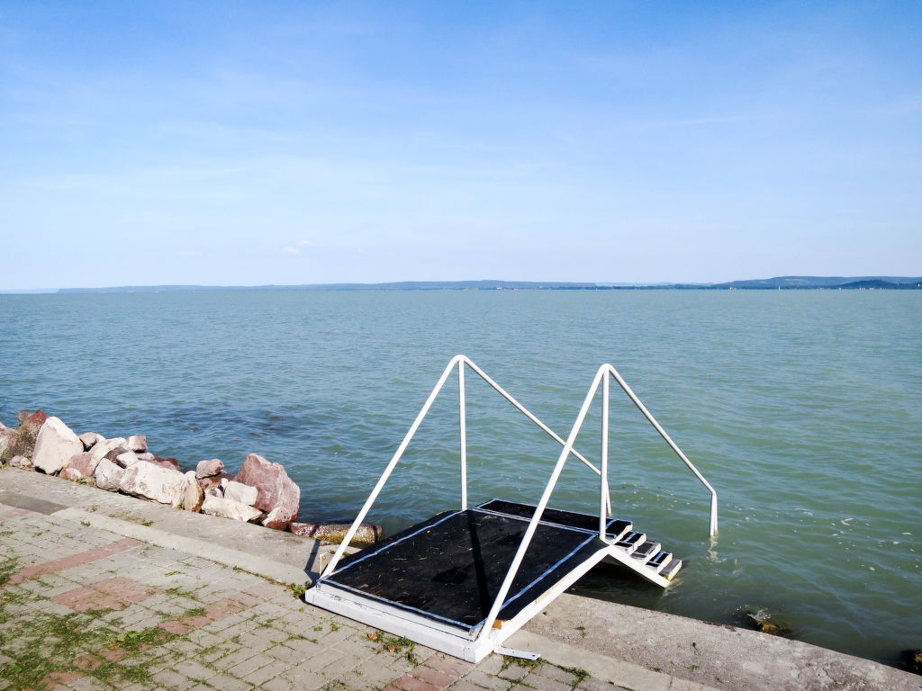 Einfamilienhaus "Kopacsi", umgeben von Weinbergen. Im Ortsteil Badaconyörs, am Ortsrand, 2 km vom Zentrum von Badacsony, sonnige Lage am Hang, in einem Wohnquartier, 400 m vom See. Zur Alleinbenutzung: Grundstück, Terrassengarten (nicht eingezäunt) mit Pflanzen und Bäumen. Zur Verfügung: Fahrräder (2). 100 m lange steile, schmale Zufahrt bis zum Haus (Naturweg). 25 m Treppenweg bis zum Haus. Parkplatz auf dem Grundstück. Einkaufsgeschäft 2 km, Grasstrand 2 km. Ein Teil des Hauses ist abgeschlossen und unbewohnt.