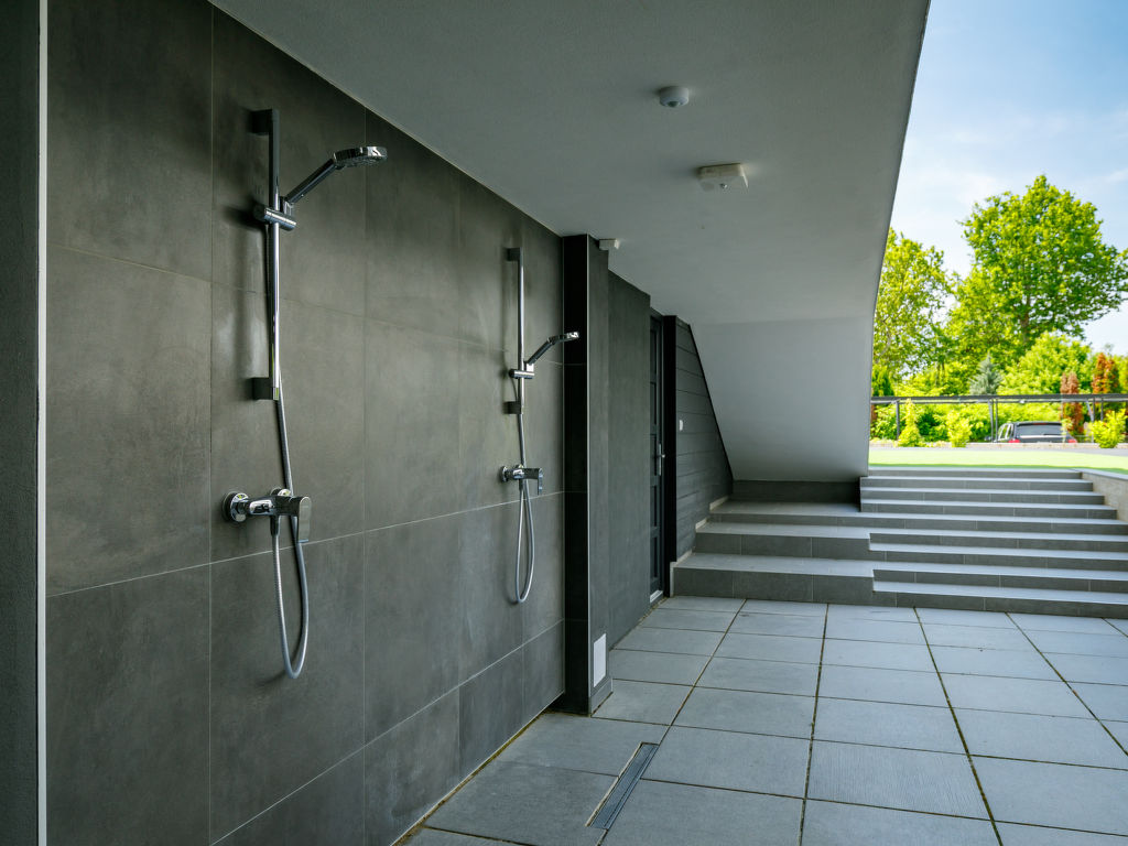 Balatonszemes 7 km von Balatonlelle: Modernes, schönes Appartementhaus, Baujahr 2020. Im Ort, zentrale Lage, 100 m vom See. Zur Mitbenutzung: Schwimmbad eckig beheizt (8 x 20 m, saisonale Verfügbarkeit: 15.Mai.-15.Sep.). Im Hause: Internetcafé, Wireless LAN, Fahrstuhl, Sonnenterrasse. Lebensmittelgeschäft 200 m, Restaurant 100 m, Bahnstation 450 m, Grasstrand 300 m. Sporthafen 100 m. Nahe gelegene Sehenswürdigkeiten: Tihany 14 km.