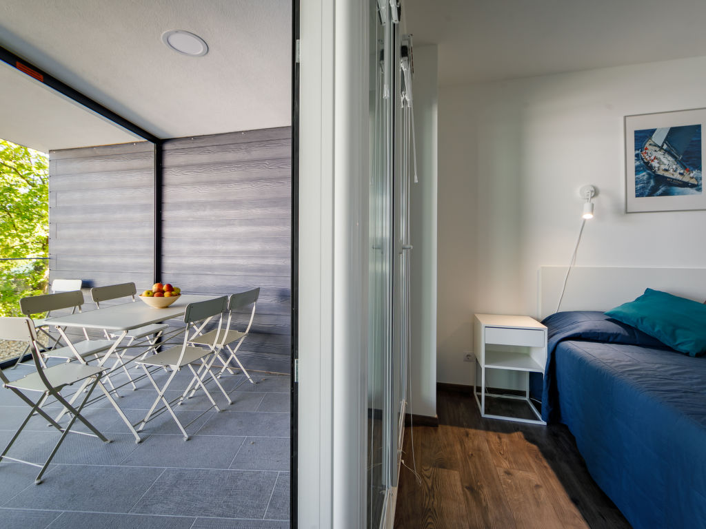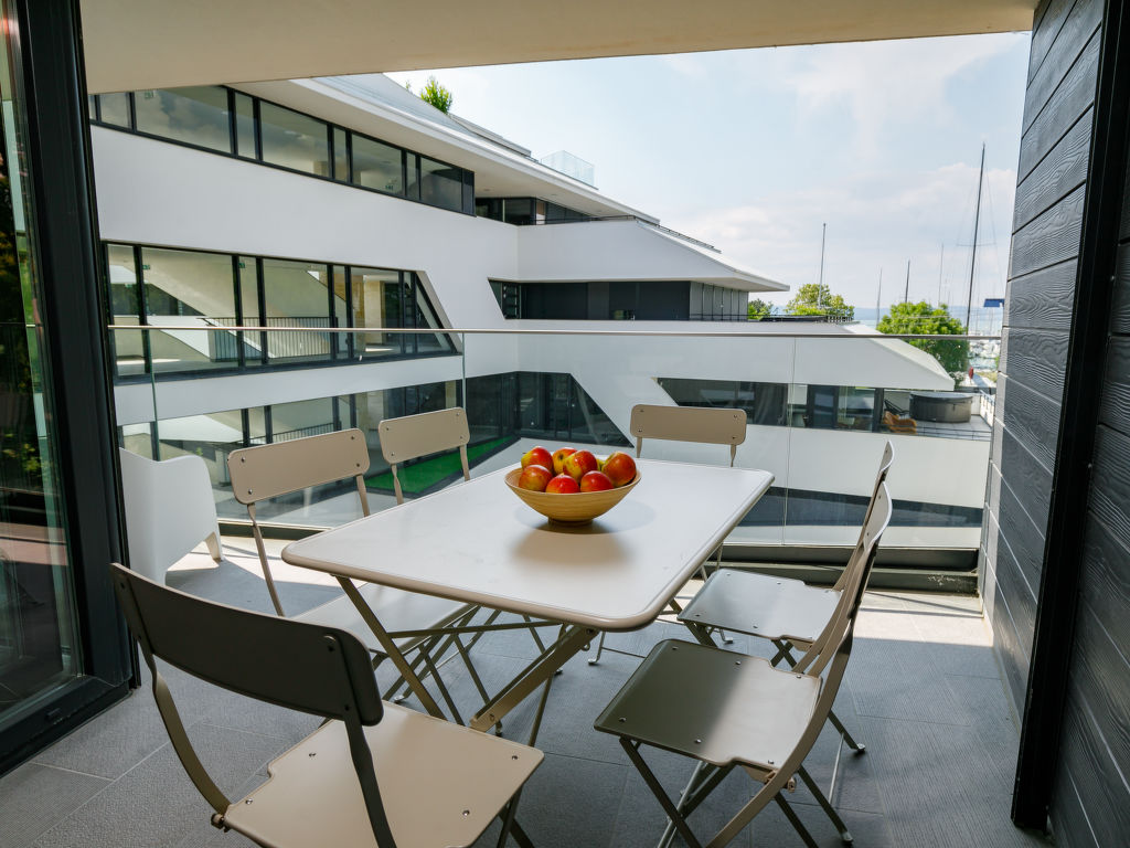 "Füred", 3-Zimmer-Wohnung 44 m2 im 2. Stock. Modern und geschmackvoll eingerichtet: Wohn-/Schlafzimmer mit 1 Ausziehbett (2 Pers.), Kabel-TV und Klimaanlage. Ausgang zur Terrasse. 1 Zimmer mit 1 franz. Bett. 1 Zimmer mit 2 Betten. Offene Küche (Backofen, Toaster, Wasserkocher). Dusche/WC, sep. WC. Terrasse 11 m2. Terrassenmöbel. Schöne, auf den See. Parkplatz (überdacht, 1 Auto). EG21000354