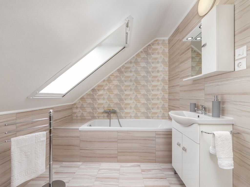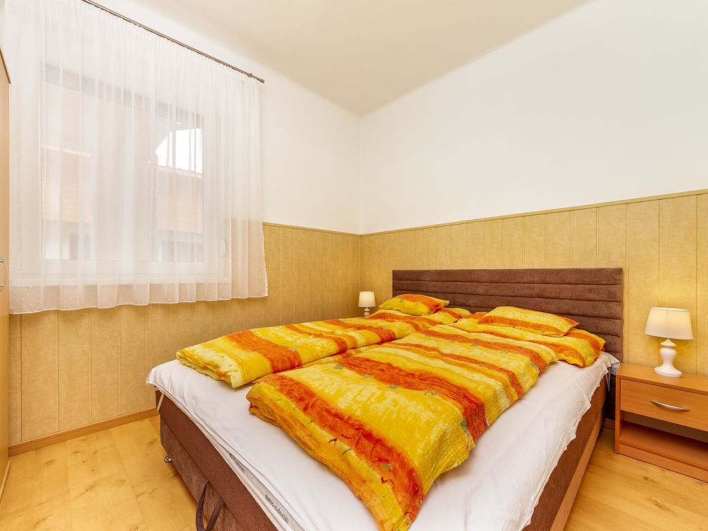 6-Zimmer-Haus 160 m2 auf 2 Stockwerken. Teilweise abgeschrägt, gemütlich eingerichtet: Wohn-/Esszimmer mit Sat-TV. Ausgang zur Terrasse. 2 Zimmer, jedes Zimmer mit 2 Ausziehbetten (2 Pers.). Kleine Küche (4 Kochplatten, Backofen, Mikrowelle, Tiefkühler). Bad/WC. Obergeschoss: Wohnzimmer. Ausgang zum Balkon. 1 Zimmer mit 2 Betten. 1 Zimmer mit 1 franz. Bett. Bad, sep. WC. Grosse Terrasse, Gartensitzplatz. Terrassenmöbel, Gartengrill (mobil). Parkplatz (eingezäunt, 4 Autos). MA19002906