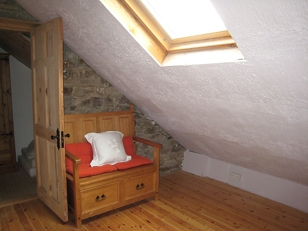 2-Zimmer-Haus. Einfach und rustikal eingerichtet: Wohnzimmer mit TV, Flachbildschirm, Radio und DVD. Küche (4 Kochplatten, Backofen, Mikrowelle, Tiefkühler) mit Bar. Bad, Dusche/WC, Whirlbadewanne. Obergeschoss: 1 abgeschrägtes Zimmer mit 1 franz. Bett. E-Heizung. Gartensitzplatz. Terrassenmöbel. Sicht auf die Berge und die Landschaft. 2 Haustiere/Hunde erlaubt.