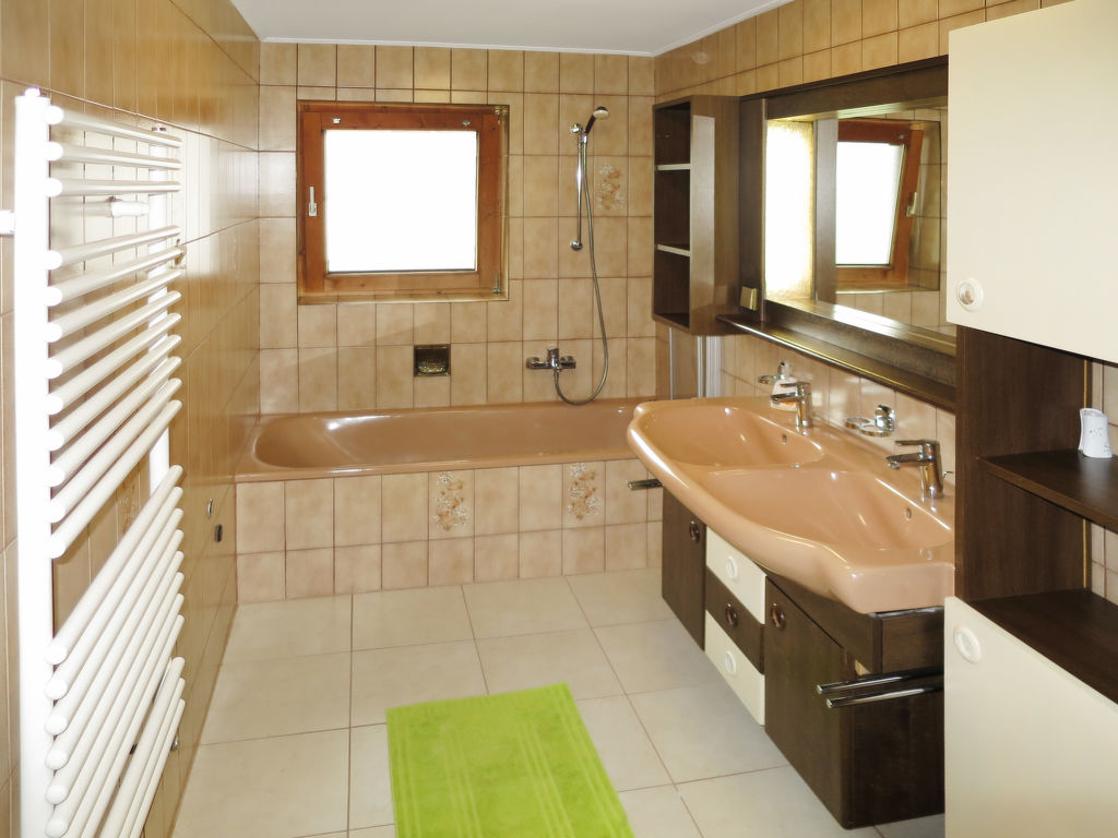 3-Zimmer-Wohnung, 1. Etage, ca. 75 m². Wohnraum mit Sitzcouch, Essplatz und Kachelofen. Küche (4 Ceranfelder, Backofen, Geschirrspüler, Kühlschrank, Kaffeemaschine, Wasserkocher) mit Essplatz. Doppelzimmer. Schlafzimmer mit Doppelbett und Einzelbett. Bad/Doppelwaschbecken/WC. Sep.WC.