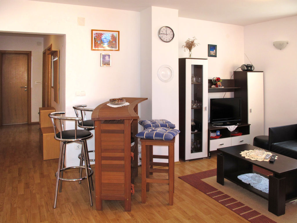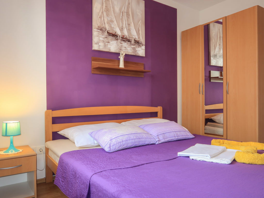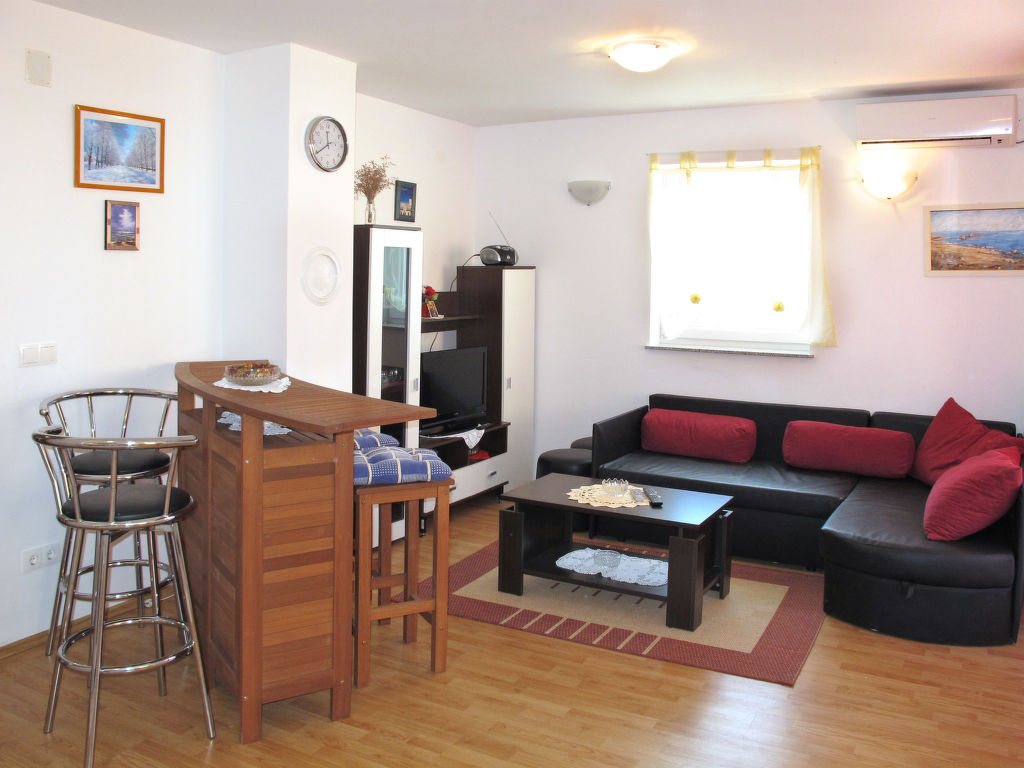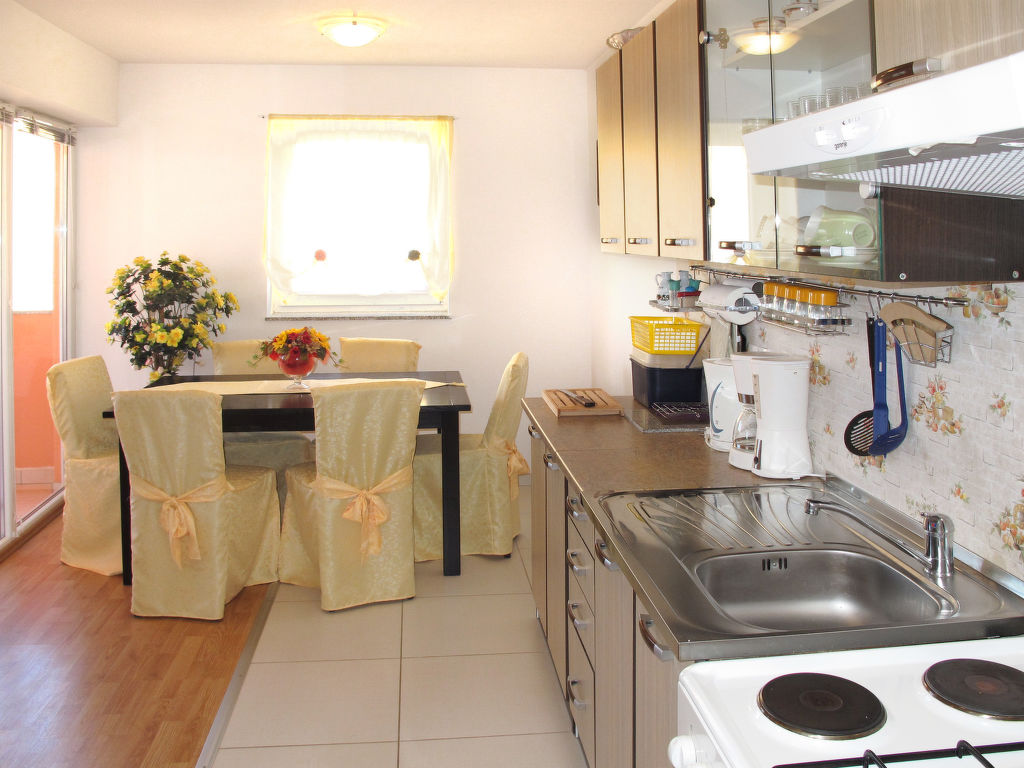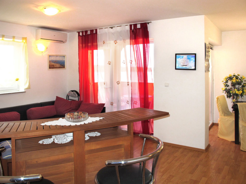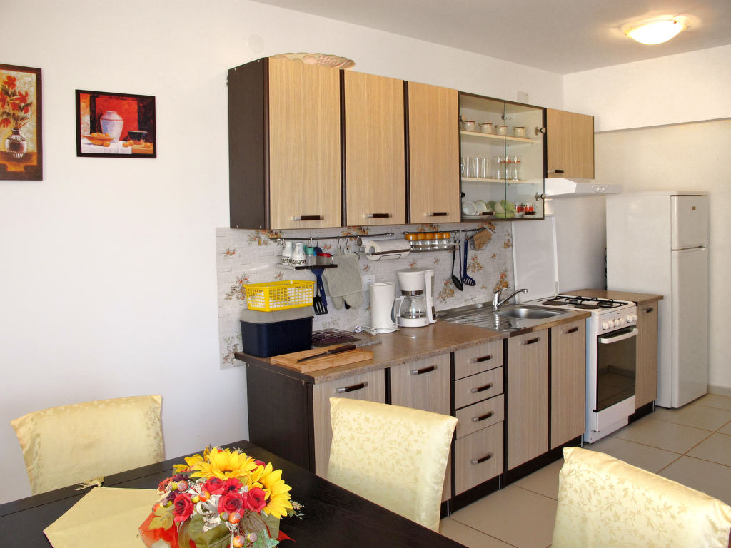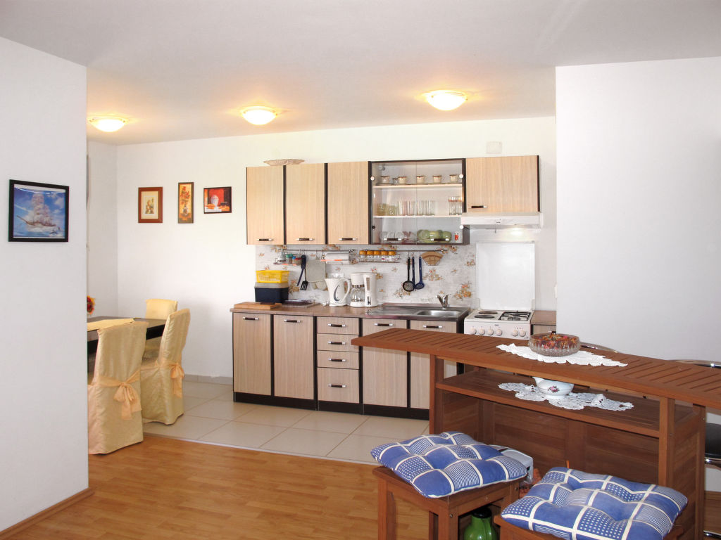 "Mario (MLK163)", 3-Zimmer-Wohnung 55 m2 im 1. Stock. Wohn-/Esszimmer mit Esstisch, TV und Klimaanlage. Ausgang zur Loggia. 1 Zimmer mit 1 franz. Bett (160 cm, Länge 200 cm). 1 Zimmer mit 2 Betten (80 cm, Länge 200 cm). Offene Küche (4 Kochplatten, Backofen, Geschirrspüler, Tiefkühler, elektrische Kaffeemaschine). Dusche/WC. Balkon 6 m2. Balkonmöbel, Abstellkammer. Sicht auf das Meer. Zur Verfügung: Waschmaschine, Fliegengitter, Haartrockner. Internet (Wireless LAN, gratis). Parkplatz (1 Auto). Bitte beachten: Nichtraucher-Unterkunft.