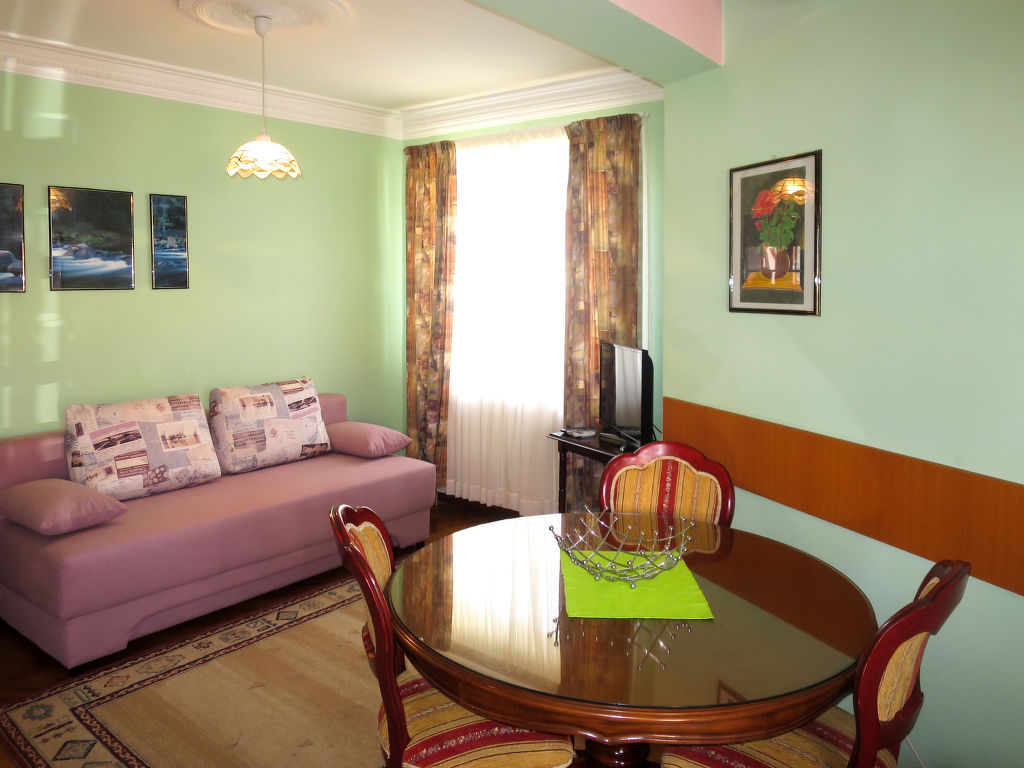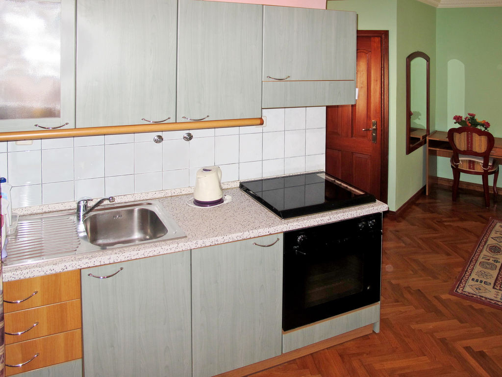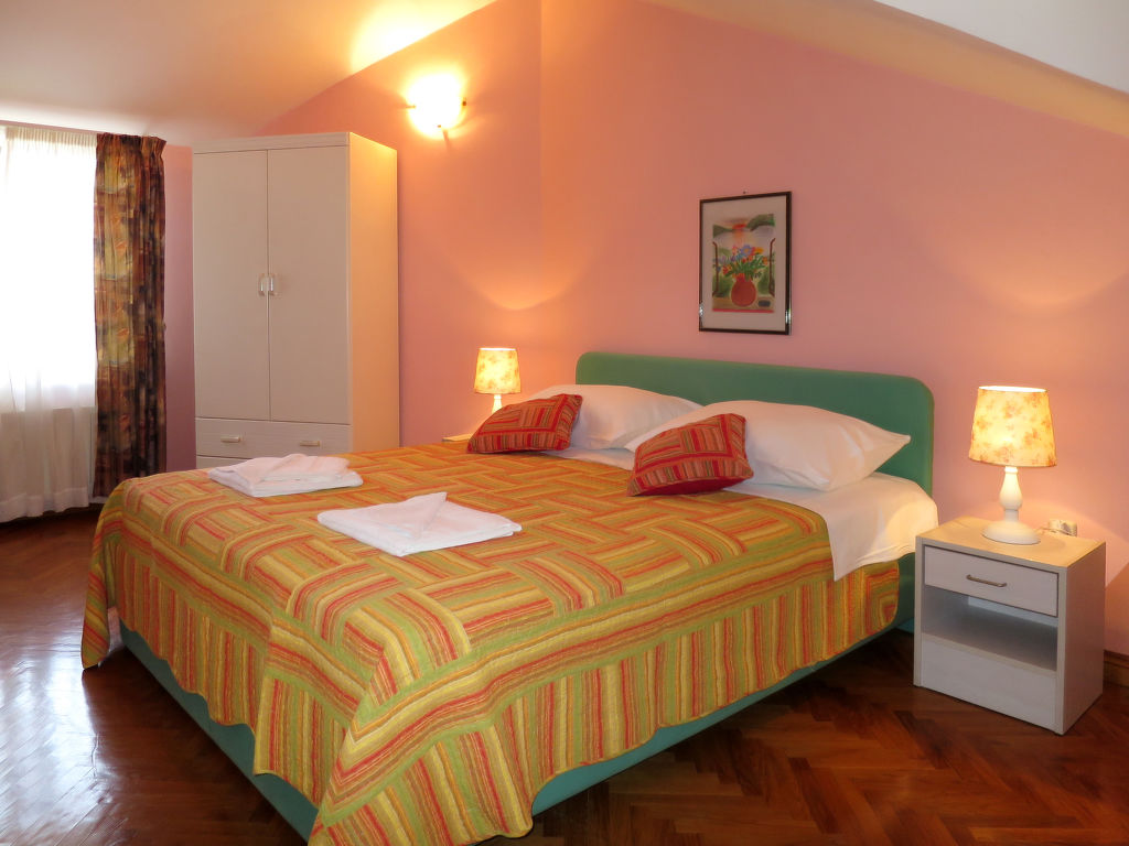 2-Zimmer-Wohnung 40 m2, im erhöhten Erdgeschoss. Wohn-/Esszimmer mit 1 Doppeldiwanbett und Sat-TV (Flachbildschirm), Klimaanlage. Ausgang zum Balkon. 1 Zimmer mit 1 franz. Bett (160 cm). Offene Küche (4 Kochplatten, Backofen, Toaster, Wasserkocher, elektrische Kaffeemaschine). Dusche/WC. Balkon. Balkonmöbel. Zur Verfügung: Waschmaschine. Internet (Wireless LAN, gratis). Parkplatz (1 Auto). Bitte beachten: Nichtraucher-Unterkunft.