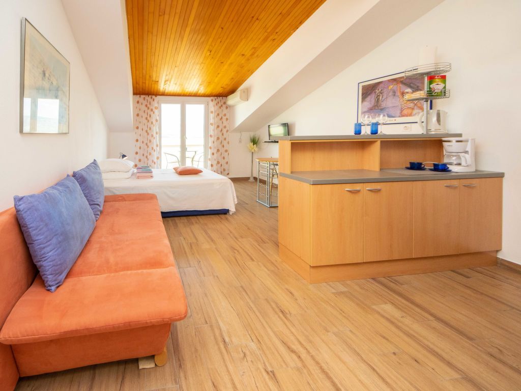 1-Zimmer-Wohnung 33 m2 im 3. Stock, Nordlage. Studio abgeschrägtes, Deckenhöhe 100 - 240 cm mit 1 Diwanbett (90 cm, Länge 190 cm), 1 franz. Bett (140 cm, Länge 200 cm), Sat-TV (Flachbildschirm), Klimaanlage. Ausgang zum Balkon. Offene Küche (2 Kochplatten, Mikrowelle) mit Esstisch. Dusche/WC. Balkon 4 m2. Balkonmöbel. Herrliche Sicht auf das Meer. Zur Verfügung: Internet (Wireless LAN, gratis).