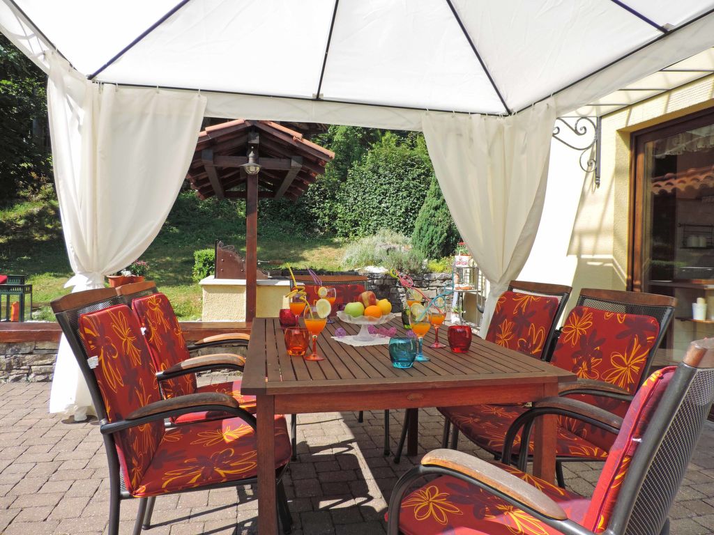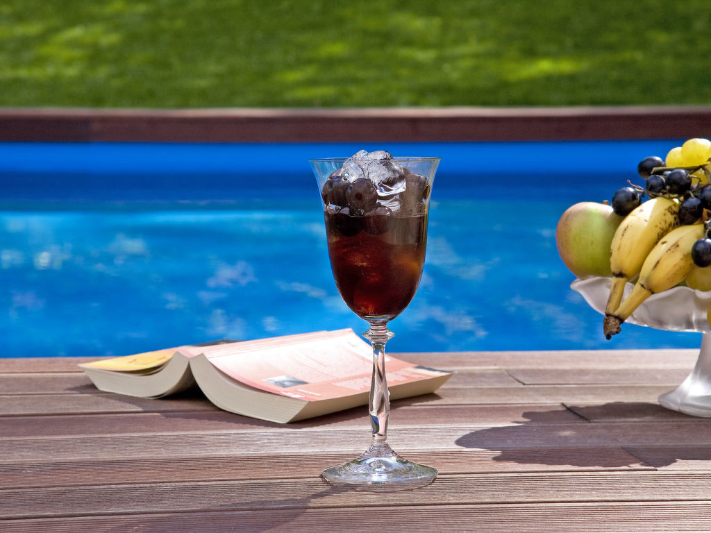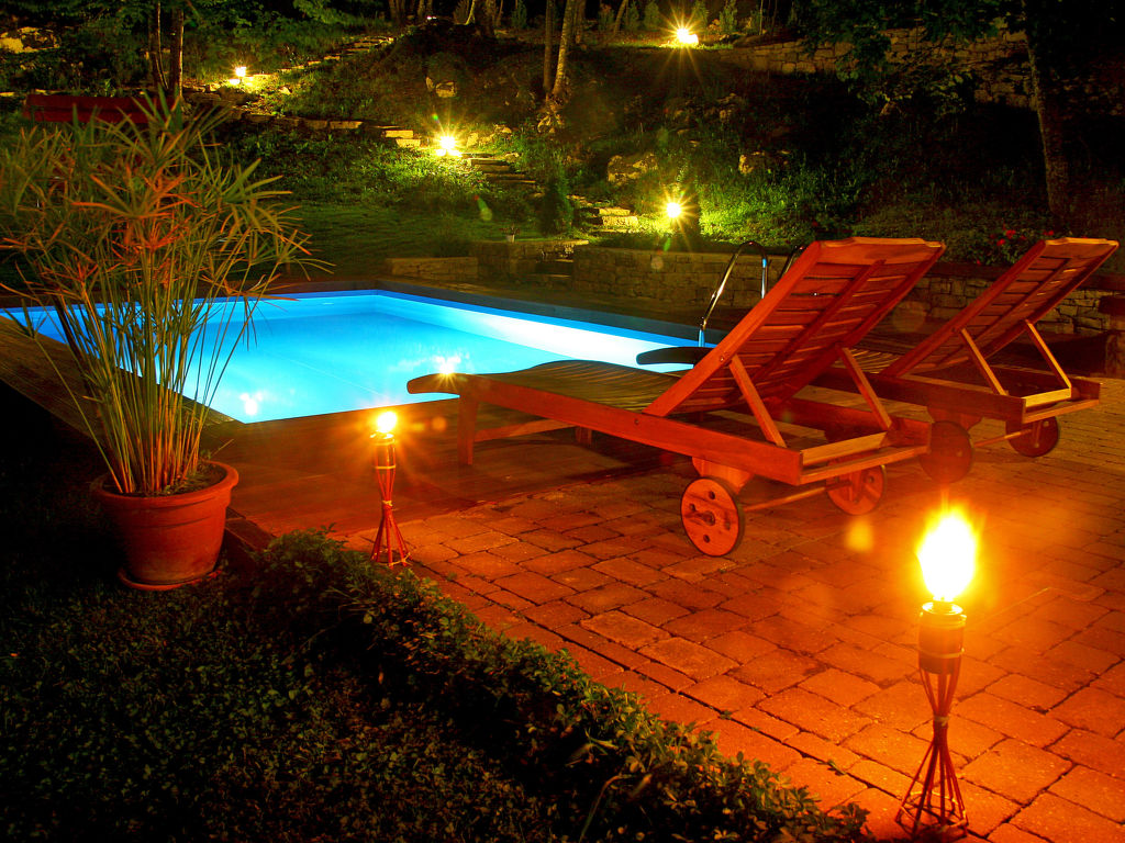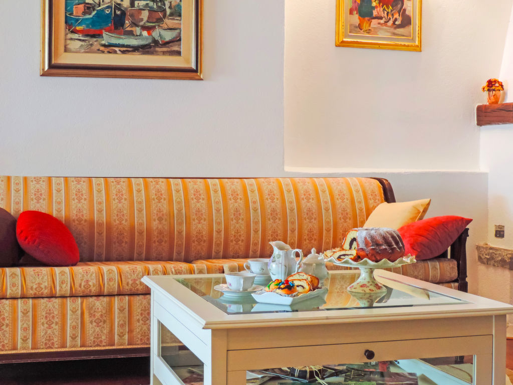 3-Zimmer-Haus 65 m2 auf 2 Stockwerken. Schön und geschmackvoll eingerichtet: Wohn-/Esszimmer 25 m2 mit 1 Doppeldiwanbett (185 cm, Länge 185 cm), offenem Kamin und Sat-TV (Flachbildschirm), DVD und Klimaanlage. Ausgang zur Terrasse. Offene Küche (4 Kochplatten, Backofen, Geschirrspüler, Mikrowelle, Tiefkühler, elektrische Kaffeemaschine). Bad/WC, sep. WC. Obergeschoss: 1 Zimmer mit 1 Doppelbett (2 x 80 cm, Länge 200 cm). 1 Zimmer mit 2 Betten (90 cm, Länge 200 cm). E-Heizung. Terrasse 20 m2. Terrassenmöbel, Liegestühle. Sicht auf das Schwimmbad. Zur Verfügung: Babybett, Haartrockner. Internet (Wireless LAN, gratis). Maximal 1 Haustier/Hund erlaubt. Niedrige Höhe der Hauseingangstür (182 cm). Deckenhöhe über die Innentreppe ist 175 – 220 cm.