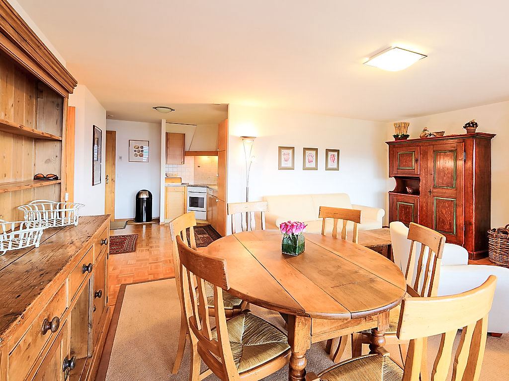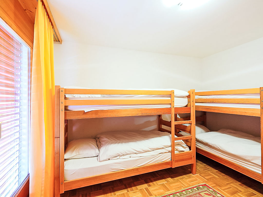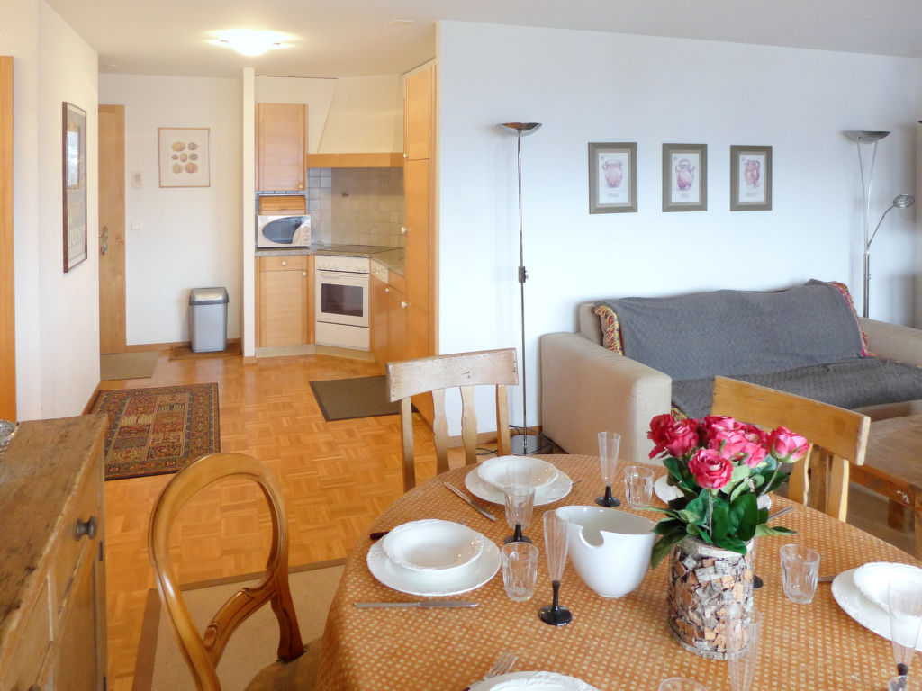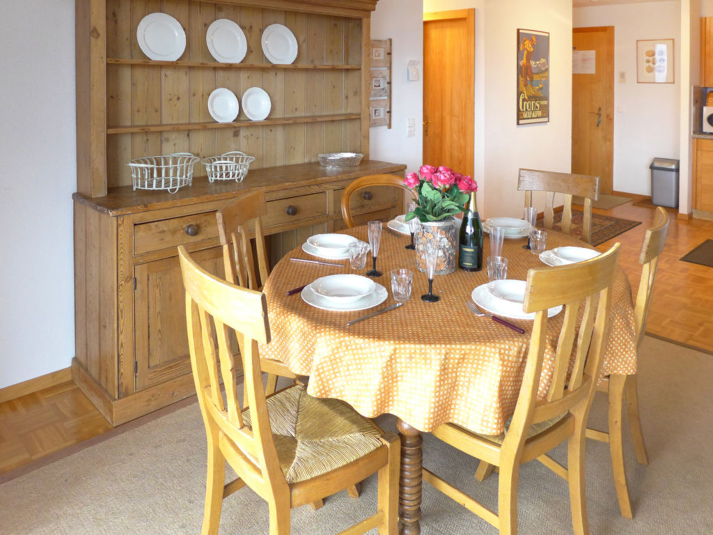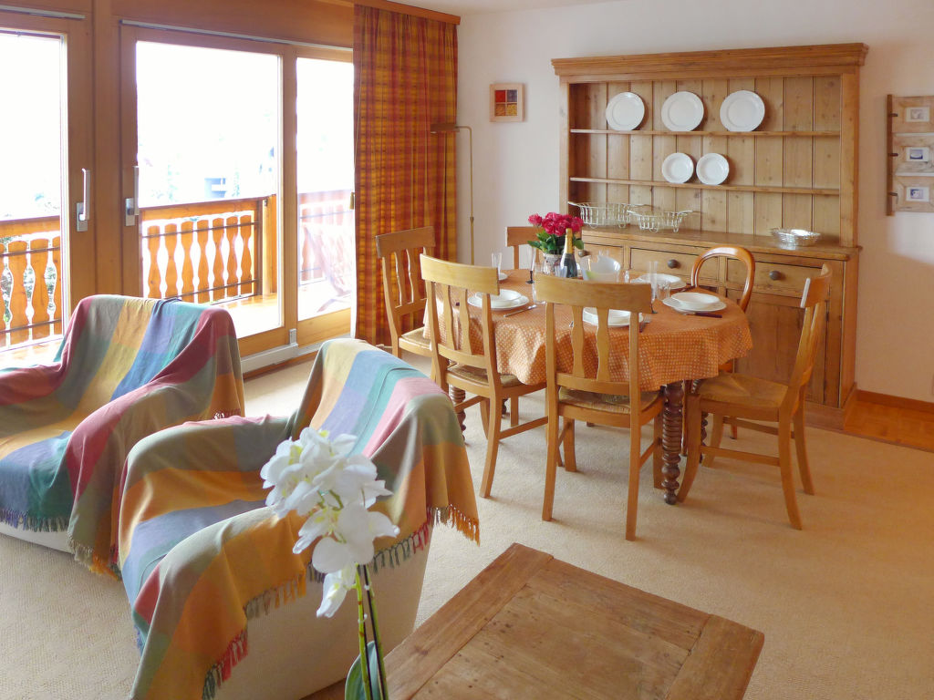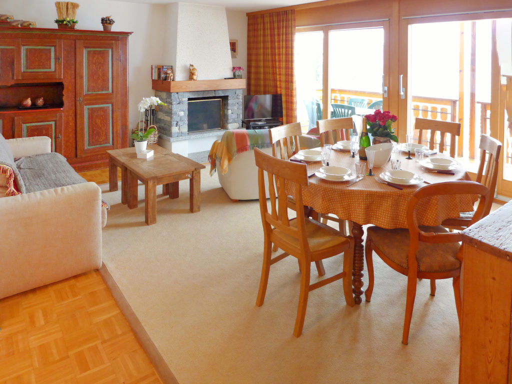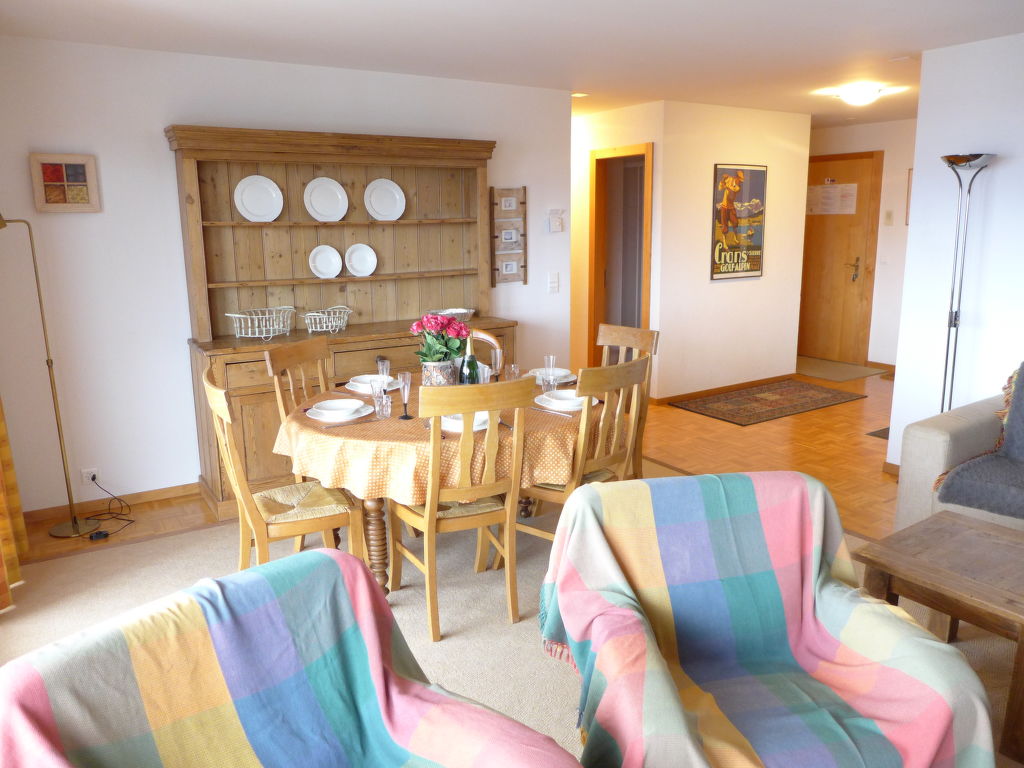 3-Zimmer-Wohnung 84 m2 im 1. Stock. Sehr komfortabel eingerichtet: grosses Wohn-/Esszimmer mit offenem Kamin und Kabel-TV (Flachbildschirm), Stereoanlage. 1 Zimmer mit 1 Doppelbett (2 x 90 cm, Länge 200 cm). 1 Zimmer mit 2 x 2 Etagenbetten (90 cm, Länge 200 cm). Kochnische (Backofen, Geschirrspüler, 4 Glaskeramikherd Platten, Toaster, Wasserkocher, Mikrowelle, Tiefkühler, elektrische Kaffeemaschine, Kapseln für die Kaffeemaschine (NESPRESSO), Fondue Set (Käse)). Bad/Bidet/WC, Dusche/WC. Terrasse 25 m2, Südlage. Terrassenmöbel. Herrliche Sicht auf die Berge und das Tal. Zur Verfügung: Haartrockner. Internet (Wireless LAN, gratis). Garage Nr. 5, Höhe 200 cm, Breite 220 cm. Bitte beachten: Nichtraucher-Unterkunft.