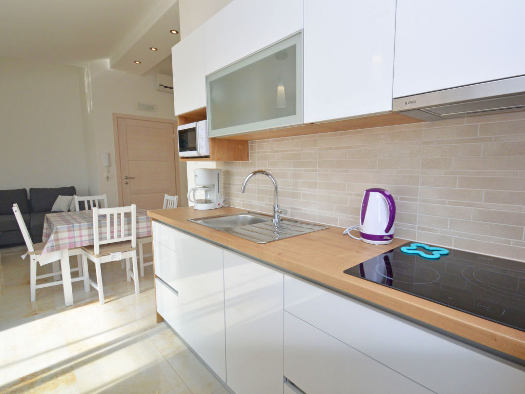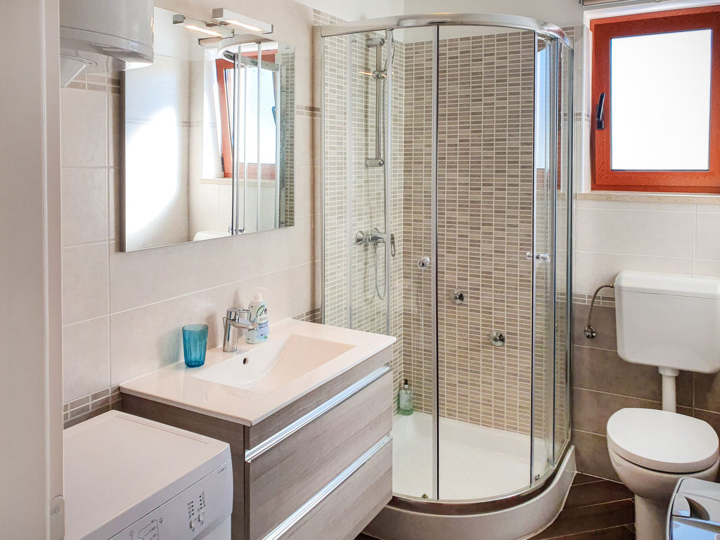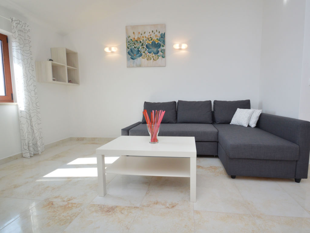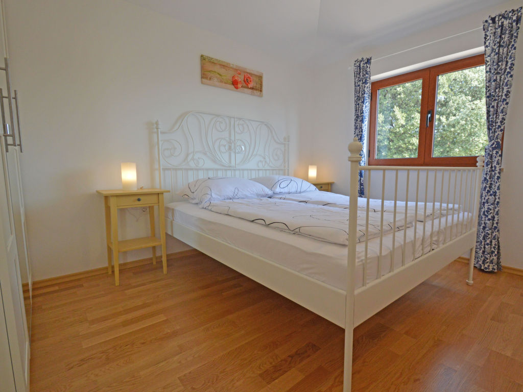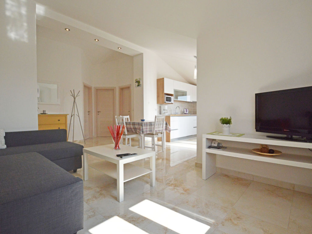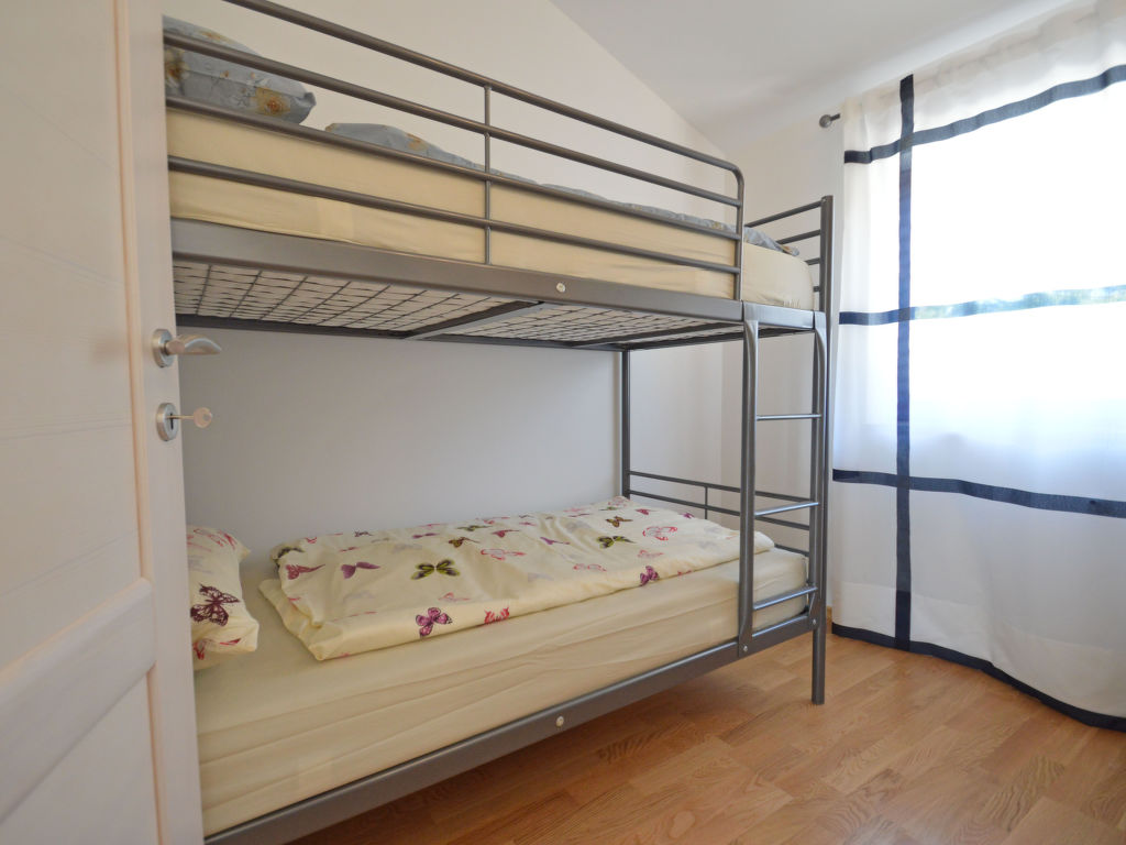 3-Zimmer-Wohnung 50 m2 im 2. Stock. Wohn-/Esszimmer mit 1 Doppeldiwanbett (150 cm, Länge 200 cm), Sat-TV (Flachbildschirm), Klimaanlage. Ausgang zur Terrasse. 1 Zimmer mit 1 Doppelbett (2 x 80 cm, Länge 200 cm). 1 Zimmer mit 1 x 2 Etagenbetten (80 cm, Länge 200 cm). Offene Küche (Geschirrspüler, 4 Glaskeramikherd Platten, Mikrowelle, Tiefkühler, elektrische Kaffeemaschine). Dusche/WC. Terrasse 7 m2, überdacht. Terrassenmöbel. Sicht auf die Landschaft. Zur Verfügung: Waschmaschine, Haartrockner. Internet (Wireless LAN, gratis).