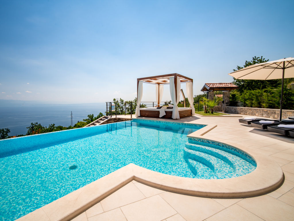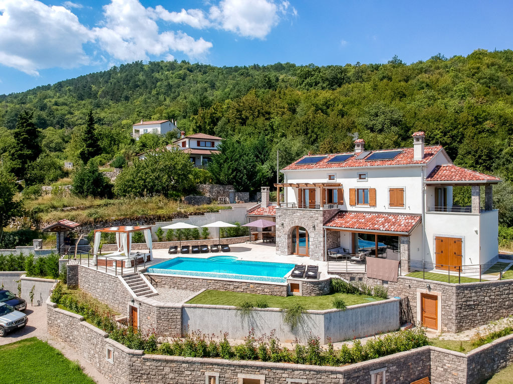 Schöne Villa "Marone", auf 3 Stockwerken. Oberhalb von Lovran, im Weiler Dobreć, 5 km vom Zentrum von Lovran, ruhige, sonnige, erhöhte Lage, 5 km vom Meer, in einer Sackgasse, im Grünen. Zur Alleinbenutzung: Grundstück 900 m2 (eingezäunt), Schwimmbad eckig, beheizt (10 x 4 m, 135 cm tief, 15.05.-30.09.) mit Innentreppe. Aussendusche, Poolhaus mit Dusche, WC und Kochherd, Terrasse (150 m2), Gartenmöbel, Grill, Kinderspielplatz (Schaukel). Im Hause: Internetzugang, Klimaanlage, Alarmanlage, Waschmaschine, Wäschetrockner. Parkplatz (für 3 Autos) beim Haus auf dem Grundstück. Elektroauto-Ladestation. Einkaufsgeschäft 1.3 km, Restaurant 5 km, Kieselstrand 5 km, Strandbad 5 km, betonierter Strand 5 km. Bitte beachten: geeignet für Familien. Keine Vermietung an Jugendgruppen. Videoüberwachung der Immobilie.