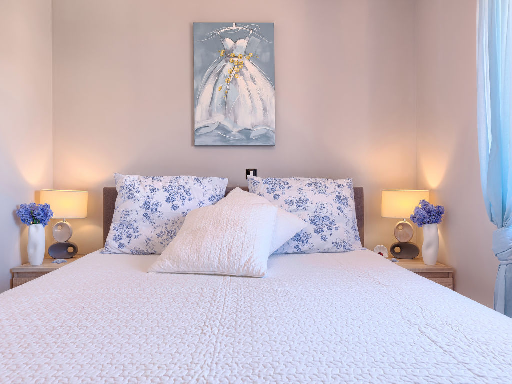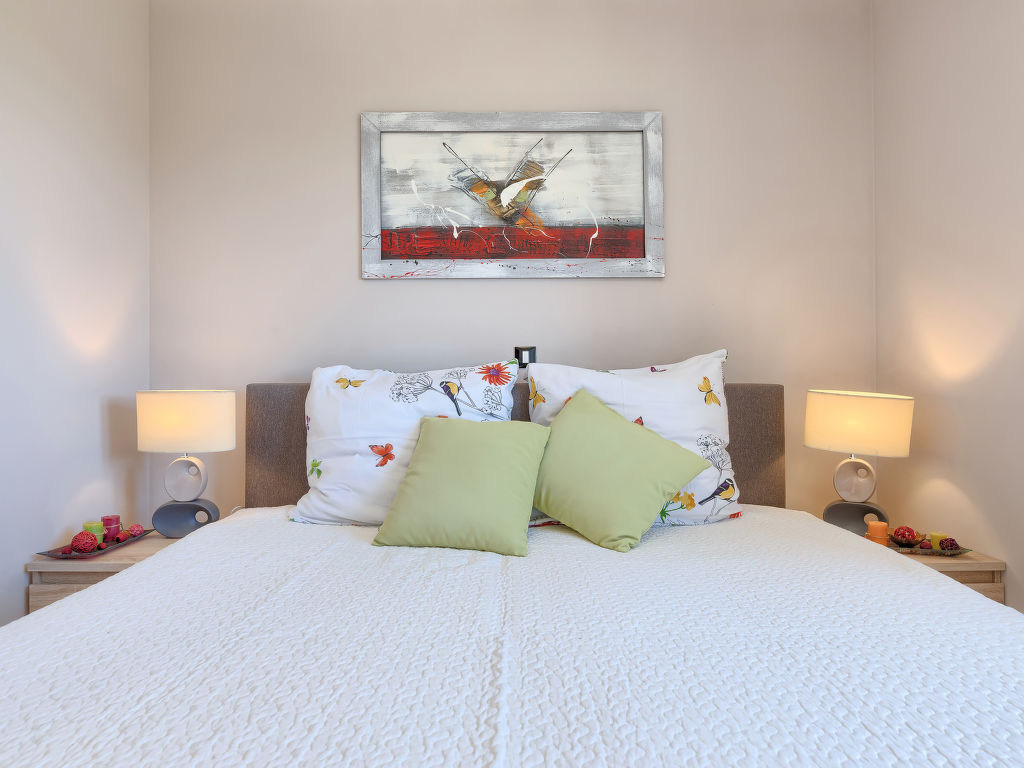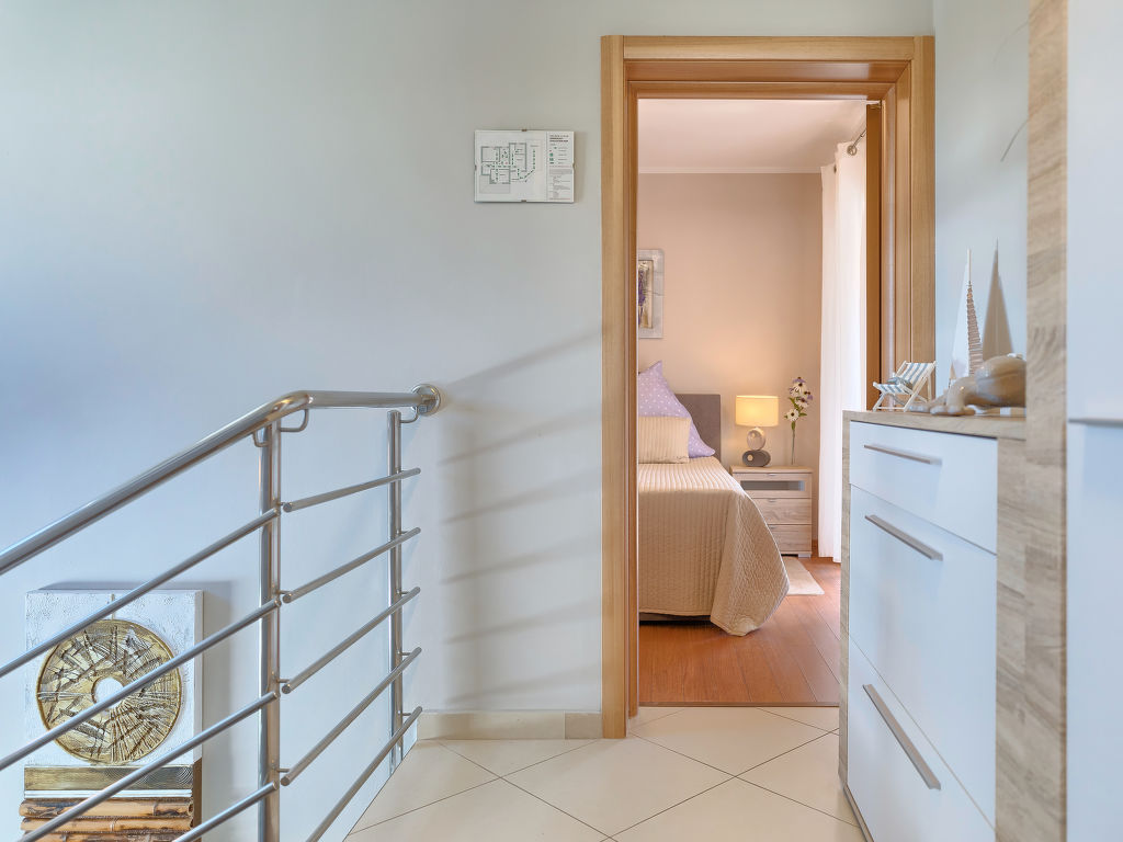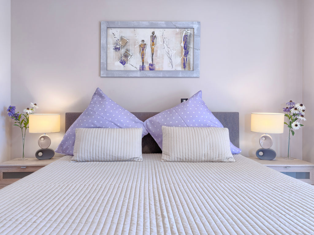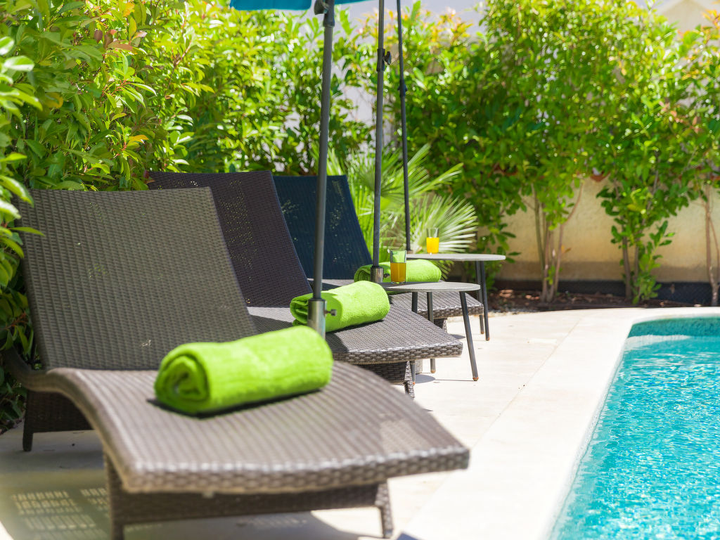 4-Zimmer-Haus 145 m2 auf 2 Stockwerken. Schön und geschmackvoll eingerichtet: Wohn-/Esszimmer mit Sat-TV (Flachbildschirm), DVD und Klimaanlage. Ausgang zur Terrasse. Offene Küche (Backofen, Geschirrspüler, 4 Glaskeramikherd Platten, Mikrowelle, Tiefkühler, elektrische Kaffeemaschine). Sep. WC. Obergeschoss: Eingang mit Klimaanlage. 1 Zimmer mit 1 Doppelbett (2 x 90 cm, Länge 200 cm), Bad/WC. Ausgang zur Terrasse. 2 Zimmer, jedes Zimmer mit 1 Doppelbett (2 x 90 cm, Länge 200 cm). Dusche/WC. Warmluftheizung. Terrasse 10 m2, überdacht, Terrasse 20 m2 teilweise überdacht. Terrassenmöbel, Liegestühle. Sicht auf den Garten. Zur Verfügung: Safe, Haartrockner. Internet (Wireless LAN, gratis). 1 Haustier/Hund erlaubt.