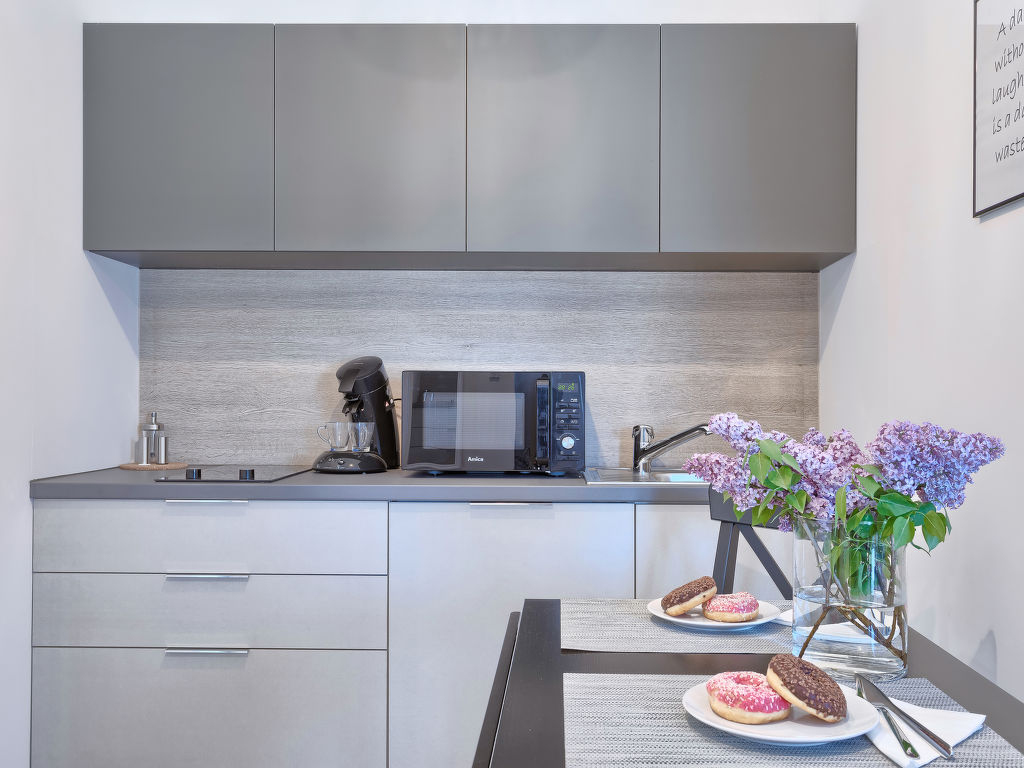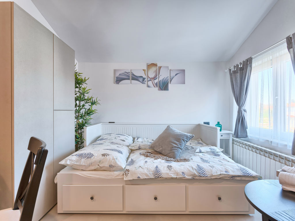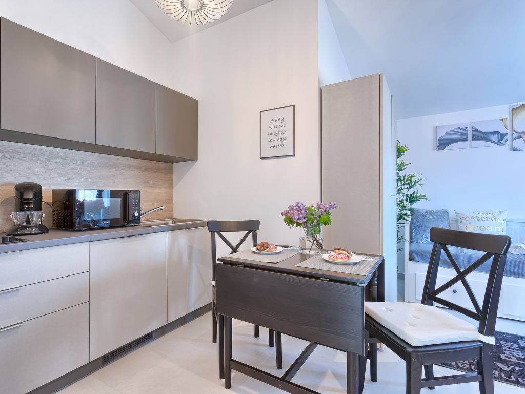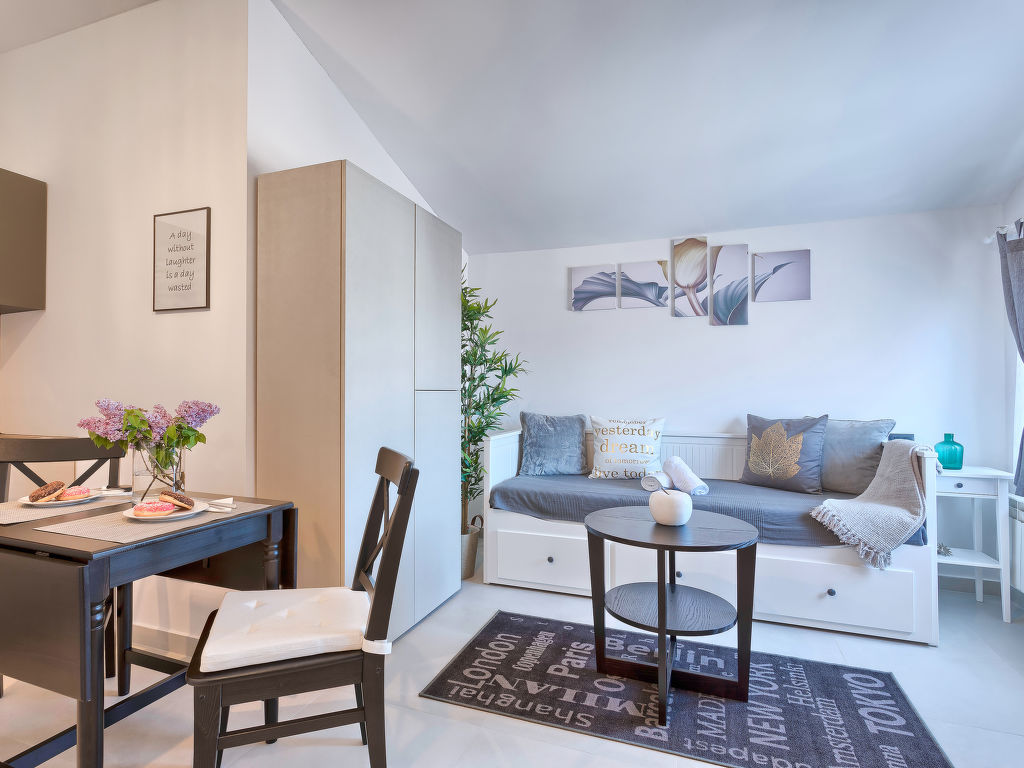 1-Zimmer-Wohnung 35 m2 im 1. Stock. Studio mit 1 Ausziehbett (2 Pers. 2 x 80 cm, Länge 200 cm), Sat-TV (Flachbildschirm), Klimaanlage. Offene Küche (2 Glaskeramikherd Platten, Mikrowelle, elektrische Kaffeemaschine) mit Esstisch. Dusche/WC. Warmluftheizung. Zur Verfügung: Internet (Wireless LAN, gratis).